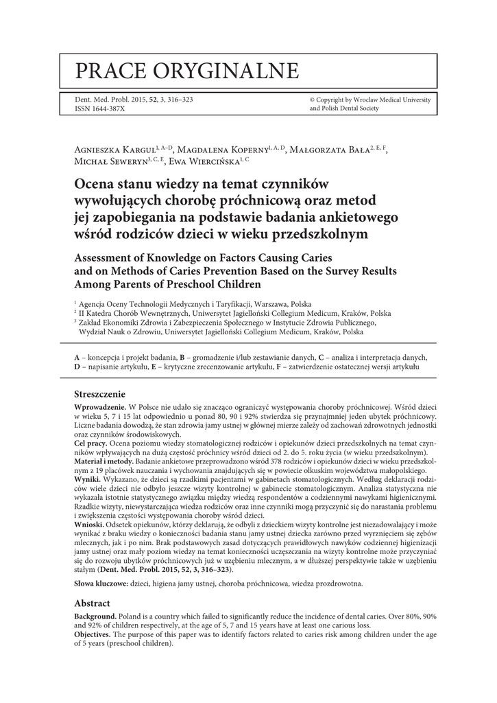 PRACE ORYGINALNE Dent. Med. Probl. 2015, 52, 3, 316–323 ISSN 1644-387X © Copyright by Wroclaw Medical University and Polish Dental Society Agnieszka Kargul1, A–D, Magdalena Koperny1, A, D, Małgorzata Bała2, E, F, Michał Seweryn3, C, E, Ewa Wiercińska1, C Ocena stanu wiedzy na temat czynników wywołujących chorobę próchnicową oraz metod jej zapobiegania na podstawie badania ankietowego wśród rodziców dzieci w wieku przedszkolnym Assessment of Knowledge on Factors Causing Caries and on Methods of Caries Prevention Based on the Survey Results Among Parents of Preschool Children Agencja Oceny Technologii Medycznych i Taryfikacji, Warszawa, Polska II Katedra Chorób Wewnętrznych, Uniwersytet Jagielloński Collegium Medicum, Kraków, Polska 3 Zakład Ekonomiki Zdrowia i Zabezpieczenia Społecznego w Instytucie Zdrowia Publicznego, Wydział Nauk o Zdrowiu, Uniwersytet Jagielloński Collegium Medicum, Kraków, Polska 1 2 A – koncepcja i projekt badania, B – gromadzenie i/lub zestawianie danych, C – analiza i interpretacja danych, D – napisanie artykułu, E – krytyczne zrecenzowanie artykułu, F – zatwierdzenie ostatecznej wersji artykułu Streszczenie Wprowadzenie. W Polsce nie udało się znacząco ograniczyć występowania choroby próchnicowej. Wśród dzieci w wieku 5, 7 i 15 lat odpowiednio u ponad 80, 90 i 92% stwierdza się przynajmniej jeden ubytek próchnicowy. Liczne badania dowodzą, że stan zdrowia jamy ustnej w głównej mierze zależy od zachowań zdrowotnych jednostki oraz czynników środowiskowych. Cel pracy. Ocena poziomu wiedzy stomatologicznej rodziców i opiekunów dzieci przedszkolnych na temat czynników wpływających na dużą częstość próchnicy wśród dzieci od 2. do 5. roku życia (w wieku przedszkolnym). Materiał i metody. Badanie ankietowe przeprowadzono wśród 378 rodziców i opiekunów dzieci w wieku przedszkolnym z 19 placówek nauczania i wychowania znajdujących się w powiecie olkuskim województwa małopolskiego. Wyniki. Wykazano, że dzieci są rzadkimi pacjentami w gabinetach stomatologicznych. Według deklaracji rodziców wiele dzieci nie odbyło jeszcze wizyty kontrolnej w gabinecie stomatologicznym. Analiza statystyczna nie wykazała istotnie statystycznego związku między wiedzą respondentów a codziennymi nawykami higienicznymi. Rzadkie wizyty, niewystarczająca wiedza rodziców oraz inne czynniki mogą przyczynić się do narastania problemu i zwiększenia częstości występowania choroby wśród dzieci. Wnioski. Odsetek opiekunów, którzy deklarują, że odbyli z dzieckiem wizyty kontrolne jest niezadowalający i może wynikać z braku wiedzy o konieczności badania stanu jamy ustnej dziecka zarówno przed wyrznięciem się zębów mlecznych, jak i po nim. Brak podstawowych zasad dotyczących prawidłowych nawyków codziennej higienizacji jamy ustnej oraz mały poziom wiedzy na temat konieczności uczęszczania na wizyty kontrolne może przyczyniać się do rozwoju ubytków próchnicowych już w uzębieniu mlecznym, a w dłuższej perspektywie także w uzębieniu stałym (Dent. Med. Probl. 2015, 52, 3, 316–323). Słowa kluczowe: dzieci, higiena jamy ustnej, choroba próchnicowa, wiedza prozdrowotna. Abstract Background. Poland is a country which failed to significantly reduce the incidence of dental caries. Over 80%, 90% and 92% of children respectively, at the age of 5, 7 and 15 years have at least one carious loss. Objectives. The purpose of this paper was to identify factors related to caries risk among children under the age of 5 years (preschool children). 317 Wiedza rodziców na temat próchnicy u dzieci Material and Methods. The study evaluates knowledge of parents or caregivers on oral health from Olkusz District in Małopolska Region. The survey was conducted among 378 parents and caregivers of preschool children (3–5 years) from 19 kindergartens. Results. The authors reported that children are rare patients in dental offices. A high percentage of respondents have not visited a dentist yet. Statistical analysis showed no statistically significant relationship between knowledge on daily hygiene habits. Irregular or no dental visits, lack of knowledge on dental needs and other factors are the main causes of increased caries prevalence in children. Conclusions. Only a small number of caregivers reported that they had visited a dentist with a child, and this may result from parental ignorance about the need to examine the child’s mouth before and after the eruption of primary teeth. The lack of basic principles concerning the proper rules regarding daily dental care as well as little knowledge on the need to attend follow-up visits may, in the long term, contribute to the development of cavities already in primary dentition, and then in permanent teeth (Dent. Med. Probl. 2015, 52, 3, 316–323). Key words: children, oral hygiene, dental caries, oral health-related knowledge. Na przestrzeni lat obserwuje się zwiększenie intensywności i frekwencji występowania choroby próchnicowej. Rozwój zmiany próchnicowej jest uwarunkowany brakiem lub nieregularnymi wizytami w gabinecie stomatologicznym, nieprawidłową higienizacją jamy ustnej, a także dietą bogatą w węglowodany. Choroba próchnicowa obecnie stanowi istotny problem cywilizacyjny, o czym świadczy jej rozpowszechnienie w społeczeństwie zarówno wśród osób dorosłych, jak i przede wszystkim dzieci. Wyniki badań epidemiologicznych przeprowadzonych w kraju w 2012 r. w ramach ogólnopolskiego Monitoringu Zdrowia Jamy Ustnej wykazały, że odsetek dzieci 6-letnich, u których stwierdzono próchnicę lub brak zęba z powodu próchnicy wynosił 85,6%, a 64,4% ma 4 i więcej zębów zniszczonych przez próchnicę, z czego aż 37,6% ma 7 i więcej zębów objętych tą chorobą [1]. Kształtowanie prawidłowych nawyków higienicznych u najmłodszych dzieci powinno być nierozłącznie związane z podnoszeniem świadomości u ich rodziców 