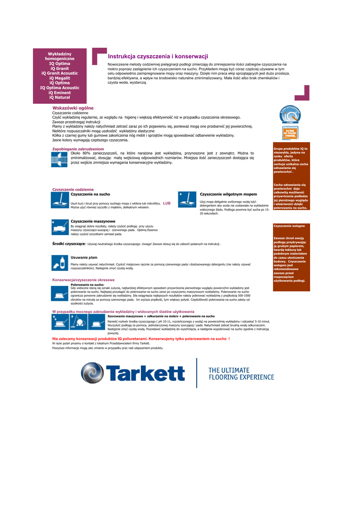 Wykładziny homogeniczne IQ Optima iQ Granit iQ Granit Acoustic iQ Megalit iQ Optima IQ Optima Acoustic iQ Eminent iQ Natural Instrukcja czyszczenia i konserwacji Nowoczesne metody codziennej pielęgnacji podłogi zmierzają do zmniejszenia ilości zabiegów czyszczenia na mokro poprzez zastąpienie ich czyszczeniem na sucho. Przykładem mogą być coraz częściej używane w tym celu odpowiednio zaimpregnowane mopy oraz maszyny. Dzięki nim praca ekip sprzątających jest dużo prostsza, bardziej efektywna, a wpływ na środowisko naturalne zminimalizowany. Mała ilość albo brak chemikaliów i czysta woda, wystarczą. Wskazówki ogólne Czyszczenie codzienne Czyść wykładzinę regularnie, ze względu na higienę i większą efektywność niż w przypadku czyszczenia okresowego. Zawsze przestrzegaj instrukcji Plamy z wykładziny należy natychmiast zetrzeć zaraz po ich pojawieniu się, ponieważ mogą one przebarwić jej powierzchnię. Niektóre rozpuszczalniki mogą uszkodzić wykładziny elastyczne Kółka z czarnej gumy lub gumowe zakończenia nóg mebli i sprzętów mogą spowodować odbarwienie wykładziny. Jasne kolory wymagają częstszego czyszczenia. Zapobieganie zabrudzeniom Około 80% zanieczyszczeń, na które narażona jest wykładzina, przynoszone jest z zewnątrz. Można to zminimalizować, stosując matę wejściową odpowiednich rozmiarów. Mniejsza ilość zanieczyszczeń dostająca się przez wejście zmniejsza wymagania konserwacyjne wykładziny. Czyszczenie codzienne Czyszczenie na sucho Czyszczenie wilgotnym mopem Usuń kurz i brud przy pomocy suchego mopa z włókna lub mikrofibry. Można użyć również szczotki z miękkim, delikatnym włosiem. LUB Użyj mopa deligatnie zwilżonego wodą lub/i detergentem aby woda nie zostawiała na wykładzinie widocznego śladu. Podłoga powinna być sucha po 1520 sekundach. Grupa produktów iQ to niezwykła, jedyna na rynku oferta produktów, które cechuje unikalna cecha odnawiania się powierzchni . Cecha odnawiania się powierzchni daje calkowitą możliwość przywrócenia podłodze jej pierotnego wyglądu i właściwości dzięki polerowaniu na sucho. Czyszczenie maszynowe By osiągnąć dobre rezultaty, należy czyścić podłogę przy użyciu maszyny czyszcząco-suszącej i czerwonego pada. Optimę Essence należy czyścić szczotkami zamiast pada. Środki czyszczące: Używaj neutralnego środka czyszczącego. Uwaga! Zawsze stosuj się do zaleceń podanych na instrukcji . Usuwanie plam Plamy należy usuwać natychmiast. Czyścić miejscowo ręcznie za pomocą czerwonego pada i dostosowanego detergentu (nie należy używać rozpuszczalników). Następnie zmyć czystą wodą. Konserwacja/czyszczenie okresowe NIE MA KONIECZNOŚCI AKRYLOWANIA PODŁOGI ! Polerowanie na sucho: Gdy widoczne staną się oznaki zużycia, najbardziej efektywnym sposobem przywrócenia pierwotnego wyglądu powierzchni wykładziny jest polerowanie na sucho. Najlepiej przystąpić do polerowania na sucho zaraz po czyszczeniu maszynowym wykładziny. Polerowanie na sucho ogranicza ponowne zabrudzenie się wykładziny. Dla osiągnięcia najlepszych rezultatów należy polerować wykładzinę z prędkością 500-1000 obrotów na minutę za pomocą czerwonego pada. Im wyższa prędkość, tym większy połysk. Częstotliwość polerowania na sucho zależy od szybkości zużycia. W przypadku mocnego zabrudzenia wykładziny i widocznych śladów użytkowania Szorowanie maszynowe + odkurzanie na mokro + polerowanie na sucho Nanieść roztwór środka czyszczącego ( pH 10-11, rozcieńczonego z wodą) na powierzchnię wykładziny i odczekać 5-10 minut. Wyczyścić podłogę za pomocą jednotarczowej maszyny szorującej i pada. Natychmiast zebrać brudną wodę odkurzaczem. Następnie zmyć czystą wodą. Pozostawić wykładzinę do wyschnięcia, a następnie wypolerować na sucho zgodnie z instrukcją powyżej. Nie zalecamy konserwacji produktów IQ poliuretanami. Konserwujemy tylko polerowaniem na sucho ! W razie pytań prosimy o kontakt z lokalnym Przedstawicielem firmy Tarkett. Powyższe informacje mogą ulec zmianie w przypadku prac nad ulepszeniem produktu. Czyszczenie wstępne Zawsze chroń swoją podłogę przykrywając ją grubym papierem, twardą tekturą lub podobnym materiałem do czasu ukończenia budowy. Czyszczenie wstępne jest rekomendowane zawsze przed rozpoczęciem użytkowania podłogi.