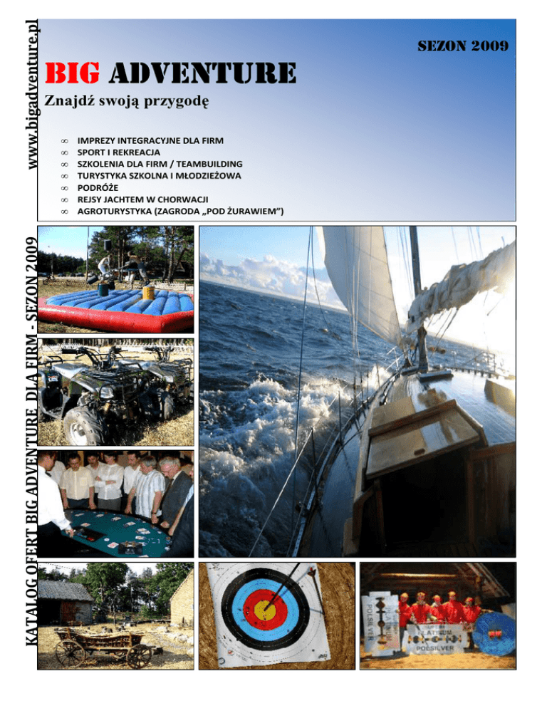 www.bigadventure.pl KATALOG OFERT BIG ADVENTURE DLA FIRM - SEZON 2009 SEZON 2009 BIG ADVENTURE Znajdź swoją przygodę • • • • • • • IMPREZY INTEGRACYJNE DLA FIRM SPORT I REKREACJA SZKOLENIA DLA FIRM / TEAMBUILDING TURYSTYKA SZKOLNA I MŁODZIEŻOWA PODRÓŻE REJSY JACHTEM W CHORWACJI AGROTURYSTYKA (ZAGRODA „POD ŻURAWIEM”) WIECZÓR „CASINO ROYAL” W ofercie proponujemy Państwu spędzenie miłego wieczoru biorąc udział w programie „Casino Royal” . Zabawę można przeprowadzić w dowolnym miejscu (hotel, restauracja, pub czy klub lub też miejsce wskazane przez Klienta). Dzięki krupierom uczestnicy kasyna poznają zasady gry, jednocześnie świetnie się bawiąc. Oferowane gry to: Ruletka - zadaniem gracza w grze „ruletka” jest odgadnięcie jaki będzie wynik rzutu krupiera kulką poruszającą się po wirującym kole ruletki. Gracze stawiają swoje zakłady w grze ruletka zazwyczaj zgodnie ze swoim przeczuciem. Szeroki wybór możliwości robienia zakładów stanowi prawdziwą esencję gry w ruletkę. Black Jack - jest jedną z najpopularniejszych gier w karty występującą w kasynach na całym świecie. Gra toczy się przeciwko krupierowi. Celem gry jest uzyskanie w otrzymanych kartach sumy nie przekraczającej 21 oczek i wyższej niż wartość kart krupiera. Poker Klubowy - gra będąca symbolem hazardu. U nas rozgrywana pomiędzy graczami w klasycznej, pięciokartowej wersji. O zwycięstwie decyduje siła karty, ale także... umiejętność blefowania i stalowe nerwy. KOSZT CAŁEGO ZESTAWU TO: 3000 ZŁ (W ZESTAWIE TANIEJ) Istnieje możliwość zamówienia wyłącznie stołu do Ruletki, Black Jack’a czy pokera. Ruletka wraz z obsługą: 1500 zł Black Jack w wraz z obsługą: 1400 zł Stolik do pokera: 500 zł Do ceny wynajmu poszczególnych punktów programu należy doliczyć koszty transportu (Koszt: 100 zł) – do 50 km. Powyżej 50 km – doliczana jest stawka za km (1.8 zł/km) Kontakt z organizatorem: Stowarzyszenie K.T.N. „BigAdventure” Tel.kom: (+48)607867082, e-mail: [email protected] Z naszej oferty (Casino Royal) korzystały m.in. już takie firmy jak: Brzeziny - Październik 2007 r. Impreza integracyjna dla WC Serwis Duszniki Zdrój - Luty 2008 r. Eurobank – szkolenia dla managerów + impreza integracyjna Antonin – Maj 2008 r. Aereco – impreza integracyjna Pełna galeria na stronie: www.bigadventure.pl Podczas imprez w stylu „Casino Royal” uczestnikom gry zapewniamy: • • • • Obsługę i pomoc krupiera podczas zabawy Nagrody dla najlepszego gracza Drobne upominki i pamiątki dla pozostałych graczy Rekwizyty i akcesoria potrzebne do gry Na specjalne życzenie klienta istnieje możliwość zorganizowania wieczoru „Casino” o rozbudowanej fabule. Program „Viva Las Vegas” realizowany jest z odpowiednim rozmachem, specjalną oprawą , scenografią, sprzętem i obsługą do imprez tematycznych. Koszty realizacji programu uzależnione od wymagań klienta. Na życzenie klienta wysyłamy pełen kosztorys imprezy. Poza tym w programach tematycznych znajdziecie Państwo: • • • • Noc z Bondem Copa Cabana Euro Show Gorączka weekendowej nocy Zapraszamy Istnieje możliwość zorganizowania turnieju w elektronicznego „Darta”. Zasady gry: Gra w Darta polega na rzucaniu lotkami do specjalnie utworzonej tarczy z wieloma polami, za każdy rzut gracz otrzymuje określoną liczbę punktów (w zależności w jakie pole na tarczy trafił). A zwycięża ta osoba która uzbiera dokładnie określoną liczbę punktów (nie mniej, ani więcej). Najpopularniejsza systemy gry to: • • • • • • 301 501 501 2 KO Double In Round the clock Cricket Zapewniamy profesjonalny sprzęt (elektroniczne tarcze) do gier wraz z wyposażeniem technicznym i instruktarzem do gry. Nad zasadami zabawy (gry) czuwa (sędzia) instruktor, który służy pomocą podczas turnieju. Koszty turnieju: 90 zł za 1 godz. zajęć – 1 stanowisko 50 zł – opieka sędziego /1 h Kontakt z organizatorem: Stowarzyszenie K.T.N. „BigAdventure” Tel.kom: (+48)607867082, e-mail: [email protected] Proponujemy zabawę w „KARAOKE” , która bije rekordy popularności w lokalach, pubach, restauracjach, podczas imprez integracyjnych dla firm a nawet wśród imprez dla dzieci i młodzieŜy. W programie: • Najpopularniejsze piosenki polskie i zagraniczne • Konkursy muzyczne • Konkursy muzyki filmowej • Drobne upominki i nagrody dla zwycięzców • DuŜo dobrej zabawy Poza tym w programie: • Gry i zabawy ruchowe (indywidualne i grupowe) • Prowadzenie/wodzirej/ Koszt: 950 zł W cenie zawarta jest: • Realizacja programu • Obsługa i prowadzenie • Nagłośnienie • Obsługa techniczna (rzutnik multimedialny/komputer/oprogramowanie/ekran) • Transport do 50 km / PowyŜej 50 km – naliczana jest stawka za km (1,8 zł/1km) Oprócz „Karaoke” zapraszamy do skorzystania z usług naszego DJ, który profesjonalnie poprowadzi kaŜdą imprezę muzyczną wraz z konkursami muzycznymi, przeplatanymi grami i zabawami podczas przerw muzycznych. Koszt: 950 zł W cenie • • • • • • zawarta jest: Realizacja programu (5 h dobrej muzyki), kaŜda przedłuŜona godzina to dodatkowe 160 zł Obsługa i prowadzenie Gry i zabawy podczas przerw muzycznych (konkursy/turniej wiedzy muzycznej) Nagłośnienie własne Obsługa techniczna Transport do 50 km / PowyŜej 50 km – naliczana jest stawka za km (1,8 zł/1km) Kontakt z organizatorem: Stowarzyszenie K.T.N. „BigAdventure” Tel.kom: (+48)607867082, e-mail: [email protected] „FLAIR BARTENDER SHOW” – zapraszamy na pokaz barmański „Flair” - to kompleksowa obsługa imprez w zakresie baru wykonywane przez mistrza świata Eugeniusza Dytko. Oferta obejmuje: • • Obsługa całych imprez od ustalenia listy alkoholi, coctaili do ich przygotowania w efektowny sposób. Przygotowujemy dla grup "WIECZÓR Z BAREM" o pokazy barmańskie o konkursy z nagrodami o prezentacje kilku ciekawych drinków