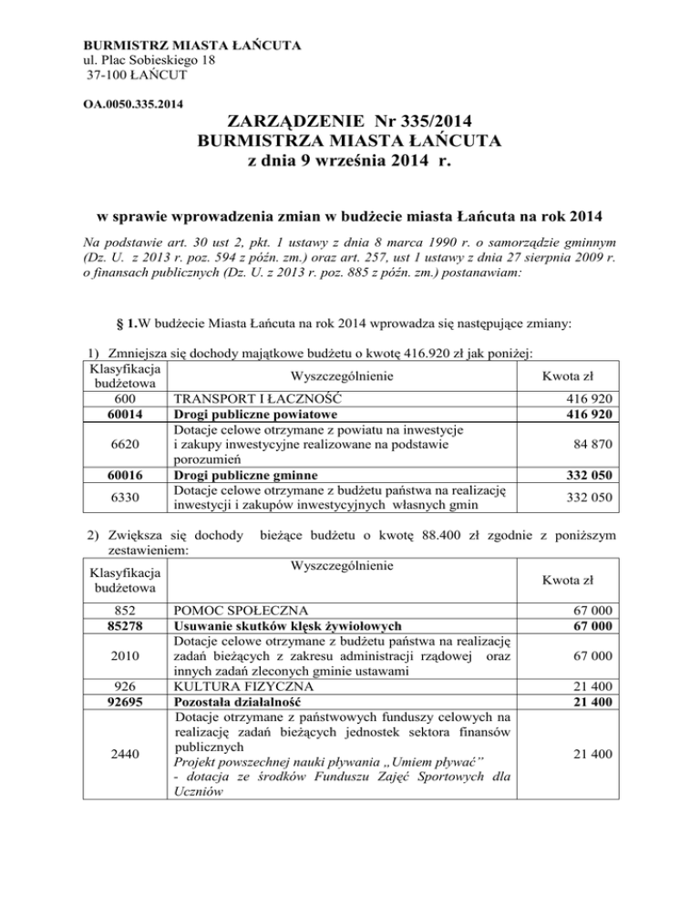 ZARZĄDZENIE Nr 335/2014 BURMISTRZA MIASTA ŁAŃCUTA z