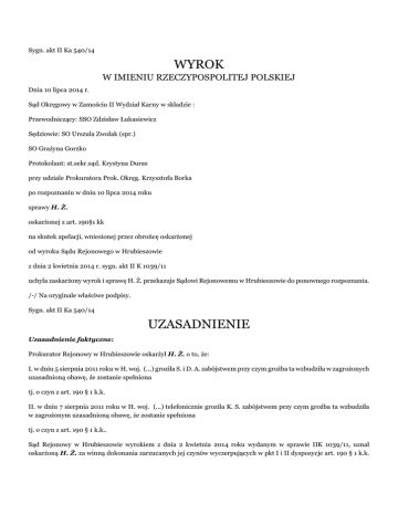 Sygn. akt II Ka 540/14 WYROK W IMIENIU RZECZYPOSPOLITEJ POLSKIEJ Dnia 10 lipca 2014 r. Sąd Okręgowy w Zamościu II Wydział Karny w składzie : Przewodniczący: SSO Zdzisław Łukasiewicz Sędziowie: SO Urszula Zwolak (spr.) SO Grażyna Gorzko Protokolant: st.sekr.sąd. Krystyna Duras przy udziale Prokuratora Prok. Okręg. Krzysztofa Borka po rozpoznaniu w dniu 10 lipca 2014 roku sprawy H. Ż. oskarżonej z art. 190§1 kk na skutek apelacji, wniesionej przez obrońcę oskarżonej od wyroku Sądu Rejonowego w Hrubieszowie z dnia 2 kwietnia 2014 r. sygn. akt II K 1039/11 uchyla zaskarżony wyrok i sprawę H. Ż. przekazuje Sądowi Rejonowemu w Hrubieszowie do ponownego rozpoznania. /-/ Na oryginale właściwe podpisy. Sygn. akt II Ka 540/14 UZASADNIENIE Uzasadnienie faktyczne: Prokurator Rejonowy w Hrubieszowie oskarżył H. Ż. o to, że: I. w dniu 5 sierpnia 2011 roku w H. woj. (...) groziła S. i D. A. zabójstwem przy czym groźba ta wzbudziła w zagrożonych uzasadnioną obawę, że zostanie spełniona tj. o czyn z art. 190 § 1 k.k. II. w dniu 7 sierpnia 2011 roku w H. woj. (...) telefonicznie groziła K. S. zabójstwem przy czym groźba ta wzbudziła w zagrożonym uzasadnioną obawę, że zostanie spełniona tj. o czyn z art. 190 § 1 k.k.. Sąd Rejonowy w Hrubieszowie wyrokiem z dnia 2 kwietnia 2014 roku wydanym w sprawie IIK 1039/11, uznał oskarżoną H. Ż. za winną dokonania zarzucanych jej czynów wyczerpujących w pkt I i II dyspozycje art. 190 § 1 k.k. i za to, na podstawie art. 190 § 1 k.k. w zw. z art. 91 § 1 k.k. za czyny z punktu I i II ustalając, że czyny stanowią ciąg przestępstw orzekł wobec oskarżonej H. Ż. karę 6 miesięcy pozbawienia wolności; na podstawie art. 69 § 1 i 2 k.k. w zw. z art. 70 § 1 pkt 1 k.k. orzeczoną wobec oskarżonej karę pozbawienia wolności warunkowo zawiesił na okres 2 lat tytułem próby; zasądził od Skarb Państwa na rzecz adw. P. W. kwotę 2391,12 zł tytułem nieopłaconych kosztów obrony udzielonej z urzędu; na podstawie art. 624 § 1 k.p.k. zwolnił oskarżoną z obowiązku ponoszenia kosztów sądowych. Apelację od tego wyroku wniósł obrońca oskarżonej. Na podstawie art. 425 i art. 444 k.p.k. zaskarżył wyrok w całości, zaś na podstawie art. 427 § 2 k.p.k. i art. 438 pkt 1 k.p.k. wyrokowi zarzucił: 1). naruszenie prawa materialnego – art. 190 k.k. przez uznanie, że wypowiedzi oskarżonej wypełniały znamiona tego przepisu ustawy karnej, gdy przeczą temu dowody; 2). naruszenie prawa procesowego – art. 424 § 1 pkt 2 k.p.k. przez wskazanie wadliwej podstawy prawnej wyroku w zakresie orzeczonej kary/orzeczona kara pozbawienia wolności, uzasadnienie dotyczy innej kary niż orzeczona, nie było przy tym zatrzymania oskarżonej, o czym pisze Sąd w uzasadnieniu. Podnosząc te zarzuty skarżący wnosił o: 1). zmianę wyroku przez uniewinnienie oskarżonej od dokonania zarzucanego jej czynu lub 2). uchylenie zaskarżonego wyroku i przekazanie sprawy do ponownego rozpoznania przez Sąd I instancji. Uzasadnienie prawne: Sąd Okręgowy zważył, co następuje: Apelacja jest zasadna w zakresie wniosku o uchylenie zaskarżonego wyroku i przekazania sprawy do ponownego rozpoznania przez Sąd I instancji, również częściowo trafny jest zarzut 2 podnoszący naruszenie prawa procesowego w zakresie art. 424 § 1 k.p.k.. Wobec konieczności uchylenia wyroku, zarzut sformułowany w pkt 1). apelacji staje się przedwczesny, zaś winien być przyczynkiem do szerszej analizy przez ponownie orzekający Sąd Rejonowy co do zaistnienia znamion występku z art. 190 § 1 k.k.. Trafność zarzutu ujętego w pkt 2 apelacji jest niemal oczywista, chociaż w treści tego zarzutu skarżący nie wskazał wszystkich uchybień zaistniałych w uzasadnieniu wyroku, przede wszystkim nie podniósł tych błędów, które są poważniejsze, niż to, które stało się kanwą zarzutu. Gdyby uchybienia uzasadnienia wyroku sprowadzały się jedynie do zarzutu podniesionego w punkcie 2 apelacji, to Sąd Okręgowy miałby możliwość korekty odwoławczej samego uzasadnienia we wskazanej części, bowiem: Nie zawsze istnienie sprzeczności pomiędzy treścią wyroku a uzasadnieniem powoduje niemożność skontrolowania wyroku i wywołuje konieczność jego uchylenia. Potrzeba taka może nie zachodzić, gdy zebrany materiał dowodowy pozwala w sposób jednoznaczny na rozstrzygnięcie, które ze sprzecznych stanowisk sądu pierwszej instancji, wyrażonych w wyroku i jego uzasadnieniu, zasługuje na uwzględnienie. (wyrok SA w Lublinie z dnia 31 lipca 2013 r., II AKa 129/13, opubl. LEX nr 1350398). W myśl przytoczonego powyżej judykatu, nie wszystkie uchybienia pisemnego uzasadnienia wyroku, które jest wszak sporządzane po jego wydaniu i ze swej procesowej funkcji ma charakter sprawozdawczy, powodować muszą konieczność uchylania zaskarżonego orzeczenia. Apelacja wniesiona w niniejszej sprawie w swej treści zbyt płytko wyeksponowała zaistniałe uchybienia. W niniejszej sprawie rozległość uchybień i braki w zakresie dowodowym doprowadziły do uchylenia wyroku i przekazania sprawy do ponownego rozpoznania. Analiza treści uzasadnienia wyroku wskazuje, że sposób jego sporządzenia nie uwzględnia wymagań jakie nakłada na Sąd przepis art. 424 § 1 pkt 1 k.p.k. w zakresie dokonania ustaleń faktycznych, ponieważ ustalenia faktyczne, jakich wymaga art. 424 § 1 pkt. 1 k.p.k., to jednoznaczne wskazanie konkretnych zachowań w tym przypadku oskarżonej, korespondujących z opisem czynów jej przypisanych, poprzez które zrealizowane zostały przedmiotowo - podmiotowe znamiona przypisanych jej przestępstw. Sąd Okręgowy w tym zakresie podziela poniższe stanowisko: "Ustalenia faktyczne", o których mowa w art. 424 § 1 pkt 1 k.p.k., to jednoznaczne wskazanie konkretnych zachowań oskarżonego, korespondujących z opisem czynu przypisanego, poprzez które zrealizowane zostały przedmiotowe i podmiotowe znamiona przypisanego 