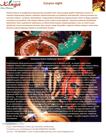 Casyno night Imprezy kasyno to wyjątkowa propozycja dla wszystkich tych, którzy pragną spędzić niebanalny wieczór na imprezie integracyjnej, pikniku, spotkaniu okolicznościowym czy spotkaniu kontrahentów. Impreza firmowa nie musi być nudnym i przykrym obowiązkiem. Zorganizujemy klimatyczną imprezę kasyno, która na długo zapadnie w pamięci pracowników. Cała zabawa odbywa się bez ryzyka utraty gotówki - używamy wyłącznie falsyfikatów banknotów, które są graficznie stylizowane na klimat danej imprezy. Należy pamiętać o tym, że celem naszej działalności nie jest promowanie hazardu. Nasz sprzęt i usługi służą tylko i wyłącznie dobrej zabawie i stworzeniu klimatu przypominającego zabawę w prawdziwym kasynie. Scenariusz Rodzin Mafijnych/ Wieczór tematyczny Przedstawiamy ofertę eventu przeznaczonego dla Państwa Gości w klimacie lat 20’ , w czasach rządów rodzin mafijnych. Impreza oparta będzie na pomyśle zaaranżowania Kasyna z tamtej epoki, rywalizacji rodzin poprzez zabawę w kasynie oraz konkursy zręcznościowe. Do dyspozycji gości oddajemy profesjonalne kasyno obsługiwane przez zawodowych uśmiechniętych krupierów lub piękne krupierki w uniformach z kasyna. Dreszczyk emocji, walka o najwyższe zarobki i rodzinny puchar oraz butelka markowego alkoholu gwarantują świetną zabawę i niebanalną rozrywkę. Całość imprezy prowadzi znakomity konferansjer, który ma również w kieszeni licencję krupierską. Dzięki temu doskonale, będzie poruszał się w materii związanej z wszystkimi prezentowanymi grami kasynowymi. Na początku podzielimy gości na rodziny mafijne, wyłonieni zostaną ojcowie chrzestni oraz kreatywne księgowe mafii, a od nazw produktów stworzone zostaną nazwiska rodowe rodzin. Rozdamy kapelusze w różnych kolorach dla członków rodzin oraz koperty z identyczną ilością gotówki dla każdego z nich. Zadaniem będzie przez całą drugą część zabawy, jak najbardziej ją rozmnożyć w kasynie oraz konkursach. Na wszystkich stołach przez pierwszą część imprezy, goście będą poznawać zasady gry, krupierzy będą tłumaczyć reguły, opowiadać historie o pracy w kasynie oraz o tym wszystkim co związane jest z branżą hazardową. W między czasie konferansjer przeprowadzi kilka konkursów zręcznościowych, logicznych takich jak: Al wraca do domu, Walizki pełne kasy, Frank Sinatra i wiele innych, które niech pozostaną naszą tajemnicą... W każdym konkursie można oczywiście wygrać gotówkę, którą należy jak najszybciej pomnożyć w kasynie. Dla osób, które w trakcie gry przegrają wszystkie pieniądze prowadzący będzie udzielał „pożyczek” na lichwiarskich warunkach. Na koniec porównane zostaną majątki rodzin i wyłonieni zwycięzcy. Czas trwania takiej animacji to około 3h, po wyłonieniu zwycięskiej rodziny przez kolejne 1,5h kasyno będzie do dyspozycji gości, którzy już indywidualnie będą mogli powalczyć o puchar dla najlepszego hazardzisty wieczoru. Oczywiście przez cały czas trwania imprezy umilać zabawę będzie odpowiednia muzyka, głównie z nurtów jazzu i swingu, a równocześnie na drugiej sali będzie trwała impreza muzyczna z wideo Dj-em. By całość tworzyła efekt prawdziwego Kasyna lat 20’ potrzebnych jest dodatkowo kilka elementów, które do spółki ze stołami hazardowymi stworzą odpowiedni nastrój(cygara, węże boa , kapelusze, standy, roll-up, nastrojowe oświetlenie) Wystrój sali: plakaty, roll-upy, lampy, standy – wszystko związane z latami 20’ oraz kasynem. Kinga | Hotel Wellness ( Hotel, Spa, Ajurweda, Konferencja) Trzy Korony sp.j. Ul.Zamkowa-6, 34-436 CZORSZTYN, POLAND Tel./Fax. + 48 182650367, E.mail: [email protected], www.kingahotel.com
