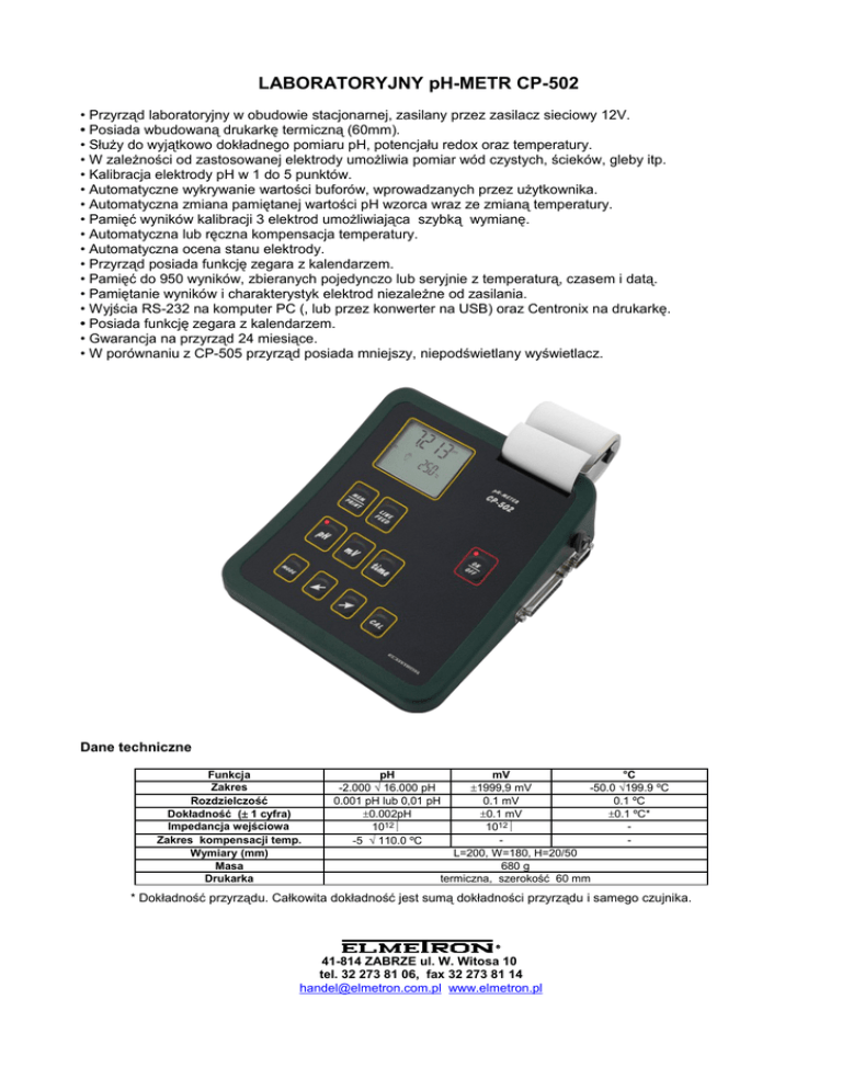 LABORATORYJNY pH-METR CP-502 • Przyrząd laboratoryjny w obudowie stacjonarnej, zasilany przez zasilacz sieciowy 12V. • Posiada wbudowaną drukarkę termiczną (60mm). • Służy do wyjątkowo dokładnego pomiaru pH, potencjału redox oraz temperatury. • W zależności od zastosowanej elektrody umożliwia pomiar wód czystych, ścieków, gleby itp. • Kalibracja elektrody pH w 1 do 5 punktów. • Automatyczne wykrywanie wartości buforów, wprowadzanych przez użytkownika. • Automatyczna zmiana pamiętanej wartości pH wzorca wraz ze zmianą temperatury. • Pamięć wyników kalibracji 3 elektrod umożliwiająca szybką wymianę. • Automatyczna lub ręczna kompensacja temperatury. • Automatyczna ocena stanu elektrody. • Przyrząd posiada funkcję zegara z kalendarzem. • Pamięć do 950 wyników, zbieranych pojedynczo lub seryjnie z temperaturą, czasem i datą. • Pamiętanie wyników i charakterystyk elektrod niezależne od zasilania. • Wyjścia RS-232 na komputer PC (, lub przez konwerter na USB) oraz Centronix na drukarkę. • Posiada funkcję zegara z kalendarzem. • Gwarancja na przyrząd 24 miesiące. • W porównaniu z CP-505 przyrząd posiada mniejszy, niepodświetlany wyświetlacz. Dane techniczne Funkcja Zakres Rozdzielczość Dokładność (± 1 cyfra) Impedancja wejściowa Zakres kompensacji temp. Wymiary (mm) Masa Drukarka pH -2.000 ÷ 16.000 pH 0.001 pH lub 0,01 pH ±0.002pH 1012Ω -5 ÷ 110.0 ºC mV °C ±1999,9 mV -50.0 ÷199.9 ºC 0.1 mV 0.1 ºC ±0.1 mV ±0.1 ºC* 1012Ω L=200, W=180, H=20/50 680 g termiczna, szerokość 60 mm * Dokładność przyrządu. Całkowita dokładność jest sumą dokładności przyrządu i samego czujnika. 41-814 ZABRZE ul. W. Witosa 10 tel. 32 273 81 06, fax 32 273 81 14 [email protected] www.elmetron.pl