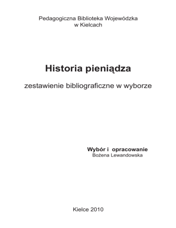 Pedagogiczna Biblioteka Wojewódzka w Kielcach Historia pieniądza zestawienie bibliograficzne w wyborze Wybór i opracowanie Bożena Lewandowska Kielce 2010 2 Historia pieniądza na świecie – wydawnictwa zwarte 1. Bratkowski, Stefan : Nieco inna historia cywilizacji : dzieje banków, bankierów i obrotu pieniężnego / Stefan Bratkowski. – Warszawa : „Nowoczesność”, 2003. – 2. 478 s. Sygn. 243999 Czytelnia 3. Cywiński, Henryk : Pieniądz : przegląd encyklopedyczny / Henryk Cywiński. – Warszawa : „KeyTex”, 1992. – 253 s. – Bibliogr. Sygn. 210832 Czytelnia 4. Cywiński, Henryk : Z dziejów pieniądza na świecie / Henryk Cywiński. – Warszawa : Krajowa Agencja Wydawnicza, 1986. – 174, [2] s. – Bibliogr. Sygn. 188522 Wypożyczalnia 5. Friedman, Milton : Intrygujący pieniądz : z historii systemów monetarnych / Milton Friedman ; przekł. z ang. Krzysztofa Szlichcińskiego. – Łódź : Wydawawnictwo Łódzkie, 1994. – 282,[2] s. – Bibliogr. Sygn. 217313 Czytelnia 6. Galbraith, John Kenneth : Pieniądz : pochodzenie i losy / John Kenneth Galbraith. – Warszawa : Państwowe Wydawnictwo Ekonomiczne, 1982. – 428 s. [Pieniądz w gospodarce amerykańskiej] Sygn. 164217 Wypożyczalnia 7. Kołodziejczyk, Katarzyna : Geneza wspólnej waluty euro / Katarzyna Kołodziejczyk. – Warszawa : Fundacja Studiów Międzynarodowych. – Warszawa : Wydawnictwo Naukowe „Scholar”, 2000. – 145 s. – Bibliogr. Sygn. 230991 Czytelnia 3 8. Oręziak, Leokadia : Euro – nowy pieniądz. – Wyd. 2 popr. i uaktual. – Warszawa : Wydawnictwo Naukowe PWN, 2004. – 169 s. – Bibliogr. Sygn. 238075 Czytelnia 9. Pieniądz i gospodarka pieniężna w starożytności i średniowieczu / red. Andrzej Kunisz. – Katowice : Uniwersytet Śląski, 1979. – 160 s. Sygn. 169395 Wypożyczalnia 10. Salama, Pierre : Dolaryzacja / Pierre Salama. – Kraków : Oficyna Literacka, 1990. – 80 s. Sygn. 212503 Wypożyczalnia 11. Suchodolski, Stanisłąw : Moneta i obrót pieniężny w Europie Zachodniej / Stanisław Suchodolski. – Wrocław : Zakład Narodowy im. Ossolińskich, 1982. – 277 s. – Bibliogr. Sygn. 164302 Wypożyczalnia 12. Wesołowski, Jerzy : System walutowy krajów RWPG / Jerzy Wesołowski. – Warszawa : Państwowe Wydawnictwo Ekonomiczne, 1977. – 303 s. – Bibliogr. Sygn. 137223 Wypożyczalnia 13. Zwass, Adam : Pieniądz dwóch rynków : zarys rozwoju i kierunków reform / Adam Zwass. – Warszawa : Państwowe Wydawnictwo Naukowe, 1968. – 551 s. Sygn. 55117-55119 Wypożyczalnia 14. Żabiński, Zbigniew : Rozwój systemów pieniężnych w Europie Zachodniej i Północnej / Zbigniew Żabiński. – Wrocław [etc.] : Zakład Narodowy im. Ossolińskich, 1989. – 167 s. – Bibliogr. S. Sygn. 202679 Wypożyczalnia 4 Historia pieniądza na świecie – wydawnictwa ciągłe 15. Ferguson, Niall : Wielkie pieniądze – wielkie oszustwa / Niall Ferguson ; rozm. przepr. Alexander Jung, Thomas Schulz // „Forum”. – 2009, nr 51/52, s. 18-20, 22 [Rozmowa z Niallem Fergusonem na temat historii pieniądza] 16. Gadomski, Witold : Gdzie się podziało złoto czyli burzliwe dzieje pieniędzy z papieru / Witold Gadomski // „Gazeta Wyborcza”. – 2001, nr 161, dod. s. 4-11 17. Kalwat, Wojciech : Pieniądz – źródło niedoceniane / Wojciech Kalwat // „Mówią Wieki”. – 2006, nr 03, dod. Mówią Wieki w Szkole nr 2, s. 2-3 [Pieniądz – historia] 18. Kłopotowski, Krzysztof : Jak pieniądz zdobywał władzę nad światem / Krzysztof Kłopotowski // „Wprost”. – 2010, nr 7, s. 32-39 [Dzieje pieniądza : od glinianej tabliczki po obligacje i ubezpieczenia] 19. Lewandowski, Waldemar : Talary, denary, dukaty... : w pogoni za wspólnym pieniądzem / Waldemar Lewandowski // „Tygodnik Powszechny”. – 2009, nr 33, dod. s. VI-VII Historia pieniądza w Polsce – wydawnictwa zwarte 20. Cywiński, Henryk : Dziesięć wieków pieniądza polskiego / Henryk Cywiński. – Wyd. 2 uzup. – lWarszawa : Ludowa Spółdzielnia Wydawnicza, 1987. – 244, [4] s. – Bibliogr. s. 240-243 Sygn. 191528 Wypożyczalnia Sygn. 162093 Czytelnia, 162094 Wypożyczalnia [Wyd. 1 z 1982 r.] 5 21. Karpiński, Zygmunt : Ustroje pieniężne w Polsce od roku 1917 / Zygmunt Karpiński. – Warszawa : Państwowe Wydawnictwo Naukowe, 1968. – 278 s. Sygn. 65854-65855, 55505-55506 Wypożyczalnia 22. Kiersnowski, Ryszard : Pradzieje grosza / Ryszard Kiersnowski. – Warszawa : Wiedza Powszechna, 1975. – 349 s. – Bibliogr. Sygn. 116987-116989 Wypożyczalnia 23. Kiersnowski, Ryszard : Wielka reforma monetarna XIII-XIV w. Cz. 1 / Ryszard Kiersnowski. – Warszawa : Państwowe Wydawnictwo Naukowe, 1969. – 250 s. Sygn. 73995-73996 Wypożyczalnia 24. Kulesza, Juliusz : Reduta PWPW : Polska Wytwórnia Papierów Wartościowych w konspiracji i w Powstaniu Warszawskim / Juliusz Kulesza. – Warszawa : „Pax”, 1989. – 337, [3] s. Sygn. 203755 Wypożyczalnia 25. Mikołajczyk, Andrzej : Obieg pieniężny w Polsce środkowej w wiekach od XVI do XVIII / Andrzej Mikołajczyk. – Wrocław : Zakład Narodowy im. Ossolińskich, 1980 Sygn. 151550 Wypożyczalnia 26. Popioł-Szymańska, Aleksandra : Poglądy monetarne w Polsce od XV do XVIII wieku / Aleksandra Popioł-Szymańska. – Poznań : Uniwersytet im. Adama Mickiewicza, 1978. – 208 s. Sygn. 142731 Wypożyczalnia 27. Reformy Władysława Grabskiego : dokonania i koszty w opiniach współczesnych / wybór, wstęp i oprac. Marian Marek Drozdowski. – Warszawa : Omnia, 1994. – 203 s. Sygn. 220589 Wypożyczalnia 6 28. Rozprawy o pieniądzu w Polsce pierwszej połowy XVII wieku / wybór, wstęp i przypisy Zdzisław Sadowski. – Warszawa : Państwowe Wydawnictwo Naukowe, 1959. – 439 s. Sygn. 47357 Wypożyczalnia 29. Sadowski, Zdzisław : Pieniądz a początki upadku Rzeczypospolitej w XVII wieku / Zdzisłąw Sadowski. – Warszawa : Państwowe Wydawnictwo Naukowe, 358 s. – Bibliogr. Sygn. 36179 Wypożyczalnia 30. System finansowy w Polsce : lat