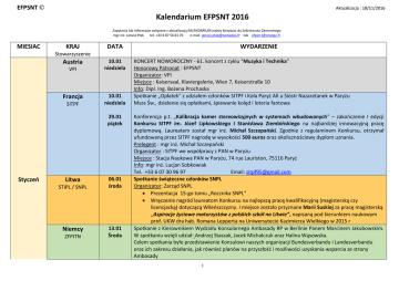 EFPSNT © Aktualizacja : 18/11/2016 Kalendarium EFPSNT 2016 Zapytania lub informacje związane z aktualizacją KALENDARIUM należy kierować do Sekretaratu Generalnego mgr inż. Janusz Ptak tel. +33 6 87 56 81 70 e-mail: [email protected] lub [email protected] MIESIAC KRAJ DATA WYDARZENIE Stowarzyszenie Austria VPI Francja SITPF 10.01 niedziela 10.01 niedziela 29.01 piątek Styczeń Litwa STIPL / SNPL Niemcy ZFPITN 06.01 środa 13.01 Środa KONCERT NOWOROCZNY - 61. koncert z cyklu "Muzyka i Technika" Honorowy Patronat : EFPSNT Organizator: VPI Miejsce : Kaisersaal, Klaviergalerie, Wien 7, Kaiserstraße 10 Info: Dipl. Ing. Bożena Prochaska Spotkanie „Opłatek” z udziałem członków SITPF i Koła Paryż AK u Sióstr Nazaretanek w Paryżu Msza Św., dzielenie się opłatkami, śpiewanie kolęd i loteria fantowa Konferencja p.t. „Kalibracja kamer stereowizyjnych w systemach wbudowanych” – zakończenie I edycji Konkursu SITPF im. Józef Lipkowskiego I Stanisława Ziembińskiego na najbardziej innowacyjną pracę dyplomową. Laureatem został mgr inż. Michał Szczepański. Zgodnie z regulaminem Konkursu, otrzymał ufundowaną przez SITPF nagrodę w wysokości 500 euros oraz okolicznościowy dyplom uznania. Prelegent : mgr inż. Michał Szczepański Organizator : SITPF we współpracy z PAN w Paryżu Miejsce : Stacja Naukowa PAN w Paryżu, 74 rue Lauriston, 75116 Paryż Info: mgr inż. Lucjan Sobkowiak Tel. +33 6 07 30 96 97 Email: [email protected] Spotkanie świąteczne członków SNPL Organizator: Zarząd SNPL Prezentacja 15-go tomu „Rocznika SNPL” Wręczenie nagród laureatom Konkursu na najlepszą pracę kwalifikacyjną (magisterską czy licencjacką) dotyczącą Wileńszczyzny. I miejsce zostało przyznane Marii Suskiej za pracę magisterską „Aspiracje życiowe maturzystów z polskich szkół na Litwie”, napisaną pod kierunkiem naukowym prof. UKW dra hab. Romana Lepperta na Uniwersytecie Kazimierza Wielkiego w 2015 r Spotkanie z Kierownikiem Wydziału Konsularnego Ambasady RP w Berlinie Panem Marcinem Jakubowskim. W spotkaniu wzięli udział: Andrzej Staszak, Jacek Michalczuk oraz Halina Wąsowska. Celem spotkania było przedstawienie Konsulowi naszych organizacji Bundesverbandu i Landesverbandu oraz ich zakresu działania, jak również planów na przyszłość i możliwości uzyskania wsparcia ze strony Ambasady 1 EFPSNT © Aktualizacja : 18/11/2016 Kalendarium EFPSNT 2016 23.01 sobota Wielka Brytania STP 17.01 niedziela Walne Zebranie ZFPITN, w wyniku którego został wyłoniony nowy Zarząd Zrzeszenia w następującym składzie: Andreas Kajzer - Przewodniczycy Ryszard Drapała - Wiceprzewodniczacy Jacek Michalczuk - Wiceprzewodniczacy Marta Goworko - Sekretarz Andrzej Wilczynski - Skarbnik Edward Kieyne - Czlonek Zarzadu Artur Sitko - Czlonek Zarzadu Tradycyjne spotkanie opłatkowo-noworoczne członków i sympatyków STP w Polskim Ośrodku SpołecznoKulturalnym w Londynie. Życzenia noworoczne i dzielenie się opłatkiem, poczęstunek, science stand-up comedy, loteria fantowa i inne niespodzianki, szczególnie dla dzieci Austria VPI Francja SITPF Luty 26.02 piątek Konferencja pt. „Energies renouvelables sans secrets – quelles énergies pour le futur ?” (Energie odnawialne bez tajemnic – jakie energie dla przyszłości ?) Prelegent : mgr inż. Janusz Ptak, Wiceprezes SITPF Organizator : SITPF we współpracy z PAN w Paryżu Miejsce : Stacja Naukowa PAN w Paryżu, 74 rue Lauriston, 75116 Paryż Info: mgr inż. Lucjan Sobkowiak Tel. +33 6 07 30 96 97 Email: [email protected] 25.02 czwartek Czwartek 4YOU - w Sali Malinowej POSKu spotkanie z Katarzyną Murrells (Senior Recruiter at BSV Recruitment). Temat prelekcji: "Polscy inżynierowie na rynku brytyjskim" Organizator : STP w WB Miejsce : Sala Malinowa POSK, Londyn 242 King Street, W6 0RF London Info: mgr Marcin Siliński Tel. +44 7500122948 Email: [email protected] Litwa STIPL / SNPL Niemcy ZFPITN Wielka Brytania STP 2 EFPSNT © Aktualizacja : 18/11/2016 Kalendarium EFPSNT 2016 Austria VPI Francja SITPF 19.03 sobota Walne Zebranie sprawozdawczo-wyborcze SITPF (kwiecień 2015 r. – marzec 2016 r.) Miejsce : Stacja Naukowa PAN w Paryżu, 74 rue Lauriston, 75116 Paryż Info: mgr inż. Lucjan Sobkowiak Tel. +33 6 07 30 96 97 Email: [email protected] Został wybrany nowy Zarząd na kadencję 2016-18: Prezes - mgr inż. Lucjan Sobkowiak Wiceprezes - mgr inż. Janusz Ptak Skarbnik - mgr inż. Katarzyna André Sekretarz - mgr inż. Krystyna Liziard Z-ca Sekretarza – mgr EUROing. Stanisław Aloszko Czlonkowie Zarzadu: mgr inż. Andrzej Farnik, mgr inż. Tomasz Kapłoniak-Heleniak, dr hab. inż. Jerzy Niziński, dr inż. Monika Obrębska, mgr inż. Janusz Rodziewicz, dr Jan Suski, mgr inż. Radosław Wiśniewski Marzec Litwa STIPL / SNPL Niemcy ZFPITN Wielka Brytania STP 24.03 czwartek Czwartek 4YOU - Dr inż. Marian Zastawny, prezes STP, będzie prelegentem kolejnego Czwartku 4YOU. Warto więc wybrać się na nasze cykliczne spotkanie „Rola CFD w projektowaniu samolotów” i posłuchać nie tylko o CFD, czyli komputerowej mechanice płynów - technologii wykorzystywanej przy projektowaniu nowych konstrukcji lotniczych. Dr Zastawny wprowadzi słuchaczy również w zakres i problematykę działania STP. Zarząd zaprasza Członków i Sympatyków, wstęp jak zawsze wolny! Organizator : STP w WB, mgr inż. Marcin Siliński Miejsce : Sala Malinowa POSK, Londyn 242 King Street, W6 0RF London Info: mgr Marcin Siliński Tel. +44 7500122948 Email: [email protected] Austria VPI 3 EFPSNT © Aktualizacja : 18/11/2016 Kalendarium EFPSNT 2016 Francja SITPF Kwiecień Litwa STIPL Litwa SNPL 6.04 środa Inauguracja II edycji Konkursu im. im. JÓZEFA LIPKOWSKIEGO i STANISŁAWA ZIEMBINSKEGO dla studentów ostatniego roku studiów uczelni technicznych we Francji na najlepszą pracę dyplomową i jej prezentację. Jest on zaadresowany do studentów polskich i polskiego pochodzenia ostatniego roku uczelni technicznej, w trakcie pr