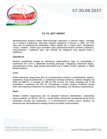 CO TO JEST WKKW? Wszechstronny Konkurs Konia Wierzchowego nazywany w skrócie wkkw, wywodzi się z tradycji wojskowej. Pierwsze zawody rozegrano w Paryżu w 1902, od 1912 roku jest to konkurencja olimpijska. Wkkw składa się z trzech prób: ujeżdżenia, crossu i skoków. Celem tych zawodów było zademonstrowanie zarówno zdolności, wytrzymałości i szybkości koni, jak również ich elegancji oraz zgrania konia z jeźdźcem. Ujeżdżenie Konkurs ujeżdżenia polega na wykonaniu odpowiednich figur na czworoboku o wymiarach 20 x 60 m. Sędziowie oceniają precyzję i elegancję wykonania figury, posłuszeństwo konia, jego sposób poruszania się w stępie, kłusie i galopie, a także dosiad jeźdźca. Cross Próba terenowa rozgrywana jest na urozmaiconym terenie z przeszkodami stałymi. Zawodnicy mają do pokonania, w zależności od klasy konkursu, dystans długości od 2300 do 6400 m, w tempie od 500 do 570 m/min. Na trasie znajduje się 15-40 przeszkód o wysokości do 120 cm. Przeszkody o dużym stopniu trudności muszą mieć alternatywną możliwość ich pokonania, łatwiejszą, ale bardziej czasochłonną. Skoki Konkurs skoków rozgrywany jest na zasadzie konkursu dokładności, przeszkody mają wysokość od 100 do 130 cm i nawet lekkie potrącenie przeszkody przez konia powoduje zrzutkę lub wyłamanie, a w konsekwencji punkty karne. Konkurs na parkurze jest sprawdzianem kondycji konia po próbie wytrzymałości.