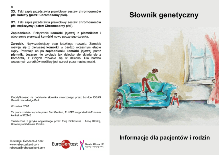 8 XX. Taki zapis przedstawia prawidłowy zestaw chromosomów płci kobiety (patrz: Chromosomy płci). Słownik genetyczny XY. Taki zapis przedstawia prawidłowy zestaw chromosomów płci mężczyzny (patrz: Chromosomy płci). Zapłodnienie. Połączenie komórki jajowej z plemnikiem i utworzenie pierwszej komórki nowo poczętego dziecka. Zarodek. Najwcześniejszy etap ludzkiego rozwoju. Zarodek rozwija się z pierwszej komórki w bardzo wczesnym etapie ciąży. Powstaje on po zapłodnieniu komórki jajowej przez plemnik. Jeszcze nie wygląda jak dziecko ale składa się z komórek, z których rozwinie się w dziecko. Dla bardzo wczesnych zarodków możliwy jest wzrost poza macicą matki. Zmodyfikowano na podstawie słownika stworzonego przez London IDEAS Genetic Knowledge Park. Wrzesień 2007 Ta praca została wsparta przez EuroGentest, EU-FP6 supported NoE numer kontraktu 512148 Tłumaczone z języka angielskiego przez Ewę Piotrowską i Annę Kloskę, Uniwersytet Gdański, Polska. Illustracje: Rebecca J Kent www.rebeccajkent.com [email protected] Informacje dla pacjentów i rodzin 2 Słownik genetyczny Amniocenteza. Pobrania próbki płynu owodniowego do analizy genów lub chromosomów nienarodzonego dziecka. Dziecko w macicy jest otoczone płynem owodniowym. Płyn ten zawiera niewielką ilość komórek skóry dziecka. Mała próbka płynu jest pobierana za pomocą cieniutkiej igły wprowadzanej przez skórę brzucha matki. Płyn jest wysyłany do laboratorium do dalszych analiz. 7 Translokacja niezrównoważona. Translokacja, w której zmiana wzoru chromosomowego wiąże się z wystąpieniem dodatkowego materiału chromosomowego, brakiem materiału chromosomowego, lub wystąpieniem obu tych zjawisk jednocześnie. Może wystąpić u dziecka, którego rodzic ma translokację zrównoważoną. Translokacja robertsonowska. Translokacja Robertsonowska ma miejsce wtedy, gdy jeden chromosom lub jego część zostaje doczepiony do innego chromosomu. Autosomalny. Mamy 23 pary chromosomów. Pary o numerach od 1 do 22 nazywane są autosomami i wyglądają tak samo u mężczyzn i kobiet. Chromosomy 23 pary wyglądają inaczej u mężczyzn i kobiet i są nazywane chromosomami płci. Translokacja wzajemna. Z translokacją wzajemną mamy do czynienia wtedy, gdy z dwóch różnych chromosomów odłamują się dwa fragmenty i wymieniają się miejscami. Badania prenatalne. Badania wykonywane w czasie ciąży, pozwalające stwierdzić obecność lub brak choroby genetycznej u dziecka. Translokacja zrównoważona. Translokacja, w której żaden materiał chromosomalny nie jest ani tracony, ani pozyskiwany, a tylko inaczej rozmieszczony. Osoba z translokacją zrównoważoną zwykle nie choruje z powodu jej występowania. Badanie genetyczne / test genetyczny. Badanie, które pozwala stwierdzić, czy w danym genie lub chromosomie występuje zmiana. Zwykle jest to test z krwi lub tkanki. Więcej informacji znajduje się w ulotce pt. „Czym jest badanie genetyczne?” Translokacja. Zmiana wzoru chromosomowego. Powstaje, gdy fragment chromosomu zostaje odłamany i przyłącza się do innego chromosomu. Badanie prognostyczne. Test genetyczny na chorobę, która może wystąpić lub wystąpi w późniejszym życiu. Jeśli test genetyczny wykonuje się pod kątem choroby, która niemal na pewno rozwinie się w przyszłości, takie badanie nazywa się badaniem przedobjawowym. Biopsja kosmówki, CVS. Badanie wykonywane w czasie ciąży służące do pobrania komórek w celu zbadania genów lub chromosomów dziecka pod kątem specyficznych chorób genetycznych. Niewielka ilość komórek jest pobierana z rozwijającego się łożyska i przesyłana do analizy do laboratorium. USG. Bezbolesne badanie wykorzystujące fale dźwiękowe do stworzenia obrazu dziecka w czasie trwania ciąży. Może być wykonywane przez przesuwanie głowicy ultrasonografu po skórze brzucha matki lub przezpochwowo. wymaz. Badanie zalecane wszystkim kobietom w celu sprawdzenia prawidłowości komórek u wejścia do macicy. Wynik negatywny. Wynik badania, który pokazuje, że badana osoba nie ma zmiany (mutacji) w genie. Wynik pozytywny. Wynik badania, który pokazuje, że badana osoba ma zmianę (mutację) w genie. 6 translokację zrównoważoną, gdzie żaden materiał chromosomowy nie jest tracony ani pozyskiwany i zwykle nie jest z tego powodu dotknięta chorobą. Nosiciel. Osoba, która przeważnie nie jest dotknięta chorobą (w danym momencie) ale posiada jedną uszkodzoną kopię genu. W przypadku chorób recesywnych, taka osoba zwykle nie będzie chorowała; w przypadku chorób dominujących objawy chorobowe mogą pojawić się w późniejszym okresie. Plemnik. Ojcowski wkład w komórkę, która będzie rosła i da początek dziecku. Każdy plemnik zawiera 23 chromosomy, po jednym z każdej pary u ojca. Plemnik łączy się z komórką jajową tworząc kompletną komórkę. Z tej pierwszej komórki rozwija się dziecko. Płód. Dalsze stadium rozwojowe zarodka trwające od 9 tygodnia po zapłodnieniu do narodzin. Pochwa. Połączenie macicy z zewnętrznymi płciowymi kobiety, część kanału rodnego. narządami Poradnictwo genetyczne. Proces polegający na informowaniu i udzielaniu wsparcia dla osób, które są dotknięte lub zaniepokojone chorobą, która może mieć podłoże genetyczne. Poronienie. Przedwczesne zakończenie ciąży, zanim dziecko będzie w stanie przeżyć poza macicą. Rodowód. Diagram przedstawiający członków rodziny, zarówno tych, którzy mają, jak i tych niemających choroby genetycznej oraz stopień ich pokrewieństwa. Test przezierności karkowej. Badanie USG tylnej części szyi płodu, gdzie prawidłowo w czasie wczesnej ciąży znajduje się przestrzeń wypełniona płynem. Jeśli dziecko ma wadę wrodzoną (jak zespół Downa), rozmiar tej przestrzeni może odbiegać od normy. 3 Choroba dziedziczna. Choroba, która jest dziedziczona (przekazywana z pokolenia na pokolenie). Choroba genetyczna.