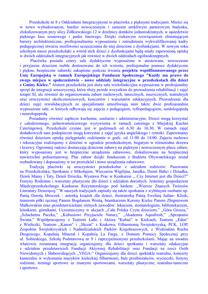 Przedszkole nr 8 z Oddziałami Integracyjnymi to placówka z pięknymi tradycjami. Mieści się w nowo wybudowanym, bardzo nowoczesnym i zarazem urokliwym parterowym budynku, zlokalizowanym przy ulicy Żółkiewskiego 12 w dzielnicy domków jednorodzinnych, w sąsiedztwie pięknego lasu sosnowego i parku linowego. Dzięki ciekawym rozwiązaniom eliminującym bariery architektoniczne, profesjonalnemu wyposażeniu i zatrudnieniu wykwalifikowanej kadry pedagogicznej stwarza możliwości uczęszczania do niej dzieciom z dysfunkcjami. W nowym roku szkolnym nasze przedszkolaki a wśród nich dzieci z dysfunkcjami będą miały zapewnioną opiekę w dwóch oddziałach integracyjnych jak również w dwóch oddziałach ogólnodostępnych. Placówka posiada cztery sale dydaktyczne wyposażone w atestowane, nowoczesne i przyjazne dzieciom meble dostosowane do ich wzrostu, profesjonalne pomoce dydaktyczne i piękne, bezpieczne zabawki zakupione podczas trwania projektu współfinansowanego przez Unię Europejską w ramach Europejskiego Funduszu Społecznego "Każdy ma prawo do swego miejsca w społeczeństwie - nowe oddziały integracyjne w przedszkolach dla dzieci z Gminy Kielce." Atutem przedszkola jest duża sala wielofunkcyjna wyposażona w profesjonalny sprzęt do integracji sensorycznej, która służy przede wszystkim do prowadzenia rehabilitacji i zajęć terapii SI, ale również do organizowania zabaw ruchowych, tanecznych, muzycznych, teatralnych oraz uroczystości okolicznościowych, koncertów i warsztatów edukacyjnych. Prowadzenie dla dzieci zajęć rewalidacyjnych ze specjalistami umożliwiają nam także dwie profesjonalnie wyposażone sale, w których odbywają się zajęcia z pedagogiem, tyflopedagogiem, surdologopedą i neurologopedą. Posiadamy również zaplecze kuchenne, sanitarne i administracyjne. Dzieci mogą korzystać z całodziennego, pełnowartościowego wyżywienia w ramach cateringu z Miejskiej Kuchni Cateringowej. Przedszkole czynne jest w godzinach od 6.30 do 16.30. W ramach zajęć dodatkowych nasi podopieczni mogą korzystać z zajęć języka angielskiego i rytmiki. Zapewniamy również dzieciom opiekę pielęgniarki codziennie w godz. od 11:00 do 14:00. Zajęcia ruchowe i rekreacyjne realizujemy z dziećmi w ogrodzie przedszkolnym, bogatym w różnorodne drzewa i krzewy. Ogromnej radości dostarczają dzieciom zabawy na pięknym i nowoczesnym placu zabaw, który wyposażony jest w bezpieczne urządzenia zabawowe, zlokalizowane na bezpiecznej nawierzchni poliuretanowej. Plac zabaw dzięki funduszom z Budżetu Obywatelskiego został rozbudowany i doposażony w tor przeszkód i nowe urządzenia zabawowe. Tradycją placówki są uroczystości przedszkolne z udziałem rodziców: Pasowanie na Przedszkolaka, Spotkanie z Mikołajem, Wieczerza Wigilijna, Jasełka, Dzień Babci i Dziadka, Dzień Mamy i Taty, Dzień Dziecka, Wystawa Prac w Konkursie ,, Czy Internet jest dla Dzieci?” Festyny Rodzinne i warsztaty plastyczne dla dzieci z udziałem dorosłych. Jesteśmy gospodarzem Międzyprzedszkolnego Konkursu Recytatorskiego pod hasłem: ,,Wiersze Znanych Twórców Literatury Dziecięcej.” W naszych tradycjach zapisały się także spotkania z wybitnymi osobami np. Panią Dorotą Mroczek - autorką książek dla dzieci, ilustratorką Panią Eweliną Jaślan- Klisik, trenerem piłki ręcznej Panem Bogdanem Wentą, bramkarzem Korony Kielce Panem Zbigniewem Małkowskim oraz przedstawicielami różnych zawodów: lekarzem, stomatologiem, bibliotekarzem, leśnikiem, górnikami. Uczestniczymy w akcjach ,,Cała Polska Czyta dzieciom,” ,,Góra Grosza,” ,,Szlachetna Paczka,” ,,Kubusiowi Przyjaciele Natury,” ,,Akademia Aquafresh,” ,,Sprzątanie Świata.” Współpracujemy z Teatrem Lalki i Aktora "Kubuś" w Kielcach, Teatrem ,,Eden” z Wieliczki, Teatrem ,,Kanon” i ,,Skrzat” z Krakowa, Filharmonią Świętokrzyską, PCK, LOP, Zespołem Świętokrzyskich i Nadnidziańskich Parków Krajobrazowych, z Wydziałem Ruchu Drogowego, Kopalnią Minerał i Kopalnią La Farge, z Domem Pomocy Społecznej przy ul. Sobieskiego, Szkołą Podstawową nr 9 i zaprzyjaźnionymi przedszkolami. Mając na uwadze właściwie rozumianą integrację organizujemy dla dzieci spotkania i warsztaty edukacyjne z udziałem przedstawicieli Fundacji Aktywnej Rehabilitacji oraz Fundacji na rzecz Osób Niewidomych i Słabowidzących ,,VEGA.” Organizujemy dla dzieci spektakle teatralne, koncerty kameralne w wykonaniu muzyków kieleckiej filharmonii, bale przebierańców, wycieczki, festyny rodzinne, treningi sportowe ze znanymi sportowcami, warsztaty plastyczne, teatralno-taneczne i sportowe. W naszej placówce kadra pedagogiczna i niepedagogiczna każdego dnia dokłada wszelkich starań, aby wspólnie budować ,,domowe przedszkole" dla dzieci i ich rodziców. Nauczyciele posiadają wykształcenie w zakresie wychowania przedszkolnego, uprawniające do pracy z dziećmi z niepełnosprawnością wzroku, słuchu, ruchu i niepełnosprawnością intelektualną. W oddziałach integracyjnych zatrudniamy wychowawcę, nauczyciela wspierającego dzieci niepełnosprawne oraz pomoc nauczyciela. W ramach organizacji pomocy psychologiczno – pedagogicznej bezpłatnych porad na terenie przedszkola udzielają specjaliści: psycholog, pedagog i logopeda z Miejskiego Zespołu Poradni Psychologiczno-Pedagogicznych w Kielcach. Organizujemy zajęcia z zakresu profilaktyki i bezpieczeństwa zarówno dla rodziców jak i dla naszych wychowanków. Nasze przedszkole to placówka z pięknymi tradycjami, wychowała już kilka pokoleń. Zapewniamy dzieciom dobrą opiekę, wychowanie i edukację w atmosferze akceptacji. Wspomagamy rozwój dziecka zgodnie z jego potencjałem i możliwościami, tworzymy przyjazną i serdeczną atmosferę. Traktujemy każde dziecko indywidualnie i podmiotowo. Przygotowujemy je do przeżywania sukcesu i radzenia sobie z porażkami. Dbamy o zdrowie i bezpieczeństwo dzieci. Jesteśmy otwarci na wspó