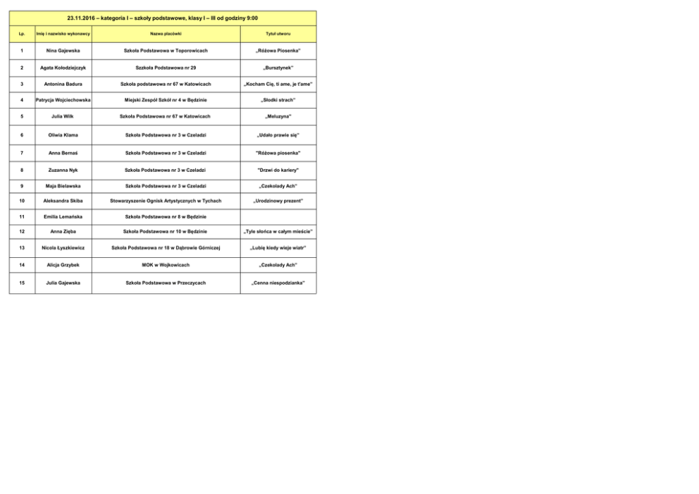 23.11.2016 – kategoria I – szkoły podstawowe, klasy I – III od godziny 9:00 Lp. Imię i nazwisko wykonawcy Nazwa placówki Tytuł utworu 1 Nina Gajewska Szkoła Podstawowa w Toporowicach „Różowa Piosenka” 2 Agata Kołodziejczyk Szzkoła Podstawowa nr 29 „Bursztynek” 3 Antonina Badura Szkoła podstawowa nr 67 w Katowicach „Kocham Cię, ti ame, je t'ame” 4 Patrycja Wojciechowska Miejski Zespół Szkół nr 4 w Będzinie „Słodki strach” 5 Julia Wilk Szkoła Podstawowa nr 67 w Katowicach „Meluzyna" 6 Oliwia Klama Szkoła Podstawowa nr 3 w Czeladzi „Udało prawie się” 7 Anna Bernaś Szkoła Podstawowa nr 3 w Czeladzi "Różowa piosenka" 8 Zuzanna Nyk Szkoła Podstawowa nr 3 w Czeladzi "Drzwi do kariery" 9 Maja Bielawska Szkoła Podstawowa nr 3 w Czeladzi „Czekolady Ach” 10 Aleksandra Skiba Stowarzyszenie Ognisk Artystycznych w Tychach „Urodzinowy prezent” 11 Emilia Lemańska Szkoła Podstawowa nr 8 w Będzinie 12 Anna Zięba Szkoła Podstawowa nr 10 w Będzinie „Tyle słońca w całym mieście” 13 Nicola Łyszkiewicz Szkoła Podstawowa nr 18 w Dąbrowie Górniczej „Lubię kiedy wieje wiatr” 14 Alicja Grzybek MOK w Wojkowicach „Czekolady Ach” 15 Julia Gajewska Szkoła Podstawowa w Przeczycach „Cenna niespodzianka” 16 Gabriela Stachurska Szkoła Podstawowa nr 1 w Będzinie „Góry mają moc” 17 Judyta Czernik Siemianowickie Centrum Kultury „Kapelusze mają duszę” 18 Hanna Borys Siemianowickie Centrum Kultury „Motylem byłam” 19 Zuzanna Załucka Gminny Oœrodek Kultury w Bobrownikach – Filia w Sączowie „Kuba wyspa jak wulkan gorąca” 20 Magadlena Lazar Gminny Oœrodek Kultury w Bobrownikach – Filia w Sączowie „Mexicana” 21 Julia Panek SSP w Budziskach „Cała doskonała” 22 Julia Wilkosz PMDK w Będzinie „Nauczycielka” 23 Nadia Białas Szkoła Podstawowa w Wojkowicach Kościelnych „O mnie się nie martw” 24 Amelia Piwowarczyk PMDK w Będzinie „Modelka” 25 Szymon Posikata Ognisko Pracy Pozaszkolnej nr 1 w Sosnowcu „Bajeczny uśmiech Twój” 26 Dominika Cieślik Ognisko Pracy Pozaszkolnej nr 1 w Sosnowcu „Ja i mój pies” 27 Natalia Frańczak Szkoła Podstawowa nr 6 w Będzinie „Pamiętajcie o lalkach” 28 Julia Polewiak Szkoła Podstawowa nr 6 w Będzinie „Kapelusze mają dusze” 29 Dobrawa Kutarba Szkoła Podstawowa nr 2 w Pszczynie „Parostatek” 30 Bernadetka Dyszy Towarzystwo Muzyczne „Dominanta” w Będzinie „Papuga Gaduła” 31 Magdalena Góralczyk Szkoła Podstawowa nr 1 w Mierzęcicach 32 Zuzanna Hudecka Szkoła Podstawowa nr 1 w Mierzęcicach 33 Julia Klimża Studio Muzyki i Piosenki „ARS” w Pietraszynie „Puszek Okruszek”