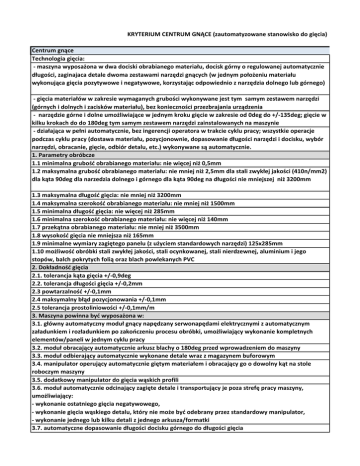 KRYTERIUM CENTRUM GNĄCE (zautomatyzowane stanowisko do gięcia) Centrum gnące Technologia gięcia: ‐ maszyna wyposażona w dwa dociski obrabianego materiału, docisk górny o regulowanej automatycznie długości, zaginajaca detale dwoma zestawami narzędzi gnących (w jednym położeniu materiału wykonująca gięcia pozytywowe i negatywowe, korzystając odpowiednio z narzędzia dolnego lub górnego) ‐ gięcia materiałów w zakresie wymaganych grubości wykonywane jest tym samym zestawem narzędzi (górnych i dolnych i zacisków materiału), bez konieczności przezbrajania urządzenia ‐ narzędzie górne i dolne umożliwiające w jednym kroku gięcie w zakresie od 0deg do +/‐135deg; gięcie w kilku krokach do do 180deg tym samym zestawem narzędzi zainstalowanych na maszynie ‐ działająca w pełni automatycznie, bez ingerencji operatora w trakcie cyklu pracy; wszystkie operacje podczas cyklu pracy (dostawa materiału, pozycjonownie, dopasowanie długości narzędzi i docisku, wybór narzędzi, obracanie, gięcie, odbiór detalu, etc.) wykonywane są automatycznie. 1. Parametry obróbcze 1.1 minimalna grubość obrabianego materiału: nie więcej niż 0,5mm 1.2 maksymalna grubość obrabianego materiału: nie mniej niż 2,5mm dla stali zwykłej jakości (410n/mm2) dla kąta 90deg dla narzedzia dolnego i górnego dla kąta 90deg na długości nie mniejszej niż 3200mm 1.3 maksymalna długość gięcia: nie mniej niż 3200mm 1.4 maksymalna szerokość obrabianego materiału: nie mniej niż 1500mm 1.5 minimalna długość gięcia: nie więcej niż 285mm 1.6 minimalna szerokość obrabianego materiału: nie więcej niż 140mm 1.7 przekątna obrabianego materiału: nie mniej niż 3500mm 1.8 wysokość gięcia nie mniejsza niż 165mm 1.9 minimalne wymiary zagiętego panelu (z użyciem standardowych narzędzi) 125x285mm 1.10 możliwość obróbki stali zwykłej jakości, stali ocynkowanej, stali nierdzewnej, aluminium i jego stopów, balch pokrytych folią oraz blach powlekanych PVC 2. Dokładność gięcia 2.1. tolerancja kąta gięcia +/‐0,9deg 2.2. tolerancja długości gięcia +/‐0,2mm 2.3 powtarzalność +/‐0,1mm 2.4 maksymalny błąd pozycjonowania +/‐0,1mm 2.5 tolerancja prostoliniowości +/‐0,1mm/m 3. Maszyna powinna być wyposażona w: 3.1. główny automatyczny moduł gnący napędzany serwonapędami elektrycznymi z automatycznym załadunkiem i rozładunkiem po zakończeniu procesu obróbki, umożliwiający wykonanie kompletnych elementów/paneli w jednym cyklu pracy 3.2. moduł obracający automatycznie arkusz blachy o 180deg przed wprowadzeniem do maszyny 3.3. moduł odbierający automatycznie wykonane detale wraz z magazynem buforowym 3.4. manipulator operujący automatycznie giętym materiałem i obracający go o dowolny kąt na stole roboczym maszyny 3.5. dodatkowy manipulator do gięcia wąskich profili 3.6. moduł automatycznie odcinający zagięte detale i transportujący je poza strefę pracy maszyny, umożliwiający: ‐ wykonanie ostatniego gięcia negatywowego, ‐ wykonanie gięcia wąskiego detalu, który nie może być odebrany przez standardowy manipulator, ‐ wykonanie jednego lub kilku detali z jednego arkusza/formatki 3.7. automatyczne dopasowanie długości docisku górnego do długości gięcia 3.8. podział docisku górnego 5mm 3.9 komplet narzędzi gnących górnych i dolnych 3.9. ruchome i sterowane narzędzia gnące do gięć pozytywowych (lewe i prawe) o długości minimum 500mm każde 3.10. napęd narzedzia pomocniczego do automatycznego wstawiania narzędzi specjalnych pomiędzy dociski 3.11. drugą ścieżkę zasilania w materiał: magazyn zasilający w detale do gięcia poza automatycznym modułem transportującym, umożliwiający zasilenie centrum jednorazowo pakietem elementów do gięcia 3.12. drugą ścieżkę do automatycznego wyprowadzenia obrobionego detalu poza przestrzeń roboczą maszyny, zabezpieczoną automatyczna przesłoną korytarza transportowgo 3.14. podłączenie do sieci wewnętrznej zamawiajacego oraz do sieci internet 3.15. czujniki grubości materiału kontrolujący grubość materiału każdego pobieranego elementu i na podstawie pomiaru rzeczywistej grubości korygujący automatycznie program giecia 3.16 chłodzenie szafy sterowniczej urządzenia 4. Oprogramowanie i sterowanie: 4.1. oprogamowanie na maszynie umożliwiajace: ‐ zarządzajace całością urzadzenia, ‐ wywołanie i uruchomienie dowolnego programu z serwera, ‐ diagnozujace stan maszyny, ‐ wskazanie dla operatora aktualnych czynnosci serwisowych, ‐ komunikację w czasie rzeczywistym, ‐ monitorujące efektywnośc pracy, ‐ napisanie programu roboczego na maszynie, ‐ wprowadzające automatyczne korekty w cyklu roboczym m.in. do zmierzonej rzeczywistej grubości materiału, wytrzymałości na rozciąganie, ‐ zapisywanie i zarządzanie programami produkcyjnymi, ‐ zaprogramowanie i realizacje gięcia bez pozostawiania odcisku narzedzi na zaginanym materiale (programowanie płynnego przemieszczania linii styku narzedzia z materiałem podczas gięcia) 4.2. oprogramowanie biurowe do zarzadzania maszyną, produkcją, diagnostyki oraz programowania cyklu gięcia. programowania cyklu gięcia na podstawie: ‐ wprowadzanych parametrów, ‐ elektronicznych rysunków wyciętych, płaskich elementów z zaznaczonymi liniami gięcia, ‐ elektronicznych modeli 3D gotowych detali, z możliwością generowania z modelu rozkroju właściwego dla pracy maszyny), ‐ zapisywanie i zarządzanie programami produkcyjnymi, 4.3. Oprogramowanie na maszynie i oprogramowanie biurowe musi pozwalać przeprowadzić symulację przygotowanego programu produkcyjnego wraz z wizualizacją cyklu obróbki wraz z komunikacją ew. ograniczeń i kolizji 4.4 Teleserwis do zdalnego diagnozowania awarii 4.5 maszyna musi być wyposażona w stację roboczą/komputer przemysłowy umożliwiający realizację wszystkich funkcji produkcyjnych, diagnostycznych oraz programowanie 