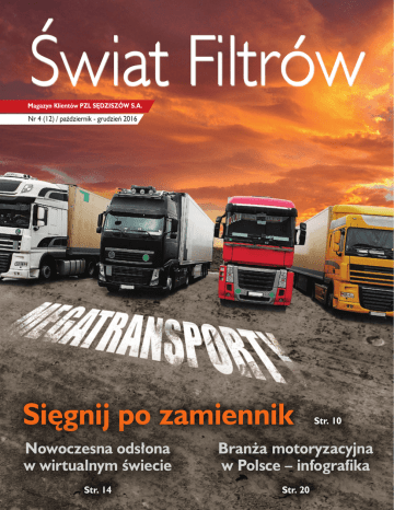 Świat Filtrów Magazyn Klientów PZL SĘDZISZÓW S.A. Nr 4 (12) / październik - grudzień 2016 Sięgnij po zamiennik Str. 10 Nowoczesna odsłona w wirtualnym świecie Branża motoryzacyjna w Polsce – infografika Str. 14 Str. 20 OD REDAKCJI Drodzy Czytelnicy, Znamy powiedzenie, że „kto stoi w miejscu, ten się cofa”. Patrząc na dokonania naszej firmy w ostatnich miesiącach oraz na zaplanowane działania, z pełnym przekonaniem mogę stwierdzić, że nie stoimy w miejscu. Świadczy o tym m.in. nasza obecność na największych branżowych spotkaniach w kraju i za granicą, rozwijanie współpracy z wiodącymi firmami transportowymi, wdrożenie nowoczesnej witryny internetowej, prowadzenie szkoleń produktowych czy wreszcie najbardziej spektakularna zmiana – renowacja naszego biurowca i przekształcenie go w budynek mieszkalny. Co wyzwala w nas energię do tylu działań i nieustannego rozwoju? Oczekiwania naszych Klientów oraz świadomość, że jako producenci jesteśmy zobowiązani do dostarczania nowych rozwiązań, do konstruowania i kreowania. Dlatego rozmawiamy z Klientami, spotykamy się z nimi na najważniejszych eventach motoryzacyjnych, rolniczych, transportowych. Takie bezpośrednie rozmowy są dla nas niezwykle cenne, inspirują nas i motywują do kolejnych projektów. Relacjom z tego rodzaju spotkań poświęciliśmy w bieżącym numerze sporo miejsca. Dodatkowo, za pomocą ciekawej infografiki, dzielimy się z Państwem wiedzą nt. branży rolniczej i motoryzacyjnej. Jak zwykle przekazujemy też Państwu specjalistyczną wiedzę z zakresu filtracji. W temacie numeru nasz konstruktor uzasadnia dlaczego warto stosować zamienniki filtrów marki PZL Sędziszów oraz przestrzega przed konsekwencjami montowania tzw. podróbek. Analizujemy też temat ochrony układu zasilania paliwem, który wymaga wyjątkowo starannej obsługi. Zachęcam również do zapoznania się z informacjami na temat ciekawej aplikacji mobilnej POLA. To znakomita inicjatywa, zwiększająca świadomość zakupową oraz narodową integrację. Z jesiennymi pozdrowieniami. Adam Sikorski Prezes PZL Sędziszów S.A. Magazyn Klientów PZL SĘDZISZÓW S.A. (kwartalnik) Wydawca: PZL SĘDZISZÓW S.A. Redakcja: Marta Bilonowicz e-mail: [email protected], tel. 500 006 078 Adres redakcji: Ul. Fabryczna 4, 39-120 Sędziszów Młp. Projekt graficzny i skład: Studio Grafpa, tel. 696 045 760, www.grafpa.pl Druk: Agnieszka Panasewicz KLAUDIA DRUK, ul. Obwodowa 25, 88-100 Inowrocław Redakcja zastrzega sobie prawo dokonywania korekty i skrótów nadesłanych materiałów. 2 Magazyn Klientów PZL SĘDZISZÓW S.A. W NUMERZE 4 6 10 16 NA BIEŻĄCO 4 5 6 III Piknik Rodzinny Wakacyjna edukacja Omega Pilzno o naszych filtrach Szkolenie filtracyjne dla Solaris Bus&Coach Październik z Mega Transportami Przerabiamy biurowiec na blok mieszkalny RELACJE 7 8 Automechanika 2016 Agro Show 2016 7 18 14 16 Nowoczesna odsłona w wirtualnym świecie Na zakupy z POLĄ SDFiM 17 Kolejny sezon z siatkarzami ABC FILTRACJI 18 Skuteczna ochrona układu zasilania paliwem CIEKAWOSTKI 20 Branża motoryzacyjna w Polsce TEMAT NUMERU KALENDARZ WYDARZEŃ NOWOŚCI W OFERCIE KONTAKT INICJATYWY DYSTRYBUCJA 10 12 13 Sięgnij po zamiennik Nowe referencje AGROinnowacje Świat Filtrów 21 22 23 Październik - grudzień Skontaktuj się z nami Sieć dystrybucji filtrów w Polsce 3 NA BIEŻĄCO III Piknik Rodzinny W ostatni weekend wakacji na Stadionie Miejskim w Sędziszowie Młp. odbył się piknik dla kadry pracowniczej PZL Sędziszów wraz z rodzinami. Gospodarzami spotkania był Zarząd firmy, reprezentowany przez prezesa Adama Sikorskiego oraz członków Zarządu: Bogusława Satławę i Grzegorza Tomasika. Piknik tradycyjnie rozpoczęto meczem piłkarskim. Do rywalizacji przystąpiły jede- 4 nastoosobowe drużyny, którym przewodzili: w barwach czerwonych - Adam Sikorski, w barwach niebieskich – Grzegorz Tomasik. W emocjonującej rozgrywce „niebiescy” pokonali „czerwonych” 4:3. Najwięcej atrakcji mieli najmłodsi uczestnicy pikniku. Oprócz dmuchanych zjeżdżalni i trampolin, dzieci miały do dyspozycji mnóstwo zabawek. Uczestniczyły też w rozmaitych zabawach prowadzonych przez animatorki, m.in. malowaniu twarzy, konkursach plastycznych i konkurencjach zręcznościowych. Na nudę nie narzekali też rodzice i opiekunowie. Brali udział w konkursach wiedzy i rywalizacjach zręcznościowych (slalom z piłką, skoki w workach itp.). Najwięcej emocji wzbudziły wyścig drużyn w taśmach oraz przeciąganie liny. Przy dźwiękach muzyki bawiono się do późnych godzin wieczornych. Magazyn Klientów PZL SĘDZISZÓW S.A. NA BIEŻĄCO Wakacyjna edukacja Podczas wakacji uczniowie z Zespołu Szkół Technicznych im. Karola Olszewskiego w Sędziszowie Młp. odbyli praktyki na terenie zakładu produkcyjnego PZL Sędziszów. Już od dwóch lat PZL Sędziszów zapewnia praktyki zawodowe oraz gwarantuje pierwszeństwo zatrudnienia absolwentom, którzy ukończyli staż. Dzięki temu zakład zysku- je młodą, wykształconą kadrę pracowniczą. Uczniowie mają możliwość pracy z wykwalifikowanymi fachowcami, uzupełniają swoją wiedzę i poszerzają umiejętności praktyczne. Praktykanci szkolą się m.in. z zakresu obsługi urządzeń, procesów produkcji filtrów, ich budowy, zastosowania i montażu. Poznają też oczekiwania potencjalnych pracodawców, co znacznie ułatwia wejście na rynek pracy. Omega Pilzno o naszych filtrach Z filtrów PZL Sędziszów korzysta wiele firm transportowych. Aby wyjaśnić dlaczego nasza marka cieszy się uznaniem w tym sektorze, poprosiliśmy jednego z partnerów – spółkę Omega Pilzno, o komentarz na temat naszych wyrobów. Obejrzyj materiał filmowy, który powstał w ramach współpracy obu firm, i dowiedz się jaka jest zależność między skutecznością filtracji a silnikami w samochodach ciężarowych. Film jest dostępny na naszym kanale YouTube. Szkolenie filtracyjne dla Solaris Bus&Coach Prz