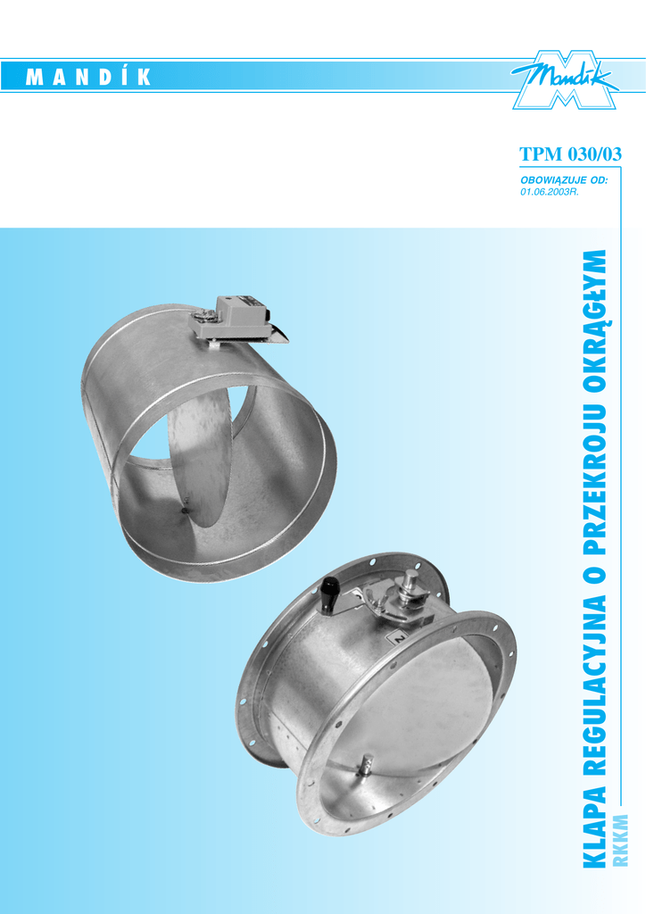 M A N D Í K TPM 030/03 RKKM KLAPA REGULACYJNA O PRZEKROJU OKRĄGŁYM OBOWIĄZUJE OD: 01.06.2003R. TPM 030/03 Wymiary w mm, masy w kg. Niniejsze warunki techniczne obejmują serię produkowanych wymiarów i wykonań „KLAP REGU− LACYJNYCH O PRZEKROJU OKRĄGŁYM RKKM“ (zwanych dalej klapami). Obowiązują na etapie produkcji, projektowania, zamawiania, dostaw, montażu, eksploatacji i konserwacji. I. INFORMACJE OGÓLNE 1. Opis 1.1. Klapy składają się z korpusu, łopatki oraz mechanizmu sterowania. Służą do regulacji przepływu po− wietrza w przewodzie wentylacyjnym przez zmniejszenie jego przekroju. Klapy nie są gazoszczelne. 1.2. Klapy przeznaczone są do stosowania w otoczeniu chronionym przed działaniem czynników atmosfe− rycznych klasy 3K5 zgodnie z normą ČSN EN 60 721−3−3, w pomieszczeniach bez zagrożenia wybu− chowego zgodnie z normą ČSN EN 1127−1 oraz w otoczeniu AA4 zgodnie z normą ČSN 33 2000−3. Powietrze przepływające przez klapy musi być wolne od stałych, włóknistych, klejących lub agresyw− nych cząstek, a jego temperatura musi być w granicach −10 do +60 °C. 1.3. Maksymalna różnica cinień i prędkoć przepływu powietrza w klapach regulacyjnych. Tabela nr 1 Wielkoć 80 100 110 125 140 150 * 160 180 200 225 250 280 300 310 * 315 355 400 450 500 560 630 Maksymalna różnica Maksymalna prędkoć przepływu cinień ∆p [ Pa ] powietrza wmax [m.s−1] 2000 18 2000 18 2000 18 2000 18 2000 18 2000 18 2000 18 2000 18 2000 18 2000 18 2000 15 2000 15 2000 15 2000 15 2000 15 2000 15 1500 12 1500 12 1500 12 1200 12 1200 12 * dostępna tylko wersja do przewodów typu spiro 2 TPM 030/03 2. Wykonanie Klapy dostarczane są w następujących wykonaniach: 2.1. W zależnoci od sposobu sterowania − ze sterowaniem ręcznym − do zainstalowania serwonapędu − ze sterowaniem za pomocą serwonapędu (230V, 24V) dwupozycyjnego − bez sygnalizacji położenia − ze sterowaniem za pomocą serwonapędu (230V, 24V) dwupozycyjnego − z sygnalizacją położenia − ze sterowaniem za pomocą serwonapędu (24V SR) z bezstopniową regulacją położenia. 2.1.1. Wykonanie klap według sposobu sterowania okrelają dwie cyfry za numerem TP. Tabela nr 2 Wykonanie klapy − typ sterowania Dwie cyfry za numerem TP sterowanie ręczne . 01 do zainstalowania serwonapędu . 09 serwonapęd−regulacja położenia 230V . 45 serwonapęd−regulacja położenia 230V + sygnalizacja położenia . 46 serwonapęd−regulacja położenia 24V . 55 serwonapęd−regulacja położenia 24V + sygnalizacja położenia . 56 serwonapęd−regulacja bezstopniowa 24V SR . 57 2.2. W zależnoci od sposobu przyłączenia: − do przewodu o przekroju okrągłym z kołnierzami zgodnie z ON 120517 − do przewodu typu spiro − do przewodu typu spiro z uszczelką grzbietową 2.3. Przykład specyfikacji zamówienia: KLAPA REGULACYJNA O PRZEKROJU OKRĄGŁYM RKKM − 100 − P TPM 030/03 . 56 typ wielkoć wykonanie do przyłączenia: P − do przewodu o przekroju okrągłym z kołnierzami zgodnie z ON 120517 S − do przewodu typu spiro SL − do przewodu typu spiro z uszczelką grzbietową warunki techniczne wykonanie (według punktu 2.1.1) Specyfikacje wymagań dotyczących wykonania z innym typem serwonapędu należy z góry uzgodnić z producentem. 3. Umieszczenie, montaż 3.1. Klapy przeznaczone są do montażu w przewodzie wentylacyjno−klimatyzacyjnym. Położenie robocze jest dowolne. 3.2. Przestrzeń minimalna dla urządzenia sterującego wynosi 250 mm. 3.3. Podczas umieszczania klap w przewodzie należy zachować wartoć "a" (otwarta łopatka wykracza poza korpus). Wartoć parametru "a" uwzględniono w tabelach nr 3 i 4. 3 TPM 030/03 4. Wymiary, nazewnictwo, masy 4. 1. Typoszereg, wymiary [mm], powierzchnie przestrzeni przelotowej [m2], masy [kg] 4. 1. 1 Klapa z przyłączem do przewodu o przekroju okrągłym z kołnierzami zgodnie z ON 120517 Tabela nr 3 Wielkoć ∅D 80 100 110 125 140 160 180 200 225 250 280 300 315 355 400 450 500 560 630 L 150 150 150 150 150 150 150 150 150 150 150 150 150 150 200 200 200 200 200 Wymiary a − − − − − − 10 20 32,5 45 60 70 77,5 97,5 95 120 145 175 210 Liczba otworów Powierzchnia p.p. ∅d 110 130 140 155 170 195 215 235 260 285 315 335 350 390 445 495 545 605 680 n 4 4 4 8 8 8 8 8 8 8 8 12 12 12 12 12 16 16 16 Sef 0,0047 0,0074 0,0090 0,0117 0,0147 0,0194 0,0246 0,0305 0,0387 0,0479 0,0603 0,0693 0,0765 0,0973 0,1238 0,1569 0,1940 0,2437 0,3088 Powierzchnia p.p. Masa Sef 0,0047 0,0074 0,0090 0,0117 0,0147 0,0170 0,0194 0,0246 0,0305 0,0387 0,0479 0,0603 0,0693 0,0740 0,0765 0,0973 0,1238 0,1569 0,1940 0,2437 0,3088 0,85 1,00 1,10 1,20 1,35 1,45 1,80 2,05 2,30 2,60 2,90 4,20 5,00 5,25 5,35 6,20 8,60 9,90 11,30 13,00 15,20 4.1.2 Klapa z przyłączem do przewodu typu spiro Tabela nr 4 Wielkoć ∅D 80 100 110 125 140 150 160 180 200 225 250 280 300 310 315 355 400 450 500 560 630 ∅D1 79 99 109 124 139 149 159 179 199 224 249 279 299 309 314 354 399 449 499 559 629 Wymiary L1 240 240 240 240 240 240 300 300 300 300 300 300 350 350 350 350 450 450 450 450 450 a − − − − − − − − − − − − − − − − − − 25 55 90 4 Masa 0,94 1,12 1,21 1,37 1,51 1,83 2,15 2,43 2,76 3,11 3,52 3,85 4,10 4,75 6,75 7,80 9,00 10,40 12,80 TPM 030/03 Powierzchnia przestrzeni przelotowej dla klapy całkowicie otwartej Sef [m2]. Otwarta łopatka wykracza poza korpus klapy po obu jej stronach o wartoć "a". Podane masy są ważne w przypadku klap regulacyjnych sterowanych ręcznie oraz przypadkach klap w wersji do zainstalowania serwonapędu. Do mas klap regulacyjnych sterowanych za pomocą serwona− pędu należy doliczyć jego masę − patrz tabela nr 5. Nietypowe wymiary klapy regulacyjnej o przekroju okrągłym nie są produkowane. 4.2. Rozwiązania konstrukcyjne 4.2.1 Klapa z przyłączem do przewodu o przekroju okrągłym z kołnierzami zgodnie z ON 120517 Klapa ze sterowaniem ręcznym Klapa ze sterowaniem za pomocą serw