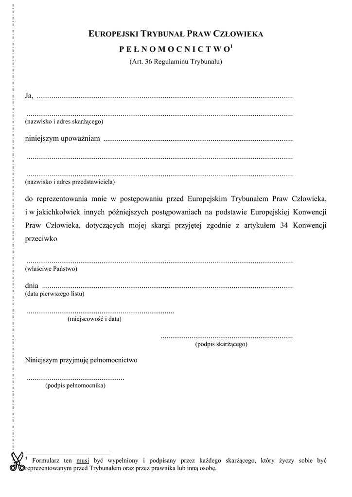 EUROPEJSKI TRYBUNAŁ PRAW CZŁOWIEKA P E Ł N O M O C N I C T W O1 (Art. 36 Regulaminu Trybunału) Ja, ...................................................................................................................................... ........................................................................................................................................... (nazwisko i adres skarżącego) niniejszym upoważniam ................................................................................................... ........................................................................................................................................... ........................................................................................................................................... (nazwisko i adres przedstawiciela) do reprezentowania mnie w postępowaniu przed Europejskim Trybunałem Praw Człowieka, i w jakichkolwiek innych późniejszych postępowaniach na podstawie Europejskiej Konwencji Praw Człowieka, dotyczących mojej skargi przyjętej zgodnie z artykułem 34 Konwencji przeciwko ........................................................................................................................................... (właściwe Państwo) dnia ................................................................................................................................... (data pierwszego listu) ............................................................................. (miejscowość i data) ..................................................................... (podpis skarżącego) Niniejszym przyjmuję pełnomocnictwo ................................................... (podpis pełnomocnika) 1 Formularz ten musi być wypełniony i podpisany przez każdego skarżącego, który życzy sobie być reprezentowanym przed Trybunałem oraz przez prawnika lub inną osobę.