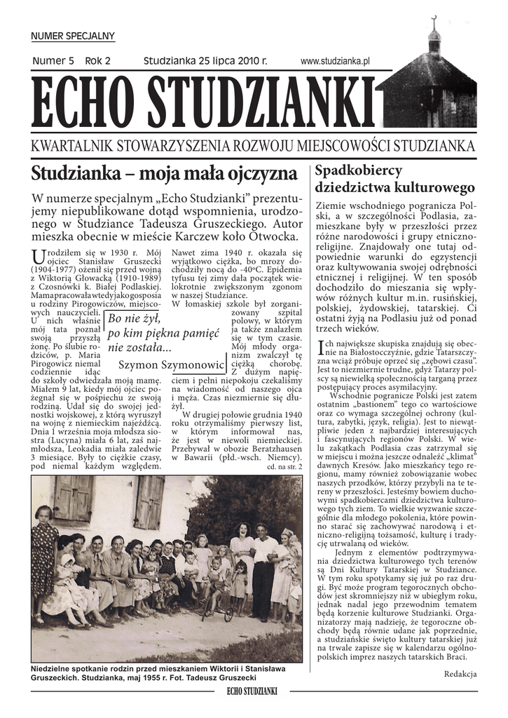 NUMER SPECJALNY Numer 5 Rok 2 Studzianka 25 lipca 2010 r. www.studzianka.pl ECHO STUDZIANKI KWARTALNIK STOWARZYSZENIA ROZWOJU MIEJSCOWOŚCI STUDZIANKA Studzianka – moja mała ojczyzna W numerze specjalnym „Echo Studzianki” prezentujemy niepublikowane dotąd wspomnienia, urodzonego w Studziance Tadeusza Gruszeckiego. Autor mieszka obecnie w mieście Karczew koło Otwocka. rodziłem się w 1930 r. Mój U ojciec Stanisław Gruszecki (1904-1977) ożenił się przed wojną Nawet zima 1940 r. okazała się wyjątkowo ciężka, bo mrozy dochodziły nocą do -40ºC. Epidemia z Wiktorią Głowacką (1910-1989) tyfusu tej zimy dała początek wiez Czosnówki k. Białej Podlaskiej. lokrotnie zwiększonym zgonom Mama pracowała wtedy jako gosposia w naszej Studziance. u rodziny Pirogowiczów, miejsco- W łomaskiej szkole był zorganiwych nauczycieli. zowany szpital U nich właśnie Bo nie żył, polowy, w którym mój tata poznał ja także znalazłem swoją przyszłą po kim piękna pamięć się w tym czasie. żonę. Po ślubie ro- nie została... Mój młody orgadziców, p. Maria nizm zwalczył tę Pirogowicz niemal Szymon Szymonowic ciężką chorobę. codziennie idąc Z dużym napiędo szkoły odwiedzała moją mamę. ciem i pełni niepokoju czekaliśmy Miałem 9 lat, kiedy mój ojciec po- na wiadomość od naszego ojca żegnał się w pośpiechu ze swoją i męża. Czas niezmiernie się dłurodziną. Udał się do swojej jed- żył. nostki wojskowej, z którą wyruszył W drugiej połowie grudnia 1940 na wojnę z niemieckim najeźdźcą. roku otrzymaliśmy pierwszy list, Dnia 1 września moja młodsza sio- w którym informował nas, stra (Lucyna) miała 6 lat, zaś naj- że jest w niewoli niemieckiej. młodsza, Leokadia miała zaledwie Przebywał w obozie Beratzhausen 3 miesiące. Były to ciężkie czasy, w Bawarii (płd.-wsch. Niemcy). pod niemal każdym względem. cd. na str. 2 Niedzielne spotkanie rodzin przed mieszkaniem Wiktorii i Stanisława Gruszeckich. Studzianka, maj 1955 r. Fot. Tadeusz Gruszecki ECHO STUDZIANKI Spadkobiercy dziedzictwa kulturowego Ziemie wschodniego pogranicza Polski, a w szczególności Podlasia, zamieszkane były w przeszłości przez różne narodowości i grupy etnicznoreligijne. Znajdowały one tutaj odpowiednie warunki do egzystencji oraz kultywowania swojej odrębności etnicznej i religijnej. W ten sposób dochodziło do mieszania się wpływów różnych kultur m.in. rusińskiej, polskiej, żydowskiej, tatarskiej. Ci ostatni żyją na Podlasiu już od ponad trzech wieków. I ch największe skupiska znajdują się obecnie na Białostocczyźnie, gdzie Tatarszczyzna wciąż próbuje oprzeć się „zębowi czasu”. Jest to niezmiernie trudne, gdyż Tatarzy polscy są niewielką społecznością targaną przez postępujący proces asymilacyjny. Wschodnie pogranicze Polski jest zatem ostatnim „bastionem” tego co wartościowe oraz co wymaga szczególnej ochrony (kultura, zabytki, język, religia). Jest to niewątpliwie jeden z najbardziej interesujących i fascynujących regionów Polski. W wielu zakątkach Podlasia czas zatrzymał się w miejscu i można jeszcze odnaleźć „klimat” dawnych Kresów. Jako mieszkańcy tego regionu, mamy również zobowiązanie wobec naszych przodków, którzy przybyli na te tereny w przeszłości. Jesteśmy bowiem duchowymi spadkobiercami dziedzictwa kulturowego tych ziem. To wielkie wyzwanie szczególnie dla młodego pokolenia, które powinno starać się zachowywać narodową i etniczno-religijną tożsamość, kulturę i tradycję utrwalaną od wieków. Jednym z elementów podtrzymywania dziedzictwa kulturowego tych terenów są Dni Kultury Tatarskiej w Studziance. W tym roku spotykamy się już po raz drugi. Być może program tegorocznych obchodów jest skromniejszy niż w ubiegłym roku, jednak nadal jego przewodnim tematem będą korzenie kulturowe Studzianki. Organizatorzy mają nadzieję, że tegoroczne obchody będą równie udane jak poprzednie, a studziańskie święto kultury tatarskiej już na trwale zapisze się w kalendarzu ogólnopolskich imprez naszych tatarskich Braci. Redakcja WSPOMNIENIA Studzianka – moja mała ojczyzna Stanisław Gruszecki (ojciec autora wspomnień) w niewoli niemieckiej. Beratzhausen (Niemcy). Fot. 1942 r. Powrót ojca nastąpił dopiero we wrześniu 1947 roku. Wracając do okresu szkolnego, to wspominam te czasy z pewnym sentymentem. Mimo, że warunki były wówczas ciężkie, to jednak chciałem zdobywać wiedzę. Dwa lata szkoły powszechnej zaliczyłem przed samą wojną w Łomazach. Później zorganizowano nam dalszą naukę w prywatnym domu p. Niczyporuka. Moimi kolegami szkolnymi (część z nich już nie żyje) byli Henryk Sienkiewicz, Czesław Józafaciuk, Czesław Niczyporuk. Kierownikiem szkoły był Feliks Pirogowicz. Pedagog z powołania – oddany dla młodzieży. Prywatnie był mężem p. Marii Pirogowicz (z Bajrulewiczów). Stanowili przykładne małżeństwo. Mieli trzech synów (Romualda, Bogumiła Emiliana). Romuald zmarł nagle w okresie swoich studiów. Razem z rodziną Pirogowiczów mieszkała krewna p. Marii – Anna Bajrulewicz, zwana „ciocią” Ona właśnie jako jedyna wówczas osoba wśród Tatarów Studzianki nie przeszła na katolicyzm, pozostając muzułmanką. Pamiętam jej pogrzeb, który odbył się na cmentarzu tatarskim, czyli na mizarze. W Otwocku mieszka p. Alicja Azulewicz-Rek. Mam przyjemność znać się osobiście z p. Azulewicz, która oprócz obowiązków zawodowych, pracuje również społecznie na rzecz miasta i spółdzielni mieszkaniowej. Chętnie czyta „Echo Studzianki”, które jej udostępniam. Jej przodkowie spoczywają na mizarze w Studzince. Po wojnie ukończyłem Średnią Szkołę Zawodową w Białej Podlaskiej. W Studziance spędziłem swoje młode lata – do roku 1954, kiedy nastąpił mój wyjazd do Jeleniej Góry. Na początku lat 60-tych dotarła do mnie wiadomość, że spłonął mój dom rodzinny w Studzia