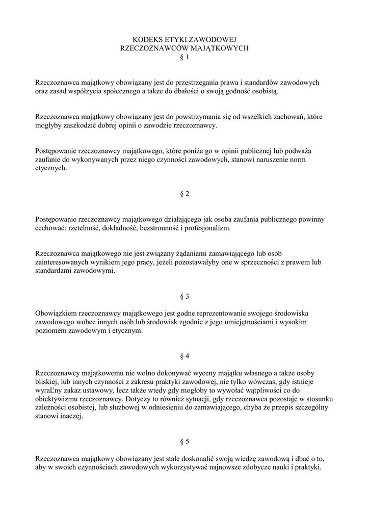 KODEKS ETYKI ZAWODOWEJ RZECZOZNAWCÓW MAJĄTKOWYCH §1 Rzeczoznawca majątkowy obowiązany jest do przestrzegania prawa i standardów zawodowych oraz zasad współŜycia społecznego a takŜe do dbałości o swoją godność osobistą. Rzeczoznawca majątkowy obowiązany jest do powstrzymania się od wszelkich zachowań, które mogłyby zaszkodzić dobrej opinii o zawodzie rzeczoznawcy. Postępowanie rzeczoznawcy majątkowego, które poniŜa go w opinii publicznej lub podwaŜa zaufanie do wykonywanych przez niego czynności zawodowych, stanowi naruszenie norm etycznych. §2 Postępowanie rzeczoznawcy majątkowego działającego jak osoba zaufania publicznego powinny cechować: rzetelność, dokładność, bezstronność i profesjonalizm. Rzeczoznawca majątkowego nie jest związany Ŝądaniami zamawiającego lub osób zainteresowanych wynikiem jego pracy, jeŜeli pozostawałyby one w sprzeczności z prawem lub standardami zawodowymi. §3 Obowiązkiem rzeczoznawcy majątkowego jest godne reprezentowanie swojego środowiska zawodowego wobec innych osób lub środowisk zgodnie z jego umiejętnościami i wysokim poziomem zawodowym i etycznym. §4 Rzeczoznawcy majątkowemu nie wolno dokonywać wyceny majątku własnego a takŜe osoby bliskiej, lub innych czynności z zakresu praktyki zawodowej, nie tylko wówczas, gdy istnieje wyraĽny zakaz ustawowy, lecz takŜe wtedy gdy mogłoby to wywołać wątpliwości co do obiektywizmu rzeczoznawcy. Dotyczy to równieŜ sytuacji, gdy rzeczoznawca pozostaje w stosunku zaleŜności osobistej, lub słuŜbowej w odniesieniu do zamawiającego, chyba Ŝe przepis szczególny stanowi inaczej. §5 Rzeczoznawca majątkowy obowiązany jest stale doskonalić swoją wiedzę zawodową i dbać o to, aby w swoich czynnościach zawodowych wykorzystywać najnowsze zdobycze nauki i praktyki. §6 Rzeczoznawca majątkowy nie powinien podejmować się wykonywania czynności z zakresu praktyki zawodowej, które wykraczałyby poza jego wiedzę i kompetencje zawodowe. §7 Rzeczoznawca majątkowy obowiązany jest do zachowania zasady poufności i nie ujawniania osobom trzecim informacji, które uzyskał w toku wykonywania czynności zawodowych. Obowiązek ten spoczywa na rzeczoznawcy równieŜ po ustaniu wykonywania czynności, chyba, Ŝe z tego obowiązku zwolnił go sąd lub inny właściwy organ, albo zamawiający. §8 Rzeczoznawca majątkowy obowiązany jest powstrzymać się od działań stanowiących nieuczciwą konkurencję lub nieuczciwą reklamę. W szczególności, jeŜeli inny rzeczoznawca majątkowy negocjuje wynagrodzenie za wykonanie określonych czynności, nie wolno rzeczoznawcy, który się o tym dowiedział, oferować ceny niŜszej za te same usługi. Rzeczoznawcę majątkowego obowiązują w zakresie Ŝądania wynagrodzenia za wykonywane przez niego czynności zasady dotyczące minimalnych wynagrodzeń, ustalane przez Polska Federację Rzeczoznawców Majątkowych. Treść materiału promocyjnego, oraz sposób jego prezentacji powinny być przedstawione na odpowiednim poziomie i nie mogą umniejszać w opinii publicznej jakości usług oferowanych przez innych rzeczoznawców, lub w jakikolwiek sposób im szkodzić. W reklamach mogą być zamieszczane informacje o kwalifikacjach rzeczoznawcy i organizacjach zawodowych, do których naleŜy. §9 Stosunki miedzy rzeczoznawcami majątkowymi powinno cechować koleŜeństwo, wzajemna lojalność i współpraca, zwłaszcza w zakresie dzielenia się swoją wiedzą i doświadczeniem zawodowym z osobami uzyskującymi uprawnienia zawodowe w zakresie szacowania nieruchomości. Nie stanowi naruszenia zasad wymienionych w ust. 1 negatywne ocenianie działalności zawodowej rzeczoznawcy majątkowego wynikające z dokonanej w ramach organizacji zawodowej przez innego rzeczoznawcę majątkowego oceny lub opinii o wykonanym przez niego operacie szacunkowym, chociaŜby nie zostały one następnie utrzymane przez organy prowadzące postępowanie o których jest mowa w § 10.ust 1. § 10 Rzeczoznawca majątkowy nie moŜe dokonywać oceny lub opiniowania operatu szacunkowego sporządzonego przez innego rzeczoznawcę majątkowego. Nie dotyczy to oceny lub opiniowania w przypadku, gdy czynność ta wykonywana jest: w postępowaniu prowadzonym przez organizację zawodową, w postępowaniu przed Komisją Odpowiedzialności Zawodowej, na Ŝądanie sądu lub innego organu wymiaru sprawiedliwości. Nie stanowi naruszenia zasad etyki zawodowej opiniowanie lub ocena operatu szacunkowego dokonywana z zachowaniem wymogów przewidzianych w Standardzie VII.2 § 11 Rzeczoznawca majątkowy wykonuje czynności zawodowe zgodnie z najlepszą wiedzą fachową i ze starannością właściwą dla tych czynności. § 12 Rzeczoznawcy majątkowemu nie wolno przyjmować od zamawiającego lub osób trzecich w związku z wykonywanymi czynnościami jakichkolwiek korzyści osobistych lub majątkowych poza wynagrodzeniem ustalonym w umowie. § 13 Rzeczoznawca majątkowy obowiązany jest do stosowania przepisów niniejszego kodeksu takŜe w stosunku do swojego klienta, chociaŜby on tego nie Ŝądał lub nie wynikało to wyraĽnie z treści zawartej umowy. § 14 Przepisy niniejszego Kodeksu obowiązują wszystkich rzeczoznawców majątkowych. Nad przestrzeganiem norm Kodeksu czuwają organizacje zawodowe w stosunku do swoich członków oraz Polska Federacja Stowarzyszeń Rzeczoznawców Majątkowych. § 15 Kodeks opracowano w zespole: Zygmunt Bojar, Andrzej Hopfer, Andrzej Kalus, Stanisława Kalus, Zdzisław Małecki, Tomasz Telega. Kodeks został uchwalony przez Radę Krajową PFSRM w dniu 13 paĽdziernika 1999r. i włączony do zbioru Standardów Zawodowych Rzeczoznawców Majątkowych, zamiast Kodeksu etyki zawodowej uchwalonego 4 maja 1995 r. Niniejszy Kodeks etyki zawodowej obowiązuje od dnia 14 listopada 1999 r.