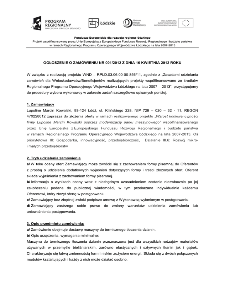 Fundusze Europejskie dla rozwoju regionu łódzkiego Projekt współfinansowany przez Unię Europejską z Europejskiego Funduszu Rozwoju Regionalnego i budżetu państwa w ramach Regionalnego Programu Operacyjnego Województwa Łódzkiego na lata 2007-2013 OGŁOSZENIE O ZAMÓWIENIU NR 001/2012 Z DNIA 16 KWIETNIA 2012 ROKU W związku z realizacją projektu WND – RPLD.03.06.00-00-856/11, zgodnie z „Zasadami udzielania zamówień dla Wnioskodawców/Beneficjentów realizujących projekty współfinansowane ze środków Regionalnego Programu Operacyjnego Województwa Łódzkiego na lata 2007 – 2013”, przystępujemy do procedury wyboru wykonawcy w zakresie zadań szczegółowo opisanych poniżej. 1. Zamawiający Lupoline Marcin Kowalski, 93-124 Łódź, ul. Kilińskiego 228, NIP 729 – 020 – 32 - 11, REGON 470228012 zaprasza do złożenia oferty w ramach realizowanego projektu „Wzrost konkurencyjności firmy Lupoline Marcin Kowalski poprzez modernizację parku maszynowego” współfinansowanego przez Unię Europejską z Europejskiego Funduszu Rozwoju Regionalnego i budżetu państwa w ramach Regionalnego Programu Operacyjnego Województwa Łódzkiego na lata 2007-2013, Oś priorytetowa III: Gospodarka, innowacyjność, przedsiębiorczość, Działanie III.6: Rozwój mikro- i małych przedsiębiorstw 2. Tryb udzielenia zamówienia a/ W toku oceny ofert Zamawiający może zwrócić się z zachowaniem formy pisemnej do Oferentów z prośbą o udzielenia dodatkowych wyjaśnień dotyczących formy i treści złożonych ofert. Oferent składa wyjaśnienia z zachowaniem formy pisemnej. b/ Informacja o wynikach oceny wraz z niezbędnym uzasadnieniem zostanie niezwłocznie po jej zakończeniu podana do publicznej wiadomości, w tym przekazana indywidualnie każdemu Oferentowi, który złożył ofertę w postępowaniu. c/ Zamawiający bez zbędnej zwłoki podpisze umowę z Wykonawcą wyłonionym w postępowaniu. d/ Zamawiający zastrzega sobie prawo do zmiany warunków udzielenia zamówienia lub unieważnienia postępowania. 3. Opis przedmiotu zamówienia: a/ Zamówienie obejmuje dostawę maszyny do termicznego tłoczenia dzianin. b/ Opis urządzenia, wymagania minimalne: Maszyna do termicznego tłoczenia dzianin przeznaczona jest dla wszystkich rodzajów materiałów używanych w przemyśle bieliźniarskim, zarówno elastycznych i sztywnych tkanin jak i gąbek. Charakteryzuje się łatwą zmiennością form i niskim zużyciem energii. Składa się z dwóch połączonych modułów kształtujących i każdy z nich może działać osobno. Fundusze Europejskie dla rozwoju regionu łódzkiego Projekt współfinansowany przez Unię Europejską z Europejskiego Funduszu Rozwoju Regionalnego i budżetu państwa w ramach Regionalnego Programu Operacyjnego Województwa Łódzkiego na lata 2007-2013 Parametry techniczne: - wysokość regulacji max do 2 100 mm, - kształtowanie do 4 warstw, - czas kształtowania – ok. 40 sekund, - czas całkowity – max 60 sekund, - funkcja regulacji głębokości form, - elektroniczne sterowanie, - waga max 500 kg, - zasilanie max 3 x 400V, - częstotliwość do 50 Hz, - natężenie prądu max 25 A. 4. Kryteria oceny i sposób obliczania ceny a/ Niniejsze zapytanie ofertowe będzie rozpatrywane pod względem ceny - waga kryterium 100%. b/ Za najkorzystniejszą zostanie uznana oferta odpowiadająca wszystkim warunkom przedstawionym przez Zamawiającego w pkt. 3 zapytania i najniższą ceną. 5. Forma i termin wykonania zamówienia a/ Termin dostawy: do 25 maja 2012 roku. b/ Zamawiający ustala, iż rozliczenie za dostawę nastąpi w oparciu o fakturę VAT wystawioną przez Dostawcę w ustalonym terminie. 6. Warunki udziału w postępowaniu, sposób przygotowania i forma złożenia oferty a/ W postępowaniu udział może wziąć każdy Oferent, który zgodnie ze złożoną deklaracją posiada możliwości wykonania przedmiotu zamówienia zgodnie z warunkami określonymi w niniejszym ogłoszeniu. b/ Oferty należy przygotować pisemnie w formie zawierającej wszystkie niezbędne informacje. c/ Ofertę można: - złożyć osobiście w siedzibie firmy: Lupoline Marcin Kowalski przy ul. Kilińskiego 228 w Łodzi, - doręczyć za pośrednictwem poczty lub kuriera pod adres: Lupoline Marcin Kowalski, ul. Kilińskiego 228, 93-124 Łódź, - przesłać za pośrednictwem poczty elektronicznej na adres: [email protected] d/ Termin składania ofert upływa dnia 30 kwietnia 2012r., o godzinie 15:00. e/ Otwarcie ofert nastąpi w siedzibie firmy Lupoline Marcin Kowalski, w dniu w którym upływa termin składania ofert, tj. dnia 30 kwietnia 2012 roku o godzinie 16:00. Fundusze Europejskie dla rozwoju regionu łódzkiego Projekt współfinansowany przez Unię Europejską z Europejskiego Funduszu Rozwoju Regionalnego i budżetu państwa w ramach Regionalnego Programu Operacyjnego Województwa Łódzkiego na lata 2007-2013 f/ W sprawach nieuregulowanych w niniejszym ogłoszeniu mają zastosowanie odpowiednie przepisy Kodeksu Cywilnego. 7. Sposób informowania Oferentów o prowadzonym postępowaniu a/ Pełna informacja o prowadzonym postępowaniu zawarta w niniejszym ogłoszeniu dostępna jest do publicznej wiadomości za pośrednictwem: - siedziby firmy: Lupoline Marcin Kowalski, ul. Kilińskiego 228, 93-124 Łódź, - strony internetowej firmy: www.lupoline.pl b/ Zamawiający zastrzega sobie prawo do przesłania niniejszego zapytania do wybranych przez siebie potencjalnych Oferentów z prośbą o rozpatrzenie możliwości wzięcia udziału i złożenia oferty w postępowaniu. 8. Sposób kontaktowania się pomiędzy Zamawiającym a Oferentami w postępowaniu Do bezpośredniego kontaktowania się z potencjalnymi Oferentami w sprawach związanych z prowadzonym postępowaniem Zamawiający upoważnia: Imię nazwisko: Mariola Hundziak Telefon: 42/ 646 08 56 e-mail: [email protected]