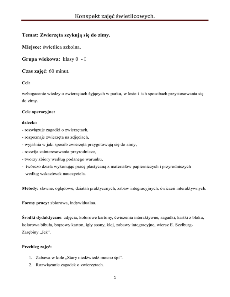 Konspekt zajęć świetlicowych. Temat: Zwierzęta szykują się do zimy. Miejsce: świetlica szkolna. Grupa wiekowa: klasy 0 - I Czas zajęć: 60 minut. Cel: wzbogacenie wiedzy o zwierzętach żyjących w parku, w lesie i ich sposobach przystosowania się do zimy. Cele operacyjne: dziecko - rozwiązuje zagadki o zwierzętach, - rozpoznaje zwierzęta na zdjęciach, - wyjaśnia w jaki sposób zwierzęta przygotowują się do zimy, - rozwija zainteresowania przyrodnicze, - tworzy zbiory według podanego warunku, - twórczo działa wykonując pracę plastyczną z materiałów papierniczych i przyrodniczych według wskazówek nauczyciela. Metody: słowne, oglądowe, działań praktycznych, zabaw integracyjnych, ćwiczeń interaktywnych. Formy pracy: zbiorowa, indywidualna. Środki dydaktyczne: zdjęcia, kolorowe kartony, ćwiczenia interaktywne, zagadki, kartki z bloku, kolorowa bibuła, brązowy karton, igły sosny, klej, zabawy integracyjne, wiersz E. SzelburgZarębiny „Jeż”. Przebieg zajęć: 1. Zabawa w kole „Stary niedźwiedź mocno śpi”. 2. Rozwiązanie zagadek o zwierzętach. 1 Konspekt zajęć świetlicowych. a) Dzieci siedzą w kręgu, nauczycielka czyta zagadki. Po podaniu prawidłowego rozwiązania umieszczamy zdjęcia zwierząt w środku kręgu. Ma króciutkie nóżki, i maleńki ryjek, chociaż igły nosi, nigdy nic nie szyje. ( jeż ) To rude zwierzątko, w dziupli sobie mieszka. Skacze po gałęziach, kocha się w orzeszkach. ( wiewiórka ) Duże i piękne są te zwierzęta, w wysokich górach, w lasach mieszkają. Żadne z nich zimnych dni nie pamięta, bo wszystkie smacznie je przesypiają. (niedźwiedź ) Co za zwierz po lesie chodzi I rudą kitą liście zamiata? Gdy noc ciemna zapada cichutko do kurników się skrada. ( lis ) Długi ma ogonek, oczy – jak paciorki, gdy zobaczy kota – ucieka do norki. ( mysz ) Czarno – biały ptak po łące spaceruje. Lubi stać na jednej nodze, żabki konsumuje. ( bocian ) Jest mniejszy od gołębia i zamiast gruchać – ćwierka. Czasami z parapetu przez okno na nas zerka. ( wróbel ) Lubi jagody i żołędzie, więc sadełko sobie przędzie W czasie zimowej pory chowa się do swej nory. 2 Konspekt zajęć świetlicowych. Jego czarno-biała głowa w lesie dobrze się chowa. ( borsuk ) b) Dzieci, siedząc w kręgu, zastanawiają się, w jaki sposób wymienione zwierzęta przygotowują się do zimy. Niedźwiedź – jesienią dużo je i zapada w sen zimowy. Chyba najbardziej wszystkim znanym i kojarzącym się ze snem zimowym zwierzęciem jest niedźwiedź. W Polsce spotkać można niedźwiedzia brunatnego objętego ochroną. Gdy zbliża się zima, ssaki te poszukują odpowiedniego schronienia zwanego gawrą. Najczęściej jest to kotlina lub rozpadlina skalna. Aby niedźwiedziowi było ciepło i miękko jej dno wyścieła liśćmi i mchem. Generalnie samice prędzej zapadają w sen - już w listopadzie, natomiast samce włóczą się po lesie aż do grudnia. Niedźwiedzie śpią zazwyczaj do marca lub kwietnia, lecz długość snu zależy od warunków klimatycznych danej okolicy i srogości zimy danego roku. Wiewiórka – zmienia kolor futerka, staje się ono bardziej puchate. Zakopuje swoje przysmaki w różnych miejscach lasu, parku, w ogrodach. Zapada w krótkie drzemki, budząc się wyszukuje zakopane zapasy. Lis – zmienia kolor futra, staje się ono bardziej puchate. Borsuk – dużo je, gromadząc pod skórą zapasy tłuszczu. Zapada w sen zimowy. Często się budzi i wychodzi z norki aby się napić i coś upolować. Jeż- dużo je, gromadząc pod skórą zapasy tłuszczu. Pod koniec jesieni robi sobie legowisko z liści i mchu pod korzeniami drzew, w jamkach. Zasypia. Mysz – mysz polna chroni się w ludzkich siedzibach, Mysz leśna dobrze wspinająca się po drzewach, wykorzystuje na zimową norkę puste przestrzenie między korzeniami drzew. Mysz zaroślowa kopie głębsze niż latem korytarze. W jamkach gromadzi nasiona drzew i roślin zielonych. Bocian – odlatuje do ciepłych krajów ( Afryka ). Wróbel – trzymają się blisko siedzib ludzkich…. . Segregowanie zdjęć zwierząt na planszach na te, które: - gromadzą zapasy pożywienia na zimę - zapadają w sen zimowy - odlatują do ciepłych krajów - ptaki przeczekujące jesień i zimę w Polsce. c) Zabawa ruchowa „Wrona” 3 Konspekt zajęć świetlicowych. Dzieci siedzą w kole. Jedno dziecko, które będzie zgadywało stoi w pewnej odległości. Na znak nauczyciela odzywa się „Kra, kra”. Dziecko nie odsłaniając oczu, musi wskazać z której strony usłyszało głos wrony. d) Rozmowa z dziećmi na temat: W jaki sposób ludzie mogą pomóc zwierzętom przetrwać zimę ? e) Odgadywanie z ukrytych pod kolorowymi nakrywkami zwierząt – ćwiczenia interaktywne. f) Praca przy stolikach – słuchanie wiersza „Jeż” Ewy Szelburg – Zarembina. Wykonanie pracy plastycznej przedstawiającej jeża ( brązowy karton, czarny papier – wycinanki, zielona bibuła, igły sosnowe, klej, kartka z bloku. Mój mały, maleńki, Czy ty o tym wiesz, że nocą - północą Chodzi złoty jeż? Drzew pilnuje w sadzie, pod jabłonką śpi, a gdy go obudzić, jest okropnie zły! Mój mały, maleńki, Czy ty o tym wiesz, że ten jeż to wcale nie jest żaden jeż? To śliczny królewicz co dla jakichś kar w jeża zamieniony został przez zły czar! Mój mały, maleńki, posłuchaj mych rad: nie chodź nigdy nocą w owocowy sad. I nie szukaj jeża, co pod drzewem śpi, 4 Konspekt zajęć świetlicowych. bo gdy go obudzisz, będzie bardzo zły! 3. Przygotowanie wystawki wykonanych prac. Omówienie prac, technik, którymi je wykonano. Ewaluacja pracy. 4. Porządkowanie miejsc pracy. Opracowała Beata Zmyślona 5