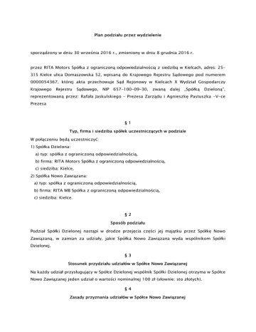 Plan podziału przez wydzielenie sporządzony w dniu 30 września 2016 r., zmieniony w dniu 8 grudnia 2016 r. przez RITA Motors Spółka z ograniczoną odpowiedzialnością z siedzibą w Kielcach, adres: 25315 Kielce ulica Domaszowska 52, wpisaną do Krajowego Rejestru Sądowego pod numerem 0000054367, której akta przechowuje Sąd Rejonowy w Kielcach X Wydział Gospodarczy Krajowego Rejestru Sądowego, NIP 657-100-09-30, zwaną dalej „Spółką Dzieloną”, reprezentowaną przez: Rafała Jaskulskiego – Prezesa Zarządu i Agnieszkę Pastuszka -V-ce Prezesa §1 Typ, firma i siedziba spółek uczestniczących w podziale W połączeniu będą uczestniczyć: 1) Spółka Dzielona: a) typ: spółka z ograniczoną odpowiedzialnością, b) firma: RITA Motors Spółka z ograniczoną odpowiedzialnością, c) siedziba: Kielce, 2) Spółka Nowo Zawiązana: a) typ: spółka z ograniczoną odpowiedzialnością, b) firma: RITA MB Spółka z ograniczoną odpowiedzialnością, c) siedziba: Kielce. §2 Sposób podziału Podział Spółki Dzielonej nastąpi w drodze przejęcia części jej majątku przez Spółkę Nowo Zawiązaną, w zamian za udziały, jakie Spółka Nowo Zawiązana wyda wspólnikom Spółki Dzielonej. §3 Stosunek przydziału udziałów w Spółce Nowo Zawiązanej Na każdy udział przysługujący w Spółce Dzielonej wspólnik Spółki Dzielonej otrzyma w Spółce Nowo Zawiązanej jeden udział o wartości nominalnej 100 zł (słownie: sto złotych). §4 Zasady przyznania udziałów w Spółce Nowo Zawiązanej Udziały w Spółce Nowo Zawiązanej, o których mowa w § 2 i 3, zostaną wydane – według stosunku przydziału określonego w § 3 – osobom będącym wspólnikami Spółki Dzielonej w dniu wydzielenia, tj. w dniu wpisu Spółki Nowo Zawiązanej do rejestru. §5 Dzień, od którego udziały uprawniają do uczestniczenia w dywidendzie Spółki Nowo Zawiązanej Udziały, o których mowa w § 2 i 3, uprawniają do uczestniczenia w dywidendzie Spółki Nowo Zawiązanej od dnia wpisu tej Spółki do rejestru. §6 Prawa przyznane przez Spółkę Nowo Zawiązaną wspólnikom szczególnie uprawnionym w Spółce Dzielonej Wspólnikom Spółki Dzielonej nie zostają przyznane w Spółce Nowo Zawiązanej prawa wykraczające poza zwykłe uprawnienia wynikające z udziałów. §7 Szczególne korzyści dla członków organów Spółki Dzielonej, a także innych osób uczestniczących w podziale, jeśli takie zostały przyznane Członkom organów Spółki Dzielonej, a także innym osobom uczestniczącym w podziale nie zostają przyznane szczególne korzyści. §8 Opis i podział składników majątku (aktywów i pasywów) oraz zezwoleń, koncesji lub ulg Spółki Dzielonej przypadających Spółce Nowo Zawiązanej 1. Spółce Nowo Zawiązanej przypadają następujące składniki majątku (aktywa i pasywa) Spółki Dzielonej stanowiące zorganizowaną część przedsiębiorstwa, która może służyć prowadzeniu działalności gospodarczej w zakresie sprzedaży samochodów marki Mercedes, napraw pojazdów mechanicznych, sprzedaży części zamiennych, pośrednictwa ubezpieczeniowego i wypożyczalni samochodów: 1) prawa i obowiązki Spółki Dzielonej jako wynajmującego wynikające z umowy najmu z dnia 01 lipca 2016 r., zawartej do 31 lipca 2026 r., z Pelor Sp. z o.o. z siedzibą w Kielcach, nr KRS 0000581929 jako najemcą, dotyczącej nieruchomości położonej w Kielcach przy Al. Solidarności nr 14, 2) prawa i obowiązki Spółki Dzielonej jako Autoryzowanego Dealera Mercedes-Benz w zakresie samochodów osobowych i dostawczych, wynikające z umów dotyczących samochodów osobowych i dostawczych, zawartych w dniu 11.09.2009 roku w Warszawie pomiędzy Mercedes-Benz Polska sp. z o.o a Rita Motors sp. z o.o , 3) prawa i obowiązki Spółki Dzielonej jako odbiorcy wynikające z umowy z dnia 15.07.2016 na dostawy oleju silnikowego Castrol, zawartej z Amtra Spółka z o.o., 4) rzeczy ruchome stanowiące wyposażenie i narzędzia serwisu samochodowego Mercedes-Benz, zgodnie z załącznikami Nr 1 i 2, z uwzględnieniem możliwych zmian do dnia podziału, 5) sieć komputerowa i komputery znajdujące się w Spółce Dzielonej w oddziale w Kielcach RITA MB, przy al. Solidarności 14, zgodnie z załącznikiem Nr 2, z uwzględnieniem możliwych zmian do dnia podziału, 6) meble biurowe, zgodnie z załącznikiem Nr 2, z uwzględnieniem możliwych zmian do dnia podziału, 7) części zamienne w magazynie położonym w Kielcach przy Al. Solidarności 14, zgodnie z Załącznikiem Nr 3 (wykaz stanu magazynowego), z uwzględnieniem możliwych zmian do dnia podziału, 8) zewnętrzne oznakowanie budynku przy Al. Solidarności 14, dedykowane MercedesBenz, 9) prawa i obowiązki wynikające z przyjętych zamówień na sprzedaż samochodów marki Mercedes złożonych przez następujących klientów: Jacek Nosek (Indywidualna Specjalistyczna Praktyka Lekarska), Grzegorz Saniawa (Firma Konsultingowa Grzegorz Saniawa), Marek Maciejski (Samochodowy Transport Drogowy Marek Maciejski), Izoterm Mariusz Walek Sp.j., Joanna Kowalska (Joanna Kowalska Promoefekt), Maciej Ziarek (Specjalistyczna Prywatna Praktyka Lekarska lek. med. Maciej Ziarek), Alicja Lisowska (PPH „FORTECH” Alicja Lisowska), Joanna Streb (Joanna Streb Praktyka Lekarska), 10) prawa i obowiązki wynikające z umów o współpracy, zawartych z następującymi osobami: Marcin Tomasz Bieniek (KART-KOM Bieniek Marcin Tomasz), Michał Szczepaniak (F.H.U. AUTO SPEC Szczepaniak Michał), Marcin Wrzoskiewicz, Krzysztof Dziedzic (Dziedzic Krzysztof Mechanika Pojazdowa), Przemysław Miter (PRZEMO Miter Przemysław), Adam Zacharski (PROGRES Zacharski Adam), Katarzyna Brzezińska (KABRA Usługi Biurowe Brzezińska Katarzyna), Mariola Sęk – Pańtak (FUKS Mariola Sęk – Pańtak), Adrian Galiński (P.H.U. GLOBNET Galiński Adrian), Kamil Treliński (Mechanika Pojazdowa Treliński Kamil), Andrzej Maciejec (AN CAR Maciejec Andrzej), Marcin Karczewski (Dorad