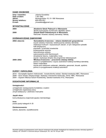 DANE OSOBOWE Imię i nazwisko: Data urodzin: Adres: Numer telefonu: E-mail: Jolanta Kowalska 1.08.1982 Nowogrodzka 15, 01-186 Warszawa 600-000-001 [email protected] WYKSZTAŁCENIE 2004 2000 Akademia Sztuk Pięknych w Warszawie Studia licencjackie na kierunku Stylistka ubioru Zespół Szkół OdzieŜowych w Warszawie Kierunek: Krawiec odzieŜy damskiej i lekkiej DOŚWIADCZENIE ZAWODOWE 2002–obecnie 2000–2002 Samodzielna krawcowa – własna działalność gospodarcza szycie odzieŜy miarowej i ekskluzywnej odzieŜy damskiej realizacja trudnych i wyszukanych zleceń, w tym nietypowe sylwetki haft artystyczny poprawki i przeróbki krawieckie przeszywanie wzorów rekonstrukcja odzieŜy wykonywanie prób tkaninowych doradzanie fasonu, materiałów, kroju szycie i stylizacja strojów dla programów telewizyjnych Młodsza krawcowa – pracownia odzieŜy lekkiej pomoc w projektowaniu i szyciu autorskich kolekcji konfekcji damskiej dobór materiałów szycie pod nadzorem sukienek, Ŝakietów, garsonek, bluzek, spódnic pomoc w przygotowaniu kolekcji autorskich KURSY I SZKOLENIA 2010 – Europejski dyplom mistrzowski - konstruktorka odzieŜ, Szkoła krawiecka ABC, Warszawa 2008 – Kurs wizaŜu artystycznego, stylizacji i kreowania wizerunku, firma ABC, Warszawa 2004 – Dyplom Mistrza Sztuki Krawieckiej, Szkoła krawiecka XYZ, Warszawa DODATKOWE INFORMACJE Umiejętności: umiejętność nawiązywania kontaktów z ludźmi umiejętność organizacji pracy zmysł estetyczny i zdolności manualne Języki obce: komunikatywna znajomość języka niemieckiego Inne: prawo jazdy kategorii A i B Zainteresowania: sztuka, pływanie, szydełkowanie WyraŜam zgodę na przetwarzanie moich danych osobowych dla potrzeb niezbędnych do realizacji procesu rekrutacji zgodnie z Ustawą z dn. 29.08.97 o Ochronie Danych Osobowych, Dz. Ust. Nr 133 poz. 883.