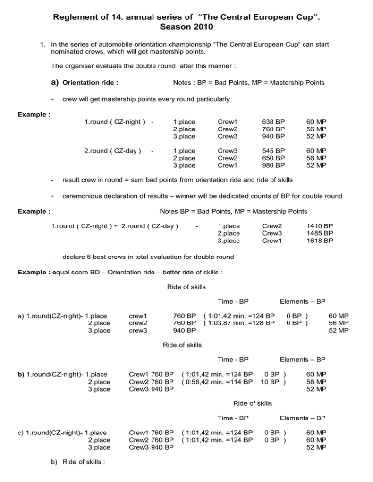 Reglement of 14. annual series of “The Central European Cup“. Season 2010 1. In the series of automobile orientation championship “The Central European Cup“ can start nominated crews, which will get mastership points. The organiser evaluate the double round after this manner : a) Orientation ride : - crew will get mastership points every round particularly Notes : BP = Bad Points, MP = Mastership Points Example : 1.round ( CZ-night ) - 1.place 2.place 3.place Crew1 Crew2 Crew3 638 BP 760 BP 940 BP 60 MP 56 MP 52 MP 2.round ( CZ-day ) 1.place 2.place 3.place Crew3 Crew2 Crew1 545 BP 650 BP 980 BP 60 MP 56 MP 52 MP - - result crew in round = sum bad points from orientation ride and ride of skills - ceremonious declaration of results – winner will be dedicated counts of BP for double round Example : Notes BP = Bad Points, MP = Mastership Points 1.round ( CZ-night ) + 2.round ( CZ-day ) - - 1.place 2.place 3.place Crew2 Crew3 Crew1 1410 BP 1485 BP 1618 BP declare 6 best crews in total evaluation for double round Example : equal score BD – Orientation ride – better ride of skills : Ride of skills Time - BP a) 1.round(CZ-night)- 1.place 2.place 3.place crew1 crew2 crew3 760 BP 760 BP 940 BP Elements – BP ( 1:01,42 min. =124 BP ( 1:03,87 min. =128 BP 0 BP ) 0 BP ) Ride of skills Time - BP b) 1.round(CZ-night)- 1.place 2.place 3.place Crew1 760 BP Crew2 760 BP Crew3 940 BP ( 1:01,42 min. =124 BP ( 0:56,42 min. =114 BP Elements – BP 0 BP ) 10 BP ) 60 MP 56 MP 52 MP Ride of skills Time - BP c) 1.round(CZ-night)- 1.place 2.place 3.place b) Ride of skills : Crew1 760 BP Crew2 760 BP Crew3 940 BP ( 1:01,42 min. =124 BP ( 1:01,42 min. =124 BP Elements – BP 0 BP ) 0 BP ) 60 MP 60 MP 52 MP 60 MP 56 MP 52 MP - drivers will get mastership points every round particularly Example : - 1.round ( CZ-night ) - 1.place 2.place 3.place Driver1 Driver2 Driver3 138 BP 260 BP 440 BP 60 MP 56 MP 52 MP 2.round ( CZ-day ) 1.place 2.place 3.place Driver3 Driver2 Driver1 45 BP 150 BP 480 BP 60 MP 56 MP 52 MP - ceremonious declaration of results – winner will be dedicated counts of BP for double round Example : 1.round ( CZ-night ) + 2.round ( CZ-day ) - - 1.place 2.place 3.place Driver2 410 BP Driver3 485 BP Driver1 618 BP declare 3 best drivers in total evaluation for double round Example : equal score BP – ride of skills : a) 1.round(CZ-night)- 1.place 2.place 3.place Time - BP Driver1124 BP Driver2124 BP Driver3168 BP ( 1:01,42 min. =124 BP ( 0:56,64 min. =114 BP Elements – BP 0 BP ) 10 BP ) Time - BP b) 1.round(CZ-night)- 1.miesto 1.miesto 3.miesto Driver1124 BP Driver2124 BP Driver3168 BP ( 1:01,42 min. =124 BP ( 1:01,42 min. =124 BP 60 MP 56 MP 52 MP Elements – BP 0 BP ) 0 BP ) 60 MP 60 MP 52 MP Mastership points: 1.place 2. 3. 4. 5. 6. 7. 8. 9. 10. 11. 12. 13. 14. 15. 16. 17. 18. 19. 20. /60 points /56 /52 /48 /45 /42 /39 /36 /34 /32 /30 /29 /28 /27 /26 /25 /24 /23 /22 /21 21. 22. 23. 24. 25. 26. 27. 28. 29. 30. 31. 32. 33. 34. 35. 36. 37. 38. 39. 40. /20 /19 /18 /17 /16 /15 /14 /13 /12 /11 /10 / 9 / 8 / 7 / 6 / 5 / 4 / 3 / 2 / 1 When there is the same number of points, the post will be determined after summary of points of championships in which both crews took part. The organiser of every competition round of the „Central European Cup“ are asked to evaluate also the individual rides of skills. The cup´s points of every ride of skills you should add to every crew, similar to the total results and in the end of the season there will be an evaluation of the six best drivers with the highest amount of points reached in cups. The evaluation of ride of skills is similar to the final results. (see the table No. 7) 2. Three nominated crews from Slovakia, Hungary, Romania and Poland ( 3 crews from Opole ) have food and accommodation settlement from organiser - these crews designate each country ( right of priority have crews from club organiser ). Every next of nominated crews of 14. annual of the series of "The Central European Cup" will be pay start-charge presented in prepositions. The organiser will define value of start-charge according to direct costs of crew - food and accommodation, maximum – 75 EUR/1 crew. This season 2010 crews from Czec Team and Poznan Team from Poland haven´t any reciprocity. They comming play startcharge presented in prepositions on each of rounds of 14. annual series of "The Central European Cup",season 2010. Start-charge is only for raced crew, extra person will be pay according to proposition of race - they can pay another cash then racers – maximum is 50 EUR/1 person. 3. Schedule of rounds of 14. annual series of “The Central European Cup“, season 2010: 1. round - night 16.- 18.04.2010 Opole Poland PL 2. round - day 16.- 18.04.2010 Opole Poland PL 3. round - night 11.- 13.06.2010 Poznan Poland PL 4. round - day 11.- 13.06.2010 Poznan Poland PL 5. round - night 02.- 04.07.2010 Pecs Hungary H 6. round - day 02.- 04.07.2010 Pecs Hungary H 7. round - night 10.- 12.09.2010 Baia Mare Romania RO 8. round - day 10.- 12.09.2010 Baia Mare Romania RO 9. round - night 08.- 10.10.2010 Spisska Bela Slovakia SK 08.- 10.10.2010 Spisska Bela Slovakia SK 10. round - day 4. Delivery time lag + ranking of delivery time lag in race : One stage – maximum permissible delivery time lag – 45 minutes Two stages – maximum permissible delivery time lag – 60 minutes, from that in one stage maximum permissible delivery time lag – 45 minutes Three stages and more – maximum permissible delivery time lag – 90 minutes, from that in one stage maximum permissible delivery time lag – 45 minutes Ranking of delivery time lag : 1 – 10 minute - per every begun minute 5 BP 11 – 20 minute - per every begun minute 10 BP 21 – 30 minute - per every begun minute 15 BP 31 – 60 minute - per every begun minute 20 BP 61 minute and more - bonus 10000 BP Example : Two night stages – delivery time ( max. 60 minutes ) ranking : 1.stage – 22 minutes 2.stage – 34 minutes :
