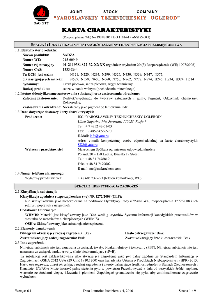 ОАО ЯТУ KARTA CHARAKTERISTYKI (Rozporządzenie WE) No 1907/2006 / ISO 11014-1 / ANSI Z400.1) SEKCJA 1: IDENTYFIKACJA SUBSTANCJI/MIESZANINY I IDENTYFIKACJA PRZEDSIĘBIORSTWA 1.1 Identyfikator produktu: Nazwa produktu: SADZA Numer WE: 215-609-9 Numer rejestracyjny 01-2119384822-32-XXXX (zgodnie z artykułem 20 (3) Rozporządzenie (WE) 1907/2006) Numer CAS: 1333-86-4 Ta KCH jest ważna N121, N220, N234, N299, N326, N330, N339, N347, N375, dla następujących mareki: N539, N550, N650, N660, N750, N762, N772, N774, П245, П234, П324, П514 Synonimy: Czerń piecowa, sadza piecowa, węgel techniczny Rodzaj produktu: sadza w stanie wolnym (pochodzenia mineralnego) 1.2 Istotne zidentyfikowane zastosowania substancji oraz zastosowania odradzane: Zalecane zastosowanie: Dodatek/wypełniacz do tworzyw sztucznych i gumy, Pigment, Odczynnik chemiczny, Różnorodne. Zastosowania odradzane: Niezalecany jako pigment do tatuowania ludzi. 1.3 Dane dotyczące dostawcy karty charakterystyki: Producent: JSC “YAROSLAVSKIY TEKHNICHESKIY UGLEROD” Ulica Gagarina 74a, Jarosław, 150023, Rosja * Tel:: + 7 4852 42-51-03 Fax: + 7 4852 42-52-70, E-Mail: [email protected] Adres e-mail: kompetentnej osoby odpowiedzialnej za kartę charakterystyki: [email protected] Wyłączny przedstawiciel Makrochem Spółka z ograniczoną odpowiedzialnością Poland, 20 – 150 Lublin, Bursaki 19 Street Tel.: + 48 81 7478819 Faks: + 48 81 7470602 E-mail: [email protected] 1.4 Numer telefonu alarmowego: Wyłączny przedstawiciel: + 48 605 232-223 (telefon komórkowy, WE) SEKCJA 2: IDENTYFIKACJA ZAGROŻEŃ 2.1 Klasyfikacja substancji: Klasyfikacja zgodnie z rozporządzeniem (we) NR 1272/2008 (CLP): Nie sklasyfikowana jako niebezpieczna na podstawie Dyrektywy Rady 67/548/EWG, rozporządzenia 1272/2008 i ich różnych poprawek i uzupełnień. Dodatkowe Informacje: WHMIS: Materiał jest klasyfikowany jako D2A według kryteriów Systemu Informacji kanadyjskich pracowników w stosunku do materiałów niebezpiecznych (WHMIS). OSHA: Sklasyfikowany jako substancja niebezpieczna. 2.2 Elementy oznakowania: Piktogram określający rodzaj zagrożenia: Brak Hasło ostrzegawcze: Brak Zwrot wskazujący rodzaj zagrożenia: Brak Zwrot wskazujący środki ostrożności: Brak 2.3 Inne zagrożenia: Niniejsza substancja nie jest uznawana za związek trwały, bioakumulujący i toksyczny (PBT). Niniejsza substancja nie jest uznawana za związek bardzo trwały, silnie bioakumulujący (vPvB). Ta substancja jest zaklasyfikowana jako stwarzająca zagrożenie jako pył palny zgodnie ze Standardem Informacji o Zagrożeniach OSHA 2012 USA (29 CFR 1910.1200) oraz kanadyjska Ustawa o Produktach Niebezpiecznych (HPR) 2015. Hasło ostrzegawcze, zwrot określający rodzaj zagrożenia i zwroty wskazujące środki ostrożności w Stanach Zjednoczonych i Kanadzie: UWAGA Może tworzyć palne stężenia pyłu w powietrzu Przechowywać z dala od wszystkich źródeł zapłonu, włącznie ze źródłami ciepła, iskrzenia i płomieni. Zapobiegać gromadzeniu się pyłu, aby zminimalizować zagrożenie wybuchem. Wersja: 6.1 Data kontrolu: Październik 4, 2016 Strona 1 z 9 Produkt: Sadza JSC «Yaroslavskiy tekhnicheskiy uglerod» Może się spalić lub tlić się w temperaturze powyżej 300 °C. Produkty rozkładu mogą zawierać tlenek węgla, dwutlenek węgla i tlenki siarki. Może powodować odwracalne mechaniczne podrażnienie oczu i dróg oddechowych. Niektóre marki sadzy mają niską przewodność, co przyczynia się do gromadzenia się ładunków elektrostatycznych. Drogi narażenia: drogi oddechowe, przez kontakt z oczami i skórą SEKCJA 3: SKŁAD / INFORMACJA O SKŁADNIKACH 3.1 Substancje: Klasyfikacja zgodna z Rozporządzeniem (WE) nr 1272/2008 [CLP] Sadza Nie sklasyfikowany 3.2 Mieszaniny: Nie dotyczy. Nazwa chemiczna Numer CAS Numer WE Sklad, % wag Numer rejestracyjny REACH 1333-86-4 215-609-9 100 01-2119384822-32-XXXX SEKCJA 4: ŚRODKI PIERWSZEJ POMOCY 4.1 Opis środków pierwszej pomocy: Po wdychaniu: Przenieść na świeże powietrze. Aby zapewnić opieki medycznej, gdy objawy nie ustępują. W razie potrzeby przywrócic normalne oddychanie poprzez standardowe środki do udzielania pierwszej pomocy. Po kontakcie ze skórą: Nie jest niebezpieczny. Przemyć zanieczyszczoną skórę pod bieżącą wodą stosując mydło i osuszyć miękkim ręcznikiem. Jeżeli postęp objawów, należy skonsultować się z lekarzem. Po kontakcie z oczami: Natychmiast przemywać oczy dużą ilością wody przez 10-15 minut przy otwartych oczach. Jeżeli jest postęp objawów, należy skonsultować się z lekarzem. W przypadku połknięcia NIE wywoływać wymiotów. Jeśli osoba przytomna, trzeba przepłukać usta wodą. Nie podawać nic doustnie nieprzytomnej osobie. 4.2 Najważniejsze ostre i opóźnione objawy oraz skutki narażenia: W wypadku wdychania: Tymczasowy dyskomfort w górnych drogach oddechowych może nastąpić ze względu na mechaniczne podrażnienie, gdy stężenie pyłu jest większe od maksymalnej dopuszczalnej wartości. Zapewnienie odpowiednich urządzeń wywiewnej wentylacji w miejscach, gdzie może występować zapylenie. Patrz również rozdział 8. W przypadku połknięcia: Nie ma dowodów na niekorzystne skutki. Niskie ryzyko przy normalnym użytkowaniu w przemyśle i handlu. Po kontakcie z oczami: Wysokie stężenie pyłu może powodować mechaniczne podrażnienie oczu. Niskie ryzyko przy normalnym użytkowaniu w przemyśle i handlu. Po kontakcie ze skórą: Może powodować podrażnienie mechaniczne, zanieczyszczenia, i suchość skóry. Dzialanie uczulajace: Brak doniesień o niepożądanych skutkach narażenia. Działanie rakotwórcze: sklasyfikowany przez Międzynarodową Organizację . Badań nad Rakiem (IARC): Grupa 2B (przypuszczalnie rakotwórczy dla ludzi). Nie wymienione jako substancja rakotwórcza przez następujące organizacje: NTP, ACGIH, OSHA lub Unii Europejskiej. Patrz także punkt 11. 4.3 Wskazania dotyczące wszelkiej natychmia