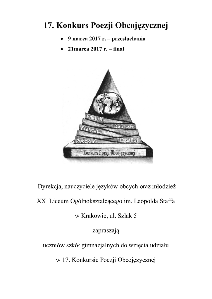 17. Konkurs Poezji Obcojęzycznej • 9 marca 2017 r. – przesłuchania • 21marca 2017 r. – finał Dyrekcja, nauczyciele języków obcych oraz młodzież XX Liceum Ogólnokształcącego im. Leopolda Staffa w Krakowie, ul. Szlak 5 zapraszają uczniów szkół gimnazjalnych do wzięcia udziału w 17. Konkursie Poezji Obcojęzycznej REGULAMIN 17. KONKURSU POEZJI OBCOJĘZYCZNEJ kategoria „Gimnazjum” 1. W konkursie mogą wziąć udział uczniowie szkół gimnazjalnych, którzy przygotują do zaprezentowania jeden wiersz przedstawiciela literatury danego obszaru językowego (język angielski, język niemiecki, język francuski, język rosyjski lub język hiszpański). 2. Nie wolno recytować wierszy będących tłumaczeniami na dany język obcy. 3. Jeden uczeń może recytować wiersz tylko w jednym języku. 4. Wiersz może recytować tylko jedna osoba. 5. Czas prezentacji utworu nie może przekraczać 2 minut. 6. Z jednego gimnazjum może zostać zgłoszonych 3 uczniów do udziału w eliminacjach konkursu recytujących w dowolnym języku. 7. Szkoła może zgłosić 4 uczestników, pod warunkiem, że 2 uczestników recytuje utwór w języku angielskim lub niemieckim, a pozostałych 2 w języku francuskim, hiszpańskim lub rosyjskim. 8. Zgłoszenia należy dokonać wypełniając formularz znajdujący się na stronie internetowej XX LO w Krakowie pod adresem: www.xxlo-krakow.edu.pl w dziale Aktualności do dnia 28.02.2017 r. (wtorek). Zgłoszenie do konkursu jest równoznaczne z wyrażeniem zgody na przetwarzanie danych osobowych na potrzeby konkursu. 9. Zgłoszenie powinno zawierać imię i nazwisko ucznia, tytuł wiersza, imię i nazwisko autora wiersza, imię i nazwisko nauczyciela przygotowującego uczniów do konkursu oraz adres e-mail, na który będą przesyłane wszystkie informacje związane z konkursem. UWAGA: korespondencja będzie prowadzona tylko i wyłącznie pocztą elektroniczną. 10. Konkurs przebiega dwuetapowo. Pierwszy etap to przesłuchania uczestników, które odbędą się w dniu 09.03.2017 r. (czwartek). 11. Dokładne terminy przesłuchań zostaną ustalone po zamknięciu listy uczestników i przesłane na podany adres e-mail najpóźniej do 02.03.2016 r. (czwartek). Harmonogram przesłuchań zostanie również zamieszczony na stronie internetowej szkoły (www.xxlo-krakow.edu.pl). 12. Po przesłuchaniu każdej z grup zgodnie z harmonogramem, na koniec każdej sesji prac komisji, ogłaszane będą wyniki punktowe uzyskane przez uczniów, a ostateczna lista uczestników finału zostanie ogłoszona komunikatem jury na stronie internetowej XX LO (www.xxlo-krakow.edu.pl) w dniu 10.03.2017 r. (piątek) oraz przesłana pocztą elektroniczną na adres wskazany w formularzu zgłoszeniowym. Niezależnie od uzyskanych wyników na finał konkursu zaproszeni są wszyscy uczestnicy eliminacji konkursu. 13. Drugi etap to finał konkursu przewidziany w dniu 21.03.2017 r. (wtorek), początek o godz. 10.00. 14. Jury może przyznać maksymalnie 30 punktów. Przy ocenie recytacji wierszy brane są pod uwagę trzy kryteria: poprawność wymowy, interpretacja oraz wrażenie artystyczne. Podczas eliminacji oraz finału konkursu będą obowiązywać te same kryteria. 15. Punkty uzyskane przez uczestników podczas przesłuchań będą decydować o zakwalifikowaniu się do Finału 17. Konkursu Poezji Obcojęzycznej i nie będą miały wpływu na wyniki finału konkursu. Do finału jury typuje nie więcej niż 30 uczestników w kategorii „Gimnazjum”. 16. Laureaci Finału 17. Konkursu Poezji Obcojęzycznej w kategoriach „Gimnazjum” otrzymają dyplomy i nagrody. 17. Szkoła może udostępnić komputer do odtwarzania plików mp3, pod warunkiem, że zostaną przesłane pocztą elektroniczną przynajmniej dwa dni przed przesłuchaniami wstępnymi. W inny sposób (z tabletów, telefonów, odtwarzaczy mp3) muzyka nie będzie odtwarzana. 18. Wszelkich dodatkowych informacji dotyczących konkursu udzielają: Małgorzata Lewicka – przewodnicząca jury 17. Konkursu Poezji Obcojęzycznej oraz Jadwiga Mazur – przewodnicząca Zespołu Języków Obcych, tel. (012) 633-10-33 lub adres poczty elektronicznej (preferowana forma kontaktu): [email protected] 19. Uczniowie gimnazjów i XX LO będą oceniani w dwóch różnych kategoriach.