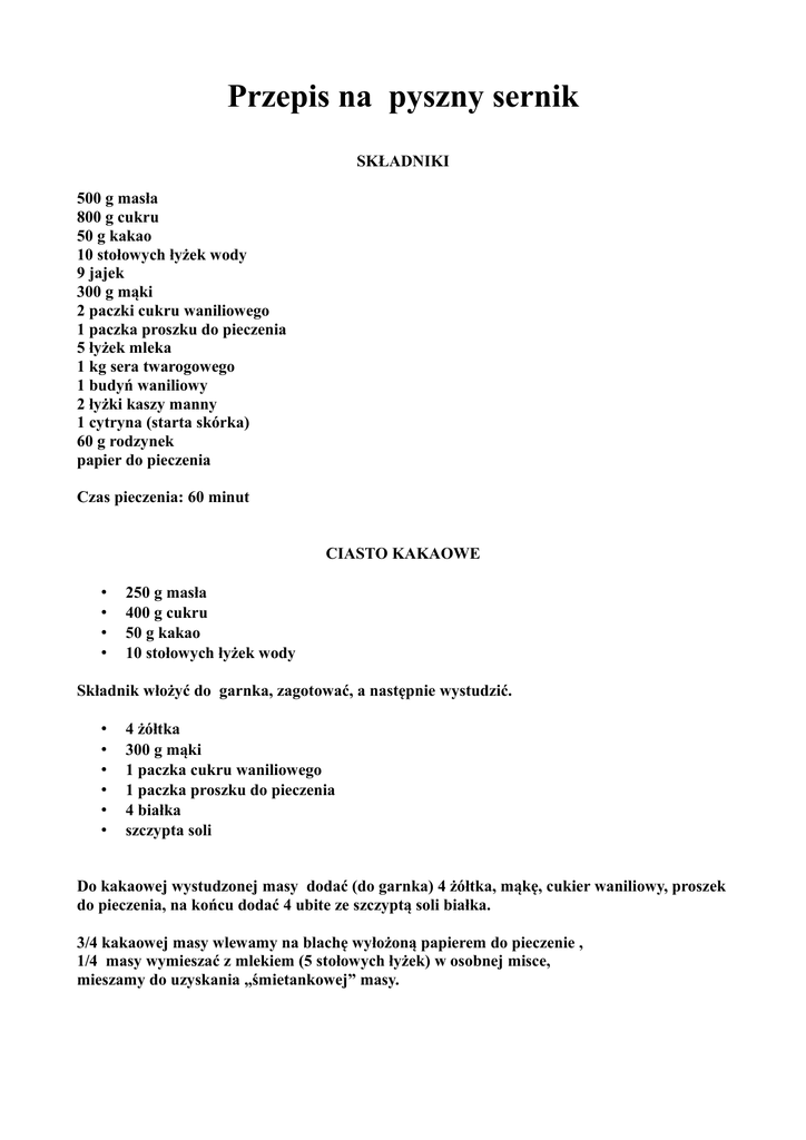 Przepis na pyszny sernik SKŁADNIKI 500 g masła 800 g cukru 50 g kakao 10 stołowych łyżek wody 9 jajek 300 g mąki 2 paczki cukru waniliowego 1 paczka proszku do pieczenia 5 łyżek mleka 1 kg sera twarogowego 1 budyń waniliowy 2 łyżki kaszy manny 1 cytryna (starta skórka) 60 g rodzynek papier do pieczenia Czas pieczenia: 60 minut CIASTO KAKAOWE • • • • 250 g masła 400 g cukru 50 g kakao 10 stołowych łyżek wody Składnik włożyć do garnka, zagotować, a następnie wystudzić. • • • • • • 4 żółtka 300 g mąki 1 paczka cukru waniliowego 1 paczka proszku do pieczenia 4 białka szczypta soli Do kakaowej wystudzonej masy dodać (do garnka) 4 żółtka, mąkę, cukier waniliowy, proszek do pieczenia, na końcu dodać 4 ubite ze szczyptą soli białka. 3/4 kakaowej masy wlewamy na blachę wyłożoną papierem do pieczenie , 1/4 masy wymieszać z mlekiem (5 stołowych łyżek) w osobnej misce, mieszamy do uzyskania „śmietankowej” masy. MASA SEROWA • • • • • • • 250 g masła 5 żółtek 400 g cukru 1 cukier waniliowy 1 kg sera twaróg 5 białek szczypta soli 5 żółtek, masło, cukier, cukier waniliowy mieszamy w dzieży 4,82 L, 10 min mieszadłem płaskim w mikserze KichenAid przy prędkości 4. Dodajemy twaróg przy prędkości 2 mieszamy ok 1 minuty. • • • • 1 budyń waniliowy 2 łyżki kaszy manny starta skórka cytrynowa rodzynki Następnie do masy serowej przy prędkości 1 dodajemy budyń, kaszę, skórkę i rodzynki. 5 białek ubijamy (w drugiej szklanej dzieży) na sztywno z szczyptą soli rózgą w mikserze KichenAid przy prędkości 6. Ubite białka delikatnie wmieszać do masy serowej. Masę serową wlewamy na kakaowe ciasto i delikatnie zalewamy 1/4 pozostałego kakaowego ciasta. Wkładamy do piekarnika. 40 minut ciasto pieczemy w temperaturze 180 st. , zmniejszamy temperaturę do 150 st. C i pieczemy jeszcze 20 minut. Smacznego !