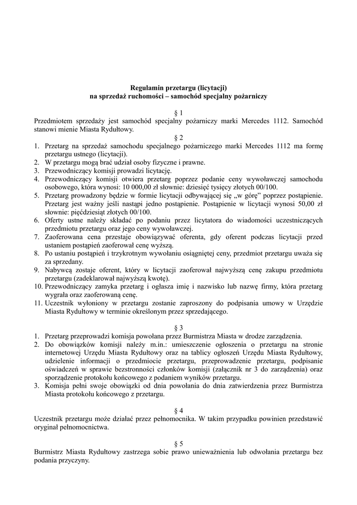Regulamin przetargu (licytacji) na sprzedaż ruchomości – samochód specjalny pożarniczy §1 Przedmiotem sprzedaży jest samochód specjalny pożarniczy marki Mercedes 1112. Samochód stanowi mienie Miasta Rydułtowy. §2 1. Przetarg na sprzedaż samochodu specjalnego pożarniczego marki Mercedes 1112 ma formę przetargu ustnego (licytacji). 2. W przetargu mogą brać udział osoby fizyczne i prawne. 3. Przewodniczący komisji prowadzi licytację. 4. Przewodniczący komisji otwiera przetarg poprzez podanie ceny wywoławczej samochodu osobowego, która wynosi: 10 000,00 zł słownie: dziesięć tysięcy złotych 00/100. 5. Przetarg prowadzony będzie w formie licytacji odbywającej się „w górę” poprzez postąpienie. Przetarg jest ważny jeśli nastąpi jedno postąpienie. Postąpienie w licytacji wynosi 50,00 zł słownie: pięćdziesiąt złotych 00/100. 6. Oferty ustne należy składać po podaniu przez licytatora do wiadomości uczestniczących przedmiotu przetargu oraz jego ceny wywoławczej. 7. Zaoferowana cena przestaje obowiązywać oferenta, gdy oferent podczas licytacji przed ustaniem postąpień zaoferował cenę wyższą. 8. Po ustaniu postąpień i trzykrotnym wywołaniu osiągniętej ceny, przedmiot przetargu uważa się za sprzedany. 9. Nabywcą zostaje oferent, który w licytacji zaoferował najwyższą cenę zakupu przedmiotu przetargu (zadeklarował najwyższą kwotę). 10. Przewodniczący zamyka przetarg i ogłasza imię i nazwisko lub nazwę firmy, która przetarg wygrała oraz zaoferowaną cenę. 11. Uczestnik wyłoniony w przetargu zostanie zaproszony do podpisania umowy w Urzędzie Miasta Rydułtowy w terminie określonym przez sprzedającego. §3 1. Przetarg przeprowadzi komisja powołana przez Burmistrza Miasta w drodze zarządzenia. 2. Do obowiązków komisji należy m.in.: umieszczenie ogłoszenia o przetargu na stronie internetowej Urzędu Miasta Rydułtowy oraz na tablicy ogłoszeń Urzędu Miasta Rydułtowy, udzielenie informacji o przedmiocie przetargu, przeprowadzenie przetargu, podpisanie oświadczeń w sprawie bezstronności członków komisji (załącznik nr 3 do zarządzenia) oraz sporządzenie protokołu końcowego z podaniem wyników przetargu. 3. Komisja pełni swoje obowiązki od dnia powołania do dnia zatwierdzenia przez Burmistrza Miasta protokołu końcowego z przetargu. §4 Uczestnik przetargu może działać przez pełnomocnika. W takim przypadku powinien przedstawić oryginał pełnomocnictwa. §5 Burmistrz Miasta Rydułtowy zastrzega sobie prawo unieważnienia lub odwołania przetargu bez podania przyczyny.