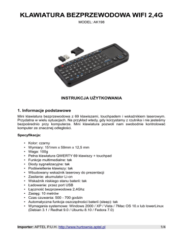 KLAWIATURA BEZPRZEWODOWA WIFI 2,4G MODEL: AK198 INSTRUKCJA UŻYTKOWANIA 1. Informacje podstawowe Mini klawiatura bezprzewodowa z 69 klawiszami, touchpadem i wskaźnikiem laserowym. Przydatna w wielu sytuacjach. Na przykład wtedy, gdy korzystamy z rzutnika i nie jesteśmy bezpośrednio przy komputerze. Mini klawiatura pozwoli nam swobodnie kontrolować komputer ze znacznej odległości. Specyfikacja: • • • • • • • • • • • • • • • • Kolor: czarny Wymiary: 151mm x 59mm x 12,5 mm Waga: 100g Pełna klawiatura QWERTY 69 klawiszy + touchpad Funkcje multimedialne: tak Diody sygnalizacyjne: tak Podświetlenie klawiszy: tak Wbudowany wskaźnik laserowy do prezentacji Zasilanie: akumulator Li-on Wskaźnik niskiego stanu baterii: tak Ładowanie: przez port USB Łączność bezprzewodowa 2,4Ghz Zasięg: 10 metrów Czas czuwania: 500 - 700 godzin Automatyczna funkcja oszczędności baterii (sleep): tak Wymagania systemowe: Windows 2000 / XP / Vista / 7Mac OS 10.x lub lowerLinux (Debian 3.1 / Redhat 9.0 / Ubuntu 8.10 / Fedora 7.0) Importer: APTEL P.U.H. http://www.hurtownia.aptel.pl 1/4 2. Informacje bezpieczeństwa • • • W tym urządzeniu zastosowano akumulator li-on. Nie zanurzać klawiatury w wodzie, nie pozostawiać w wilgotnym środowisku, w przeciwnym razie urządzenie zostanie uszkodzone. Otwieranie urządzenia i samodzielna wymiana akumulatora grozi utratą gwarancji. Akumulator samoczynnie się rozładowuje po długim czasie nieużywania – jest to zjawisko normalnie i nie podlega reklamacji. • • • Nie używać klawiatury w czasie prowadzenia samochodu. Urządzenie chronić przed ciepłem, bezpośrednim promieniowaniem słonecznym. Czyścić za pomocą czystej, lekko wilgotnej szmatki bez użycia mocnych detergentów. • Te urządzenie wyposażone jest w nadajnik/odbiornik sygnału radiowego – należy wyłączyć je przed wejściem na pokład samolotu. Nie używać urządzenia w strefach oznaczonych jako "zakaz używania urządzeń korzystających z łączności bezprzewodowej" lub podobnych. • 3. Użytkowanie urządzenia Touchpad może być używany w pozycji poziomej i pionowej. Aby zmienić pozycję naciśnij jednoczeście klawisz Fn i lewy ALT. Podłączanie nadajnika USB – wysuń nadajnik z klawiatury i włóż go do wolnego portu USB komputera. Poczekaj chwilę aż system zakomunikuje poprawną instalację sterowników. Następnie włącz klawiaturę i sprawdź poprawność jej działania. Podświetlenie klawiszy pomaga użytkować klawiaturę w niedostatecznym oświetleniu. Aby włączać/wyłączać podświetlenie klawiszy naciśnij przycisk opisany na diagramie jako "Włącznik podświetlenia". Klawiatura obsługuje funkcję automatycznego usypiania (oszczędzania energii) która zaczyna działać gdy przez dluższy okres czasu nie naciśnięto żadnego klawisza na Importer: APTEL P.U.H. http://www.hurtownia.aptel.pl 2/4 klawiaturze. Klawiatura wzbudza się automatycznie po naciśnięciu dowolnego klawisza. Po skończeniu używania klawiatury wyłącz ją, a następnie wyjmij nadajnik USB z komputera i włóż jgo w odpowiednie miejsce w klawiaturze. Ładowanie akumulatora klawiatury odbywa się poprzez podłączenie jej dołączonym kablem USB do wolnego portu komputera. Klawiaturę można używać podczas ładowania. Informacja: przed pierwszym użyciem klawiatury naładuj akumulator do pełna (czas ładowania około 2 godziny). Informacja: Migająca dioda niskiego stanu zasilania oznacza, że klawiaturę należy podłączyć do ładowania. Aby użyć wskaźnika laserowego (klawiatura nie musi być włączona) należy nacisnąć i przytrzymać przycisk oznaczony na diagramie jako "włącznik lasera". Ważne: NIGDY NIE KIERUJ PROMIENIA LASEROWEGO BEZPOŚREDNIO NA OCZY LUDZI I ZWIERZĄT! 4. Rozwiązywanie problemów W przypadku, gdy klawiatura nie działa prawidłowo, przed skontaktowaniem się z serwisem skontroluj: PROBLEM PRZYCZYNA ROZWIĄZANIE Klawiatura nie reaguje na naciskanie klawiszy 1. Rozładowany akumulator 2. Klawiatura nie jest włączona 1. Ładuj klawiaturę minimum 15 minut. 2. Sprawdź czy "włącznik" jest w pozycji "ON" Klawiatura nie może się 1. Nadajnik może nie być połączyć z nadajnikiem USB odpowiednio włożony do portu USB. 2. Inne urządzenie bezprzewodowe zakłóca transmisję. 1. Wyjmij i ponownie włóż nadajnik w port USB lub użyj innego portu USB komputera. 2. Zmień kanał transmisji przez naciśnięcie i przytrzymanie klawiszy Fn+F1 przez minimum 10 sekund. Wskaźnik myszy porusza się 1. Klawiatura znajduje się chaotycznie, lub w ogole się zbyt daleko od nadajnika. nie porusza 2. Touchpad został zanieczyszczony przez kurz lub olej. 1. Zmniejsz dystans dzielący klawiaturę i nadajnik USB. 2. Wyczyść touchpad za pomocą wilgotnej ściereczki. Akumulator klawiatury nie ładuje się 1. Skontaktuj się z serwisem w celu wymiany. 2. Sprawdź poprawność połączenia i sam kabel USB. 1. Uszkodzony akumulator. 2. Złe połączenie/ uszkodzony kabel USB Importer: APTEL P.U.H. http://www.hurtownia.aptel.pl 3/4 Jeśli klawiatura nie działa prawidłowo nawet po tych interwencjach, należy skontaktować się z dostawcą lub autoryzowanym centrum serwisowym. Importer: APTEL P.U.H. http://www.hurtownia.aptel.pl 4/4