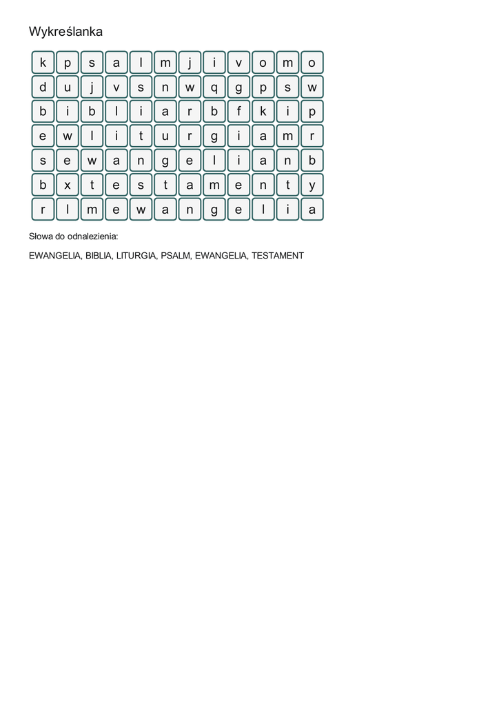 Wykreślanka k p s a l m j i v o m o d u j v s n w q g p s w b i b l i a r b f k i p e w l i t u r g i a m r s e w a n g e l i a n b b x t e s t a m e n t y r l m e w a n g e l i a Słowa do odnalezienia: EWANGELIA, BIBLIA, LITURGIA, PSALM, EWANGELIA, TESTAMENT