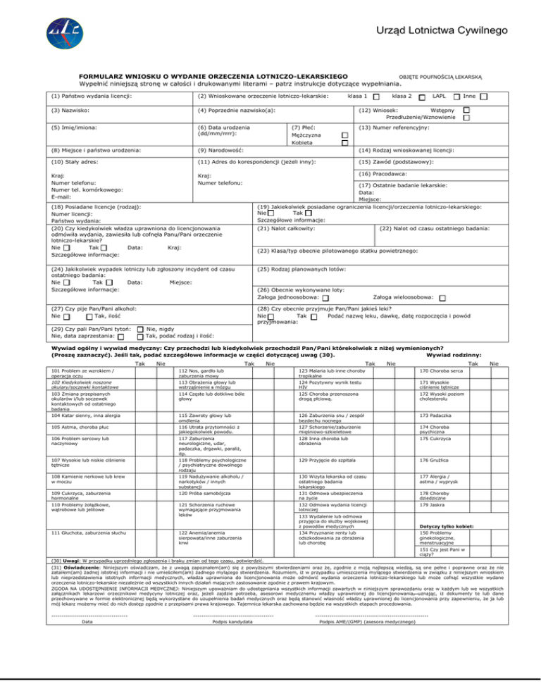 Urząd Lotnictwa Cywilnego FORMULARZ WNIOSKU O WYDANIE ORZECZENIA LOTNICZO-LEKARSKIEGO OBJĘTE POUFNOŚCIĄ LEKARSKĄ Wypełnić niniejszą stronę w całości i drukowanymi literami – patrz instrukcje dotyczące wypełniania. (1) Państwo wydania licencji: (2) Wnioskowane orzeczenie lotniczo-lekarskie: (3) Nazwisko: (4) Poprzednie nazwisko(a): (5) Imię/imiona: (6) Data urodzenia (dd/mm/rrrr): klasa 1 klasa 2 LAPL Inne (12) Wniosek: Wstępny Przedłużenie/Wznowienie (7) Płeć: (13) Numer referencyjny: Mężczyzna Kobieta (8) Miejsce i państwo urodzenia: (9) Narodowość: (14) Rodzaj wnioskowanej licencji: (10) Stały adres: (11) Adres do korespondencji (jeżeli inny): (15) Zawód (podstawowy): Kraj: Numer telefonu: Numer tel. komórkowego: E-mail: Kraj: Numer telefonu: (16) Pracodawca: (17) Ostatnie badanie lekarskie: Data: Miejsce: (19) Jakiekolwiek posiadane ograniczenia licencji/orzeczenia lotniczo-lekarskiego: Nie Tak Szczegółowe informacje: (18) Posiadane licencje (rodzaj): Numer licencji: Państwo wydania: (20) Czy kiedykolwiek władza uprawniona do licencjonowania odmówiła wydania, zawiesiła lub cofnęła Panu/Pani orzeczenie lotniczo-lekarskie? Nie Tak Data: Kraj: Szczegółowe informacje: (21) Nalot całkowity: (23) Klasa/typ obecnie pilotowanego statku powietrznego: (24) Jakikolwiek wypadek lotniczy lub zgłoszony incydent od czasu ostatniego badania: Nie Tak Data: Miejsce: Szczegółowe informacje: (25) Rodzaj planowanych lotów: (26) Obecnie wykonywane loty: Załoga jednoosobowa: (27) Czy pije Pan/Pani alkohol: Nie Tak, ilość (29) Czy pali Pan/Pani tytoń: Nie, data zaprzestania: (22) Nalot od czasu ostatniego badania: Załoga wieloosobowa: (28) Czy obecnie przyjmuje Pan/Pani jakieś leki? Nie Tak Podać nazwę leku, dawkę, datę rozpoczęcia i powód przyjmowania: Nie, nigdy Tak, podać rodzaj i ilość: Wywiad ogólny i wywiad medyczny: Czy przechodzi lub kiedykolwiek przechodził Pan/Pani którekolwiek z niżej wymienionych? (Proszę zaznaczyć). Jeśli tak, podać szczegółowe informacje w części dotyczącej uwag (30). Wywiad rodzinny: Tak Nie Tak Nie Tak Nie Tak 101 Problem ze wzrokiem / operacja oczu 112 Nos, gardło lub zaburzenia mowy 123 Malaria lub inne choroby tropikalne 170 Choroba serca 102 Kiedykolwiek noszone okulary/soczewki kontaktowe 113 Obrażenia głowy lub wstrząśnienie s mózgu 124 Pozytywny wynik testu HIV 171 Wysokie ciśnienie tętnicze 103 Zmiana przepisanych okularów i/lub soczewek kontaktowych od ostatniego badania 114 Częste lub dotkliwe bóle głowy 125 Choroba przenoszona drogą płciową. 172 Wysoki poziom cholesterolu 104 Katar sienny, inna alergia 115 Zawroty głowy lub omdlenia 126 Zaburzenia snu / zespół bezdechu nocnego 173 Padaczka 105 Astma, choroba płuc 116 Utrata przytomności z jakiegokolwiek powodu. 127 Schorzenie/zaburzenie mięśniowo-szkieletowe 174 Choroba psychiczna 106 Problem sercowy lub naczyniowy 117 Zaburzenia neurologiczne, udar, padaczka, drgawki, paraliż, itp. 128 Inna choroba lub obrażenia 175 Cukrzyca 107 Wysokie lub niskie ciśnienie tętnicze 118 Problemy psychologiczne / psychiatryczne dowolnego rodzaju 129 Przyjęcie do szpitala 176 Gruźlica 108 Kamienie nerkowe lub krew w moczu 119 Nadużywanie alkoholu / narkotyków / innych substancji 130 Wizyta lekarska od czasu ostatniego badania lekarskiego 177 Alergia / astma / wyprysk 109 Cukrzyca, zaburzenia hormonalne 120 Próba samobójcza 131 Odmowa ubezpieczenia na życie 178 Choroby dziedziczne 110 Problemy żołądkowe, wątrobowe lub jelitowe 121 Schorzenia ruchowe wymagające przyjmowania leków 132 Odmowa wydania licencji lotniczej 179 Jaskra 133 Wydalenie lub odmowa przyjęcia do służby wojskowej z powodów medycznych Dotyczy tylko kobiet: 122 Anemia/anemia sierpowata/inne zaburzenia krwi 134 Przyznanie renty lub odszkodowania za obrażenia lub chorobę 150 Problemy ginekologiczne, menstruacyjne 111 Głuchota, zaburzenia słuchu Nie 151 Czy jest Pani w ciąży? (30) Uwagi: W przypadku uprzedniego zgłoszenia i braku zmian od tego czasu, potwierdzić. (31) Oświadczenie: Niniejszym oświadczam, że z uwagą zapoznałem(am) się z powyższymi stwierdzeniami oraz że, zgodnie z moją najlepszą wiedzą, są one pełne i poprawne oraz że nie zataiłem(am) żadnej istotnej informacji i nie umieściłem(am) żadnego mylącego stwierdzenia. Rozumiem, iż w przypadku umieszczenia mylącego stwierdzenia w związku z niniejszym wnioskiem lub nieprzedstawienia istotnych informacji medycznych, władza uprawniona do licencjonowania może odmówić wydania orzeczenia lotniczo-lekarskiego lub może cofnąć wszystkie wydane orzeczenia lotniczo-lekarskie niezależnie od wszystkich innych działań mających zastosowanie zgodnie z prawem krajowym. ZGODA NA UDOSTĘPNIENIE INFORMACJI MEDYCZNEJ: Niniejszym upoważniam do udostępniania wszystkich informacji zawartych w niniejszym sprawozdaniu oraz w każdym lub we wszystkich załącznikach lekarzowi orzecznikowi medycyny lotniczej oraz, jeżeli zajdzie potrzeba, asesorowi medycznemu władzy uprawnionej do licencjonowania, uznając, iż dokumenty te lub dane przechowywane w formie elektronicznej będą wykorzystane do uzupełnienia badań medycznych oraz będą stanowić własność władzy uprawnionej do licencjonowania przy zapewnieniu, że ja lub mój lekarz możemy mieć do nich dostęp zgodnie z przepisami prawa krajowego. Tajemnica lekarska zachowana będzie na wszystkich etapach procedowania. ------------------------------------Data --------------------------------------Podpis kandydata ------------------------------------------------------Podpis AME/(GMP) (asesora medycznego)