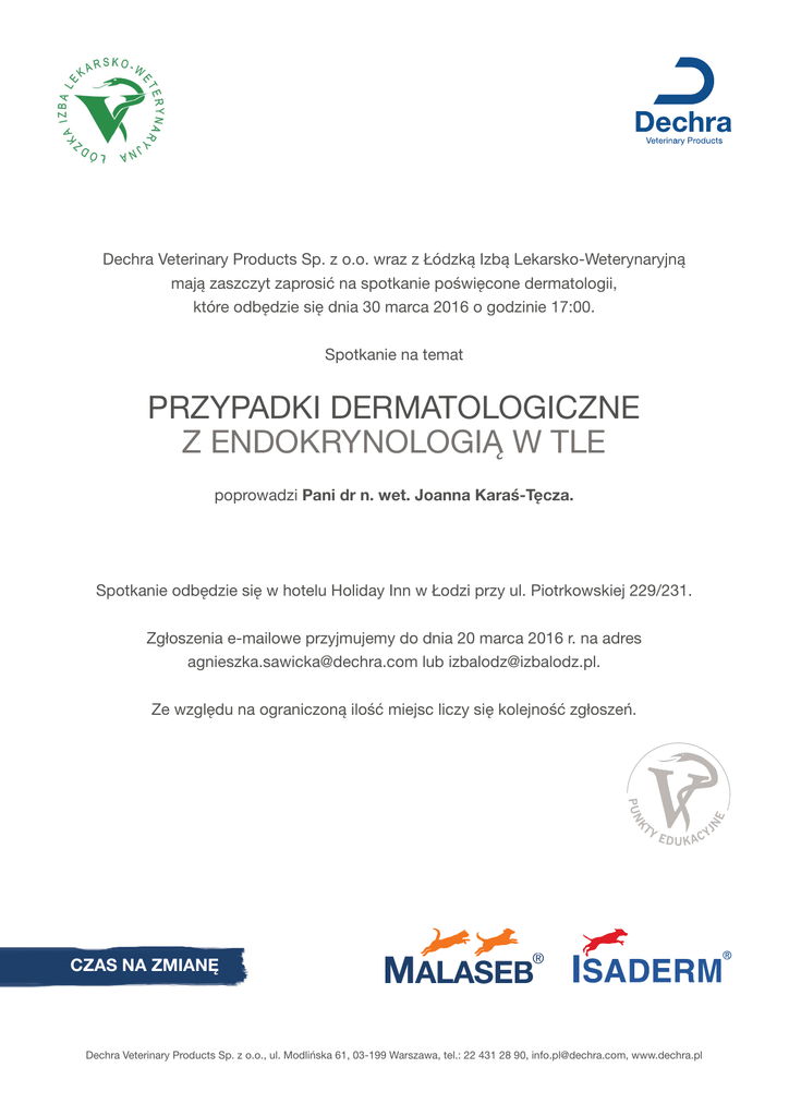 Dechra Veterinary Products Sp. z o.o. wraz z Łódzką Izbą Lekarsko-Weterynaryjną mają zaszczyt zaprosić na spotkanie poświęcone dermatologii, które odbędzie się dnia 30 marca 2016 o godzinie 17:00. Spotkanie na temat PRZYPADKI DERMATOLOGICZNE Z ENDOKRYNOLOGIĄ W TLE poprowadzi Pani dr n. wet. Joanna Karaś-Tęcza. Spotkanie odbędzie się w hotelu Holiday Inn w Łodzi przy ul. Piotrkowskiej 229/231. Zgłoszenia e-mailowe przyjmujemy do dnia 20 marca 2016 r. na adres [email protected] lub [email protected]. Ze względu na ograniczoną ilość miejsc liczy się kolejność zgłoszeń. CZAS NA ZMIANĘ ® MALASEB B Dechra Veterinary Products Sp. z o.o., ul. Modlińska 61, 03-199 Warszawa, tel.: 22 431 28 90, [email protected], www.dechra.pl