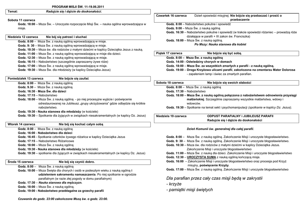 PROGRAM MISJI ŚW. 11-19.06.2011 Temat: Radujcie się i dążcie do doskonałości. Dzień spowiedzi misyjnej: Nie bójcie się przebaczać i prosić o przebaczenie Godz. 8:00 – Nabożeństwo pokutne i spowiedź Godz. 9:00 – Msza Św. z nauką ogólną Godz. 16:30 – Nabożeństwo pokutne i spowiedź (w trakcie spowiedzi różaniec – prowadzą róże działające w parafii + III zakon św. Franciszka) Godz. 18:00 – Msza Św. z nauką ogólną. Po Mszy: Nauka stanowa dla kobiet Czwartek 16 czerwca Sobota 11 czerwca Godz. 18:00 – Msza Św. – Uroczyste rozpoczęcie Misji Św. – nauka ogólna wprowadzająca w misje. Niedziela 12 czerwca Nie bój się patrzeć i słuchać Godz. 8:00 – Msza Św. z nauką ogólną wprowadzającą w misje. Godz. 9: 30 – Msza Św. z nauką ogólną wprowadzającą w misje. Godz. 10:30 – Msza św. dla rodziców z małymi dziećmi w kaplicy Dzieciątka Jezus z nauką. Godz. 11:00 – Msza Św. z nauką ogólną wprowadzającą w misje dla dzieci. Godz. 12:30 – Msza Św. z nauką ogólną wprowadzającą w misje. Godz. 16:15 – Nabożeństwo (szczególnie zapraszamy żywe róże) Godz. 17:00 – Msza Św. z nauką ogólną wprowadzającą w misje. Godz. 19:30 – Msza Św. dla młodzieży (w kaplicy Dzieciątka Jezus) Poniedziałek 13 czerwca Nie bójcie się zaufać Godz. 8:00 – Msza Św. z nauką ogólną Godz. 9.30 – Msza Św. z nauką ogólną Godz. 16:30 - Msza Św. dla dzieci Godz. 17:15 – Nabożeństwo Godz. 18:00 – Msza Św. z nauką ogólną - po niej procesyjne wyjście i poświęcenie odrestaurowanej na Jubileusz „grupy ukrzyżowania” gdzie odbędzie się krótkie nabożeństwo. Godz. 19:30 - Nauka stanowa dla młodzieży (w kościele) Godz. 19:30 – Spotkanie dla żyjących w związkach niesakramentalnych (w kaplicy Dz. Jezus) Wtorek 14 czerwca Nie bój się kochać całym sobą Godz. 8:00 – Msza Św. z nauką ogólną Godz. 16:00 - Nabożeństwo dla dzieci Godz. 16:45 - Spotkanie członków żywego różańca w kaplicy Dzieciątka Jezus Godz. 17:15 – Nabożeństwo Różańcowe Godz. 18:00 – Msza Św. z nauką ogólną Godz. 19:30 - Nauka stanowa dla młodzieży (w kościele) Godz. 19:30 – spotkanie dla żyjących w związkach niesakramentalnych (w kaplicy Dz. Jezus) Środa 15 czerwca Nie bój się czynić dobro. Godz. 8:00 – Msza Św. z nauką ogólną Godz. 10:00 – Msza Święta dla chorych i osób w podeszłym wieku z nauką ogólną i udzieleniem sakramentu namaszczenia. Po niej spotkanie w ogrodzie parafialnym (w razie złej pogody w domu parafialnym) Godz. 17:30 – Nauka stanowa dla mężczyzn. Godz. 18:00 – Msza Św. z nauką ogólną. Godz. 19:00 - Nabożeństwo przebłagalne za grzechy parafii Czuwanie do godz. 23:00 zakończone Mszą św. o godz. 23:00. Piątek 17 czerwca Nie bójcie się być sobą. Godz. 8:00 – Msza Św. z nauką ogólną Godz. 14:00 - Odwiedziny chorych w domach Godz. 18:00 – Msza Św. za wszystkich zmarłych z parafii - z nauką ogólną. Godz. 19:00 – Droga Krzyżowa ulicami parafii, zakończona na cmentarzu Mater Dolorosa - zapaleniem lamp i świec za zmarłych parafian. Sobota 18 czerwca Nie bójcie się swoich słabości Godz. 8:00 – Msza Św. z nauką ogólną Godz. 17:30 – Nabożeństwo Godz. 18:00 – Msza Św. z nauką ogólną połączona z nabożeństwem odnowienia przysięgi małżeńskiej. Szczególnie zapraszamy wszystkie małżeństwa, wdowy i wdowców. Godz. 19:30 – Spotkanie na temat sekt i psychomanipulacji (spotkanie w kaplicy Dz. Jezus). Niedziela 19 czerwca ODPUST PARAFIALNY i JUBILEUSZ PARAFII Radujcie się i dążcie do doskonałości Dzień Komunii św. generalnej dla całej parafii. Godz. 8:00 – Msza Św. z nauką ogólną. Zakończenie Misji i uroczyste błogosławieństwo. Godz. 9: 30 – Msza Św. z nauką ogólną. Zakończenie Misji i uroczyste błogosławieństwo. Godz. 10:30 – Msza św. dla rodziców z małymi dziećmi w kaplicy Dzieciątka Jezus. Zakończenie Misji i uroczyste błogosławieństwo Godz. 11:00 – Msza Św. z nauką dla dzieci. Zakończenie Misji i uroczyste błogosławieństwo Godz. 12:30 – UROCZYSTA SUMA z nauką ogólną kończącą misje. Godz. 16:00 – Zakończenie Misji i uroczyste błogosławieństwo oraz procesja pod Krzyż misyjny, poświęcenie Krzyży. Godz. 17:00 – Msza Św. z nauką ogólną. Zakończenie Misji i uroczyste błogosławieństwo Dla parafian przez cały czas misji będą w zakrystii - krzyże - pamiątki misji świętych Misje święte są szczególnym rodzajem otwartych rekolekcji. W parafii przeprowadza się je zazwyczaj co dziesięć lat. Misje to wyjątkowy czas szukania i poznawania Boga, odkrywania Jego miłości, otwierania przed Nim swego serca i rozpoznawania Jego woli w swoim życiu. To czas myślenia i refleksji, a niejednokrotnie rozrachunku z własnym sumieniem w obliczu prawdy o miłosierdziu Boga względem człowieka, względem mnie samego. To wreszcie czas naprawiania relacji z ludźmi, z którymi żyjemy, pracujemy, których kochamy i których nie akceptujemy, osób bliższych i dalszych naszemu sercu. Misje to czas uświadomienia sobie, że jesteśmy kochani przez Boga, że On w swej niezmierzonej miłości posłał swojego Syna, Jezusa Chrystusa, który na Krzyżu oddał swoje życie za każdego z nas, i że Jezus zmartwychwstał, abyśmy na mogli na wieki z Nim przebywać w Jego królestwie. Misje to czas odkrywania, że Jezus Chrystus przywrócił nam życie, wolność i godność dzieci Bożych przez swą ofiarę Krzyża, dał umocnienie pochodzące od Ducha Świętego, który udziela nam potrzebnych łask i darów. Misje to czas rodzenia się wdzięczności i tęsknoty za dobrym Bogiem, zwłaszcza w obliczu uświadomienia sobie swojej grzeszności i małości. To czas nawrócenia czyli do powrotu do Boga, zarówno tych osób, które uważają się za gorliwych chrześcijan, jak i tych, którzy prowadzą życie z dala od Boga. Jest to więc czas uznania swoi