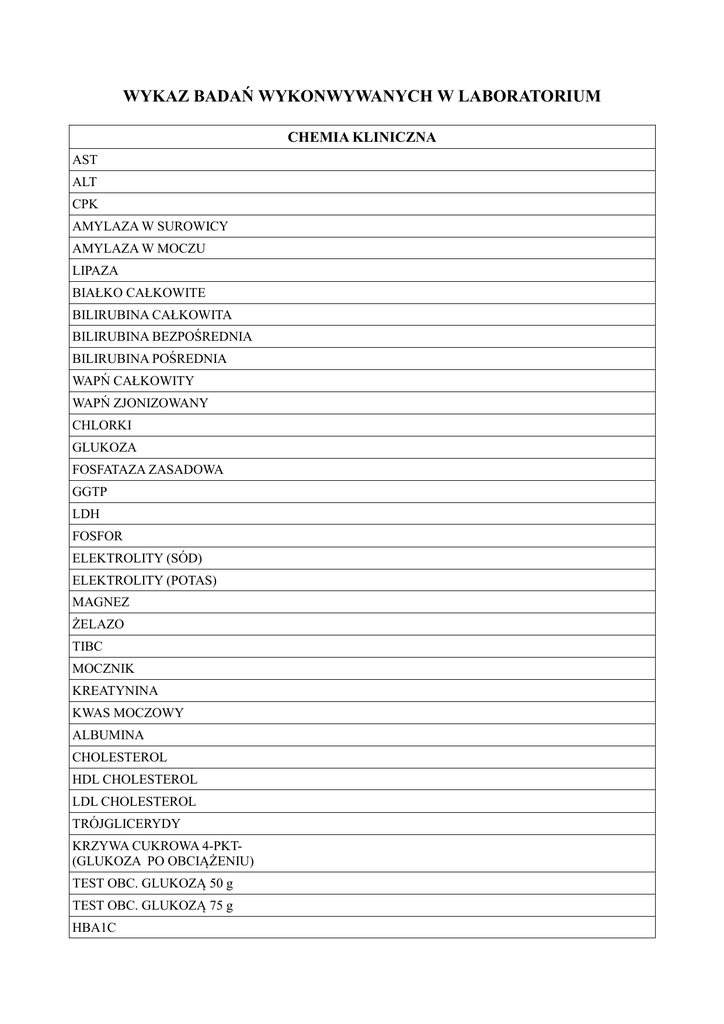 WYKAZ BADAŃ WYKONWYWANYCH W LABORATORIUM CHEMIA KLINICZNA AST ALT CPK AMYLAZA W SUROWICY AMYLAZA W MOCZU LIPAZA BIAŁKO CAŁKOWITE BILIRUBINA CAŁKOWITA BILIRUBINA BEZPOŚREDNIA BILIRUBINA POŚREDNIA WAPŃ CAŁKOWITY WAPŃ ZJONIZOWANY CHLORKI GLUKOZA FOSFATAZA ZASADOWA GGTP LDH FOSFOR ELEKTROLITY (SÓD) ELEKTROLITY (POTAS) MAGNEZ ŻELAZO TIBC MOCZNIK KREATYNINA KWAS MOCZOWY ALBUMINA CHOLESTEROL HDL CHOLESTEROL LDL CHOLESTEROL TRÓJGLICERYDY KRZYWA CUKROWA 4-PKT(GLUKOZA PO OBCIĄŻENIU) TEST OBC. GLUKOZĄ 50 g TEST OBC. GLUKOZĄ 75 g HBA1C RÓWNOWAGA KWASOWO-ZASADOWA RKZ GAZOMETRIA HEMATOLOGIA OB MORFOLOGIA 18 PARAM. ROZMAZ KRWI MIKROSKOPOWY RETIKULOCYTY EOZYNOFILIA ANALITYKA OGÓLNA MOCZ – BAD. OGÓLNE MOCZ- BIAŁKO MOCZ-CUKIER MOCZ-WAPŃ MOCZ-FOSFOR MOCZ- AMYLAZA MIKROALBUMINY PŁYN MÓZGOWO RDZENIOWY PŁYN Z JAM CIAŁA KLIRENS KREATYNINY BADANIE KAŁU OGÓLNE KAŁ- KREW UTAJONA BEZ DIETY TEST CIĄŻOWY PARAZYTOLOGIA BADANIE KAŁU NA PASOŻYTY BADANIE NA OWSIKI BIAŁKO LAMBLII W KALE (ANTYGEN GSA) WIRUSOLOGIA HBS Ag P/ciała HIV1+2 P/ciała HCV SEROLOGIA TRANSFUZJOLOGICZNA OZNACZENIE GRUPY KRWI I ozn. OZNACZENIE GRUPY KRWI II ozn. OZNACZENIE GRUPY KRWI-bad.jedn.(noworodki) PRÓBA ZGODNOŚCI KRZYŻOWEJ 1 JEDN. PRÓBA ZGODNOŚCI KRZYŻOWEJ-KOLEJNA JED. BTA- BEZPOŚR. TEST ANTYGLOB. PTA- POŚREDNI TEST ANTYGLOB. KREWKARTA IMMUNOCHEMIA TSH FT4 FT3 FSH LH PROGESTERON TESTOSTERON ESTRADIOL PROLAKTYNA CA125 CEA CA19-9 Beta-HCG PSA TROPONINA T hs PRZECIWCIAŁA ANTY- TPO PRZECIWCIAŁA ANTY TG PROKALCYTONINA (PCT) PARATHORMON (PTH) Borelioza IgG Borelioza IgM Toksoplasmosa IgG Toksoplasmosa IgM Różyczka IgG Różyczka IgM TOKSYKOLOGIA AMFETAMINA - AMP MARIHUANA- THC BARBITURANY- BAR ANTYDEPRESANTY TRÓJCYKLICZNE- TCA KOKAINA - COC METADON-MTD METAMFETAMINA -MET ECSTASY-MDMA BENZODIAZEPINY- BZD MORFINA- MOR POZIOM ALKOHOLU WE KRWI TEST WIELOPARAMETROWY NA NARKOTYKI – MULTIDRUG INNE RF ILOŚCIOWO CRP ILOŚCIOWO ASO ILOŚCIOWO ODCZYN WALERA-ROSSEGO VDRL STOPIEŃ CZYSTOSCI GINEKOL. HELIKOBACTER PYLORI IgG PRZECIWCIAŁA W SUROWICY HELIKOBACTER PYLORI ANTYGEN W KALE TEST NA MONONUKLEOZĘ