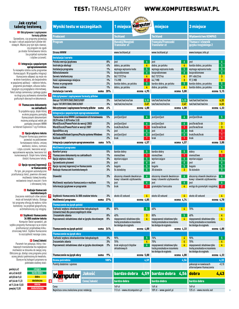 test: translatory Jak czytać tabelę testową Odczytywane i zapisywane formaty plików Sprawdzono, czy programy pozwalają na zapis i odczyt popularnych plików tekstowych. Ważne przy tym było również, czy program nie zgubi po drodze formatowania tekstu (na przykład rozmiarów i stylów czcionek). WWW.KOMPUTERSWIAT.PL Wyniki testu w szczegółach 1 miejsce 2 miejsce 3 miejsce Producent Techland Techland Wydawnictwo KOMPAS Program Russkij/Rosyjski Translator xt Français/Francuski Translator xt Tłumacz i słownik języka rosyjskiego 2 Strona WWW www.techland.pl www.techland.pl www.kompas.info.pl 8% 4% 1% 1% 2% 1% 2% 1% 20% jest 6 dobra, po polsku 4 wymaga wpisania kodu 5 bezproblemowe 6 062 7372746 4 114 MB 2 bardzo dobra, po polsku 5 dobra, po polsku 4 ocena 4,95 jest 6 dobra, po polsku 4 wymaga wpisania kodu 5 bezproblemowe 6 062 7372746 4 64,7 MB 3 bardzo dobra, po polsku 5 dobra, po polsku 4 ocena 5,00 jest 6 bardzo dobra, po polsku 5 wymaga wpisania kodu 5 bezproblemowe 6 091 4862246 3 97,3 MB 3 bardzo dobra, po polsku 5 bardzo dobra, po polsku 5 ocena 5,15 3% 3% 6% tak/tak/tak/nie/tak tak/tak/nie/nie/nie 5% jest/jest/jest 2% 2% 1% 2% 2% 14% jest/jest/jest brak/brak/brak jest jest/jest/jest brak 5% 1% 3% 3% 4% 3% bardzo dobry niemożliwe wystarczające jest bogate 54 dziedziny 5 1 5 6 5 5 bardzo dobry niemożliwe wystarczające jest bogate 30 dziedzin 5 1 5 6 5 3 dobry niemożliwe wystarczające jest bogate 56 dziedzin 4 1 5 6 5 5 Słowniki 3% 6 obszerny słownik dwukierunkowy i słowniki użytkownika jest wstęp do gramatyki rosyjskiej 6 1% 1% obszerny słownik dwukierunkowy i słowniki użytkownika jest gramatyka francuska 6 Możliwość wysłania tłumaczenia e-mailem Informacje językowe w programie obszerny słownik dwukierunkowy i słowniki użytkownika jest brak 3% 27% około 45 sekund 8% 80% 8% 8% 40% 3 niepoprawność składniowa tylko 4 trochę przeszkadza w zrozumieniu bez dostępu do oryginału ocena 4,00 1 Instalacja i serwis Polska wersja językowa Instrukcja obsługi Instalacja programu Odinstalowanie Serwis telefoniczny Ilość zajmowanego miejsca Pomoc w programie Pomoc online Instalacja i serwis Integracja z popularnym oprogramowaniem To niezwykle istotna cecha programów tłumaczących. W przypadku integracji tłumaczenie odbywać się może nie w oknie translatora, ale bezpośrednio w popularnej aplikacji – edytorze tekstu, programie pocztowym, arkuszu kalkulacyjnym czy przeglądarce internetowej. suma Tekst zostaje zamieniony z jednego języka na drugi przy zachowaniu elementów 1 Odczytywane i zapisywane formaty plików graficznych obecnych w dokumencie. Odczyt TXT/RTF/DOC/DOCX/ODT Zapis TXT/RTF/DOC/DOCX/ODT 3 Tłumaczone dokumenty Odczytywane i zapisywane formaty plików suma na zakładkach To przydatna opcja, dzięki której 2 Integracja z popularnym oprogramowaniem w oknie programu pomiędzy Tłumaczenie stron WWW z zachowaniem ich formatowania tłumaczonymi dokumentami (IE/Firefox 2.0/Firefox 3.0) możemy przełączać widok jak Word/Excel/PowerPoint do wersji 2003 pomiędzy stronami WWW w Internet Explorerze 7 czy Firefoksie. Word/Excel/PowerPoint w wersji 2007 OpenOffice.org 4 Opcje edytora tekstu MS Outlook/Outlook Express/Poczta systemu Windows Program tłumaczący powinien Outlook 2007 pozwalać na podstawowe Integracja z popularnym oprogramowaniem suma formatowanie tekstu: zmianę wielkości, koloru, rozmiaru Możliwości programu i stylu czcionki, tworzenie wcięć, wyszukiwanie wyrazów, tworzenie list 3 Komfort pracy Tłumaczone dokumenty na zakładkach numerowanych. Dzięki temu łatwiej śledzić tłumaczone teksty. 4 Opcje edytora tekstu Sprawdzanie pisowni 5 Opcje ręcznej ingerencji 5 Opcje ręcznej ingerencji w tłumaczenie w tłumaczenie 6 Rodzaje tłumaczeń kontekstowych Po tym, jak program automatycznie 2 przetłumaczy tekst, powinien oferować możliwości łatwej korekty: wstawienie innych znaczeń i form z oferowanej listy. Rodzaje tłumaczeń kontekstowych Znaczenie niektórych słów zależeć 7 Szybkość tłumaczenia 34 000 znaków tekstu może od tematyki tekstu. Dlatego Możliwości programu suma też programy oferują do wyboru różne Tłumaczenie na język polski konteksty: na przykład geograficzny, Trafność wyboru ekwiwalentów leksykalnych architektoniczny czy religijny. (słownictwa) dla poszczególnych słów 7 Szybkość tłumaczenia Zrozumiałe zdania 34 000 znaków tekstu Poprawność składniowa zdań w języku docelowym Komputer Świat sprawdził, jak szybko programy tłumaczące są w stanie przetłumaczyć przykładowy kilkuTłumaczenie na język polski suma stronicowy tekst. Szybkie tłumaczenie Tłumaczenie na język obcy to oszczędność naszego czasu. Trafność wyboru ekwiwalentów leksykalnych 8 Cena/Jakość Zrozumiałe zdania Parametr ten pokazuje, który z tesPoprawność składniowa zdań w języku docelowym towanych translatorów ma największe możliwości w stosunku do swojej ceny. Obliczono go, dzieląc cenę programu przez Tłumaczenie na język obcy suma ocenę jakości podniesioną do kwadratu. Oceny w tej kategorii przyznano na Ocena pośrednia podstawie osobnej skali: Punkty dodatnie i ujemne 5,33 tak/tak/tak/nie/tak 2,67 tak/tak/nie/nie/nie ocena 4,00 6 6 1 6 6 1 ocena 4,57 6 1 5,33 tak/tak/tak/tak/nie 2,67 tak/tak/tak/tak/nie ocena 4,00 6 jest/jest/jest jest/jest/jest brak/brak/brak jest jest/jest/jest brak 6 1 6 6 1 ocena 4,57 6 4 4,33 4,33 ocena 4,33 5 jest/jest/brak jest/brak/brak jest/brak/brak brak brak/brak/brak brak 3 3 1 1 1 ocena 3,00 6 2 6 poniżej 6,42 od 6,42 do 8,02 od 8,03 do 9,63 od 9,64 do 11,23 od 11,24 do 12,83 powyżej 12,83 celująca bardzo dobra dobra dostateczna mierna niedostateczna 8 24% 3% 3% 3% 90% 70% brak większych błędów składniowych 9% 4 około 40 sekund ocena 4,85 5 60% 4 około 40 sekund ocena 4,74 4 4 ocena 4,70 70% 80% 5 niepoprawność składniowa tylko 4 trochę przeszkadza w zrozumieniu bez dostępu do oryginału ocena 4,33 60% 4 niepoprawno