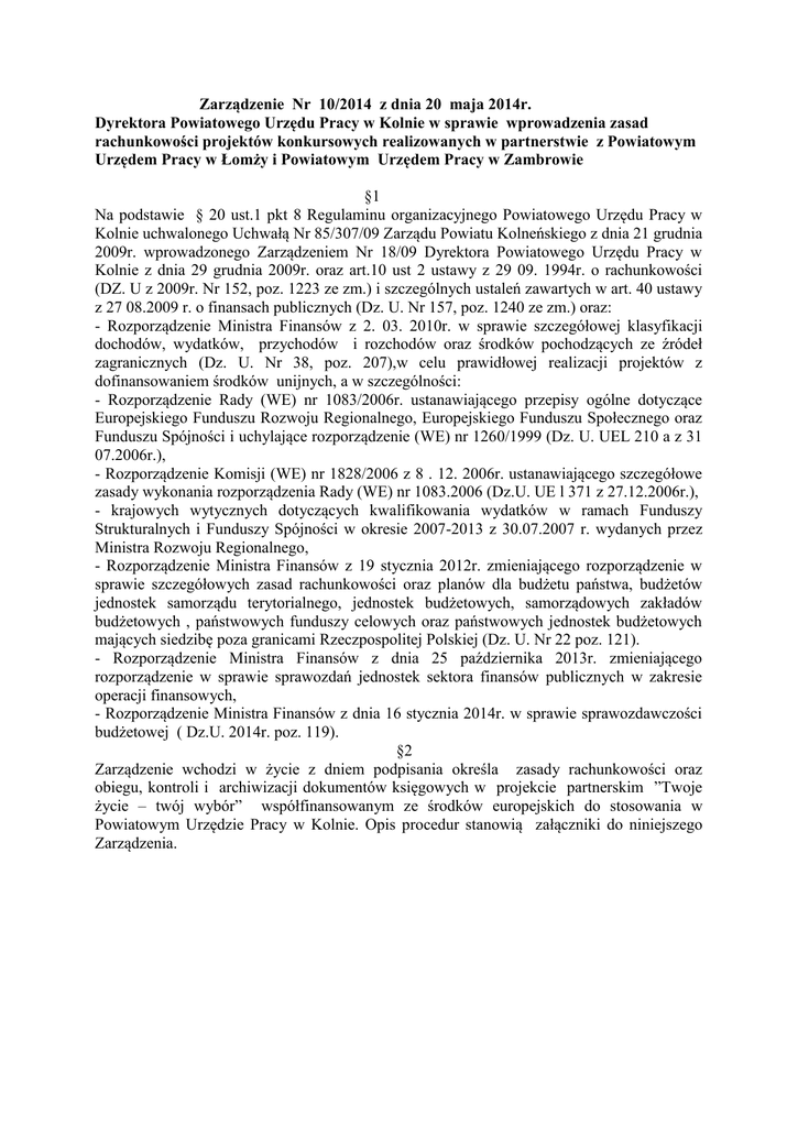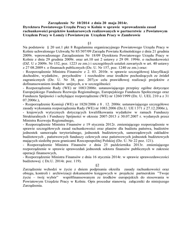 Zarządzenie Nr 10/2014 z dnia 20 maja 2014r. Dyrektora Powiatowego Urzędu Pracy w Kolnie w sprawie wprowadzenia zasad rachunkowości projektów konkursowych realizowanych w partnerstwie z Powiatowym Urzędem Pracy w Łomży i Powiatowym Urzędem Pracy w Zambrowie §1 Na podstawie § 20 ust.1 pkt 8 Regulaminu organizacyjnego Powiatowego Urzędu Pracy w Kolnie uchwalonego Uchwałą Nr 85/307/09 Zarządu Powiatu Kolneńskiego z dnia 21 grudnia 2009r. wprowadzonego Zarządzeniem Nr 18/09 Dyrektora Powiatowego Urzędu Pracy w Kolnie z dnia 29 grudnia 2009r. oraz art.10 ust 2 ustawy z 29 09. 1994r. o rachunkowości (DZ. U z 2009r. Nr 152, poz. 1223 ze zm.) i szczególnych ustaleń zawartych w art. 40 ustawy z 27 08.2009 r. o finansach publicznych (Dz. U. Nr 157, poz. 1240 ze zm.) oraz: - Rozporządzenie Ministra Finansów z 2. 03. 2010r. w sprawie szczegółowej klasyfikacji dochodów, wydatków, przychodów i rozchodów oraz środków pochodzących ze źródeł zagranicznych (Dz. U. Nr 38, poz. 207),w celu prawidłowej realizacji projektów z dofinansowaniem środków unijnych, a w szczególności: - Rozporządzenie Rady (WE) nr 1083/2006r. ustanawiającego przepisy ogólne dotyczące Europejskiego Funduszu Rozwoju Regionalnego, Europejskiego Funduszu Społecznego oraz Funduszu Spójności i uchylające rozporządzenie (WE) nr 1260/1999 (Dz. U. UEL 210 a z 31 07.2006r.), - Rozporządzenie Komisji (WE) nr 1828/2006 z 8 . 12. 2006r. ustanawiającego szczegółowe zasady wykonania rozporządzenia Rady (WE) nr 1083.2006 (Dz.U. UE l 371 z 27.12.2006r.), - krajowych wytycznych dotyczących kwalifikowania wydatków w ramach Funduszy Strukturalnych i Funduszy Spójności w okresie 2007-2013 z 30.07.2007 r. wydanych przez Ministra Rozwoju Regionalnego, - Rozporządzenie Ministra Finansów z 19 stycznia 2012r. zmieniającego rozporządzenie w sprawie szczegółowych zasad rachunkowości oraz planów dla budżetu państwa, budżetów jednostek samorządu terytorialnego, jednostek budżetowych, samorządowych zakładów budżetowych , państwowych funduszy celowych oraz państwowych jednostek budżetowych mających siedzibę poza granicami Rzeczpospolitej Polskiej (Dz. U. Nr 22 poz. 121). - Rozporządzenie Ministra Finansów z dnia 25 października 2013r. zmieniającego rozporządzenie w sprawie sprawozdań jednostek sektora finansów publicznych w zakresie operacji finansowych, - Rozporządzenie Ministra Finansów z dnia 16 stycznia 2014r. w sprawie sprawozdawczości budżetowej ( Dz.U. 2014r. poz. 119). §2 Zarządzenie wchodzi w życie z dniem podpisania określa zasady rachunkowości oraz obiegu, kontroli i archiwizacji dokumentów księgowych w projekcie partnerskim ”Twoje życie – twój wybór” współfinansowanym ze środków europejskich do stosowania w Powiatowym Urzędzie Pracy w Kolnie. Opis procedur stanowią załączniki do niniejszego Zarządzenia. Załącznik nr1 I. Miejsce prowadzenia ksiąg rachunkowych Księgi rachunkowe projektu prowadzone są: w zakresie i wydatków realizowanych przez Powiatowego Urzędu Pracy w Kolnie w siedzibie Powiatowego Urzędu Pracy w Kolnie przy ul. Wojska Polskiego 46. Na podstawie niniejszych zasad rachunkowości. w zakresie wydatków realizowanych przez Powiatowego Urzędu Pracy w Łomży w siedzibie Powiatowego Urzędu Pracy w Łomży przy ul. Nowogrodzkiej 1 w oparciu o własne procedury. w zakresie wydatków Powiatowego Urzędu Pracy w Zambrowie w oparciu o własne procedury w siedzibie PUP w Zambrowie przy ul. Fabryczna 3 w oparciu o własne procedury. II . Wyodrębnienie ewidencji księgowej Prowadzona jest wyodrębniona ewidencja wydatków Projektu w sposób przejrzysty zgodny z zasadami określonymi w programie, tak aby możliwa była identyfikacja poszczególnych operacji związanych z Projektem. Urząd jako beneficjent odpowiada za wprowadzenie i utrzymanie odrębnego modułu księgowego do ewidencji operacji gospodarczych związanych z realizowanym projektem współfinansowanym ze środków europejskich. Wyodrębniona ewidencja jest prowadzona dla kont kosztów kwalifikowalnych, rachunku bankowego oraz kont rozrachunkowych. Ewidencja ta spełnia wymogi w zakresie kontroli wykorzystania przyznanych środków UE oraz sprawozdawczości budżetowej i finansowej. W trakcie kontroli wewnętrznej są sprawdzane dokumenty i wydatki poniesione w ramach danego projektu, także fizyczne rezultaty realizowanego projektu. W ramach wyodrębnionej ewidencji do projektu są prowadzone konta: - konta syntetyczne - konta analityczne, - ewidencja księgowa pozabilansowa (jeżeli jest wymagana w projekcie). Prowadzenie kont pozabilansowych pozwala na utrzymanie ciągłości realizacji projektu wykonywanego przez kilka lat. Oprócz wyodrębnionej ewidencji księgowej wszystkie dowody księgowe są dodatkowo oznaczone nazwą Programu oraz numerem Podziałania. III. Księgi rachunkowe projektu i sprawozdawczość 1. Dziennik jest prowadzony oddzielnie dla projektu w księgowym programie komputerowym SYRIUSZ na zasadzie dziennika szczegółowego. Numeracja zapisów w dzienniku dotyczy danego projektu jest prowadzona narastająco w sposób ciągły niezależny od miesiąca. Każdy dowód księgowy jest oznakowany numerem pozycji dziennika i numerem poddziałania. Numer księgowy dokumentu w zakresie wydatków kwalifikowalnych jest nadawany i przestrzegany we wnioskach o płatność. 2. Księga główna projektów jest prowadzona według zasady podwójnego zapisu w powiązaniu z kontami analityczny i na zasadzie pełnej zgodności zapisów w jednostce z zapisami bankowymi wykazanymi w wyciągach bankowych. 3. Zestawienie obrotów i sald księgi głównej - wydruk tego zestawienia zabezpiecza program komputerowy i dodatkowo potwierdza prawidłowość wyodrębnienia księgowego danego projektu. Najpóźniej na koniec roku następuję zapis tego zestawienia oraz dziennika projektu na trwałym informatycznym nośniku. Zasady prowadzenia ewidencji analitycznej i jej po