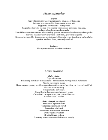 Menu azjatyckie Bufet: Krewetki marynowane w paście curry, smażone w temperze Sajgonki wegetariańskie faszerowane serem tofu Sajgonki z krewetkami i warzywami Sajgonki z Pierożki wonton wypełnione warzywami, gotowane na parze, podane w bambusowym koszyczku Pierożki wonton faszerowane wieprzowiną, podane na ostro w bambusowym koszyczku Pierożki faszerowane warzywami i imbirem, gotowane na parze Sakiewki z ciasta filo faszerowane szpinakiem Łódeczki z cykorii podane z małą sałatką z pędów bambusa i marynowanej rzodkwi Dodatki: Pieczywo rozmaite, masełka smakowe Menu włoskie Bufet ciepły: Zupa minestrone Bakłażany zapiekane z mozzarella i parmezanem Parmigiana di melanzane Risotto z owocami morza Makaron pene podany z grillowanym kurczakiem, pesto bazyliowym i orzeszkami Pini Pizza na różne sposoby Spaghetti alla carbonara Cannelloni z duszonym szpinakiem i serem Cannelloni z wieprzowiną, warzywami i serem Roladki z soli i łososia Bufet zimnych przekąsek: Bruschetta z pomidorami Tapenade z czarnych oliwek Focaccia z oliwkami Deski serów z orzechami i miodem Deski wędlin włoskich Oliwki różnego rodzaju Pomidory z serem mozzarella i świeżą bazylią Menu Bufet ciepły: Polędwiczka wieprzowa marynowana w świeżych ziołach, podana na paprykowo-pomidorowej salsie Pierś z kurczaka szpikowana wędzonym boczkiem i suszonymi pomidorami Łosoś parzony w białym winie, szpikowany krewetkami,podany na krążkach czerwonej cebuli Warzywa blanszowane Ziemniaczki opiekane w ziołach Bufet zimny: Mini tortilla z kurczakiem marynowanym w piwie, z warzywami Tatar ze świeżego i wędzonego łososia Bruschetta z pomidorami pachnąca czosnkiem i bazylią Śledzik marynowany w zaprawie korzennej Fileciki z soli i łososia w cytrynowej galaretce Tymbaliki z kurczaka Sałatka z grillowanym kurczakiem marynowanym w ziołach z sosem vinaigrette Sałatka „grecka” Deski wędlin i mięs pieczonych Dodatki: Pieczywo rozmaite Masełka smakowe Bufet kawowy (we wszystkich propozycjach) Kawa, Herbata, Woda z miętą i cytryną, Soki owocowe