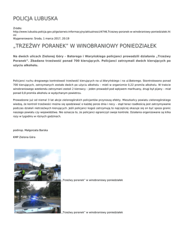 POLICJA LUBUSKA Źródło: http://www.lubuska.policja.gov.pl/go/serwis-informacyjny/aktualnosci/4746,Trzezwy-poranek-w-winobraniowy-poniedzialek.ht ml Wygenerowano: Środa, 1 marca 2017, 20:19 „TRZEŹWY PORANEK” W WINOBRANIOWY PONIEDZIAŁEK Na dwóch ulicach Zielonej Góry – Batorego i Waryńskiego policjanci prowadzili działania „Trzeźwy Poranek”. Zbadano trzeźwość ponad 700 kierujących. Policjanci zatrzymali dwóch kierujących po użyciu alkoholu. Policjanci ruchu drogowego kontrolowali trzeźwość kierujących na ul.Waryńskiego i na ul.Batorego. Skontrolowano ponad 700 kierujących, zatrzymanych zostało dwóch po użyciu alkoholu – mieli w organizmie 0,22 promila alkoholu. W trakcie winobraniowego weekendu zatrzymani zostali 2 kierowcy – jeden prowadził pod wpływem marihuany, drugi był pijany – miał ponad 0,8 promila alkoholu w wydychanym powietrzu. Prowadzone już od niemal 3 lat akcje zielonogórskich policjantów przynoszą efekty. Mieszkańcy powiatu zielonogórskiego wiedzą, że kontroli trzeźwości można się spodziewać o każdej porze dnia i nocy – stąd teraz rzadkością jest zatrzymywanie podczas działań nietrzeźwych kierujących. Jeśli policjanci kogoś zatrzymują to najczęściej okazuje się on być spoza granic naszego powiatu czy województwa. Nie oznacza to, że policjanci ograniczyli swoje kontrole. Działania organizowane są kilka razy w tygodniu w róznych godzinach. podinsp. Małgorzata Barska KMP Zielona Góra „Trzeźwy poranek” w winobraniowy poniedziałek „Trzeźwy poranek” w winobraniowy poniedziałek „Trzeźwy poranek” w winobraniowy poniedziałek „Trzeźwy poranek” w winobraniowy poniedziałek „Trzeźwy poranek” w winobraniowy poniedziałek „Trzeźwy poranek” w winobraniowy poniedziałek „Trzeźwy poranek” w winobraniowy poniedziałek „Trzeźwy poranek” w winobraniowy poniedziałek Ocena: 0/5 (0) Tweetnij