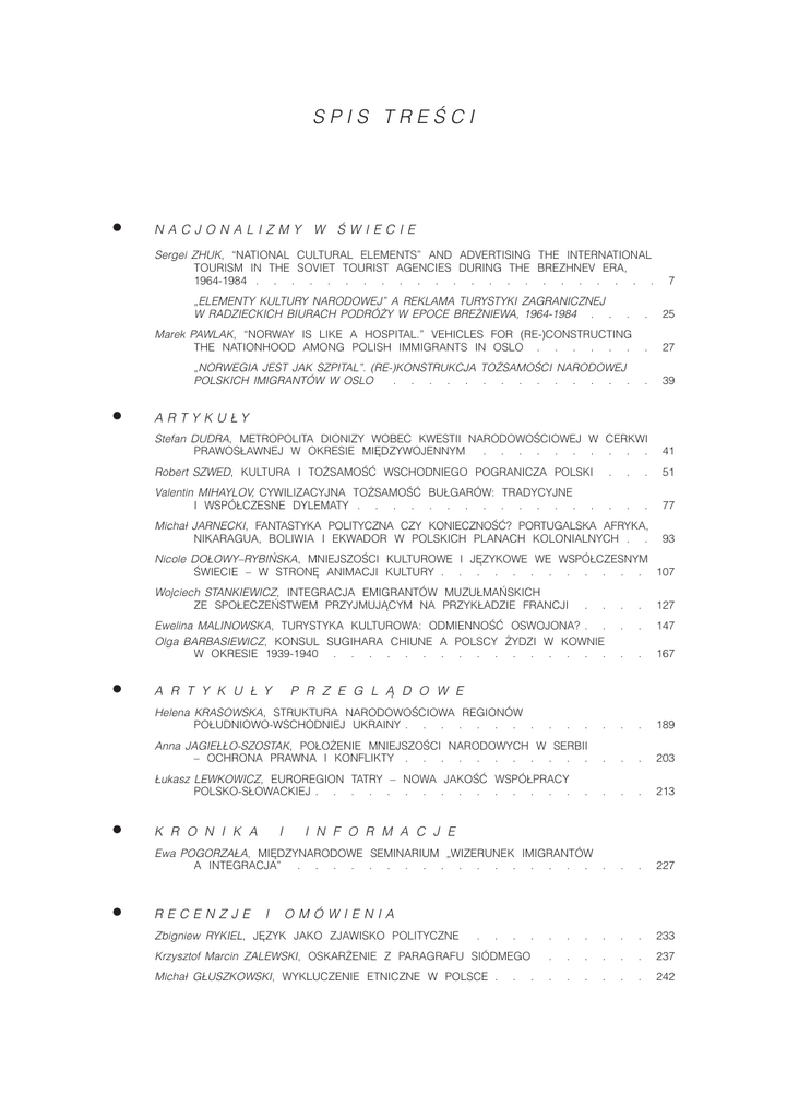 SPIS TRECI · · NACJONALIZMY W WIECIE Sergei ZHUK, NATIONAL CULTURAL ELEMENTS AND ADVERTISING THE INTERNATIONAL TOURISM IN THE SOVIET TOURIST AGENCIES DURING THE BREZHNEV ERA, 1964-1984 . . . . . . . . . . . . . . . . . . . . . . . 7 ELEMENTY KULTURY NARODOWEJ A REKLAMA TURYSTYKI ZAGRANICZNEJ W RADZIECKICH BIURACH PODRÓ¯Y W EPOCE BRE¯NIEWA, 1964-1984 . . . . 25 Marek PAWLAK, NORWAY IS LIKE A HOSPITAL. VEHICLES FOR (RE-)CONSTRUCTING THE NATIONHOOD AMONG POLISH IMMIGRANTS IN OSLO . . . . . . . 27 NORWEGIA JEST JAK SZPITAL. (RE-)KONSTRUKCJA TO¯SAMOCI NARODOWEJ POLSKICH IMIGRANTÓW W OSLO . . . . . . . . . . . . . . . 39 Stefan DUDRA, METROPOLITA DIONIZY WOBEC KWESTII NARODOWOCIOWEJ W CERKWI PRAWOS£AWNEJ W OKRESIE MIÊDZYWOJENNYM . . . . . . . . . . 41 Robert SZWED, KULTURA I TOŻSAMOŚĆ WSCHODNIEGO POGRANICZA POLSKI . . . 51 Valentin MIHAYLOV, CYWILIZACYJNA TO¯SAMOÆ BU£GARÓW: TRADYCYJNE I WSPÓŁCZESNE DYLEMATY . . . . . . . . . . . . . . . . 77 Micha³ JARNECKI, FANTASTYKA POLITYCZNA CZY KONIECZNOÆ? PORTUGALSKA AFRYKA, NIKARAGUA, BOLIWIA I EKWADOR W POLSKICH PLANACH KOLONIALNYCH . . 93 A R T Y K U £Y . Nicole DO£OWYRYBIÑSKA, MNIEJSZOŚCI KULTUROWE I JĘZYKOWE WE WSPÓŁCZESNYM ŚWIECIE – W STRONĘ ANIMACJI KULTURY . . . . . . . . . . . . 107 Wojciech STANKIEWICZ, INTEGRACJA EMIGRANTÓW MUZU£MAÑSKICH ZE SPO£ECZEÑSTWEM PRZYJMUJ¥CYM NA PRZYK£ADZIE FRANCJI · . . . 127 Ewelina MALINOWSKA, TURYSTYKA KULTUROWA: ODMIENNOÆ OSWOJONA? . . Olga BARBASIEWICZ, KONSUL SUGIHARA CHIUNE A POLSCY ¯YDZI W KOWNIE W OKRESIE 1939-1940 . . . . . . . . . . . . . . . . . . 147 . . 167 A R T Y K U £ Y P R Z E G L ¥ D O W E Helena KRASOWSKA, STRUKTURA NARODOWOCIOWA REGIONÓW PO£UDNIOWO-WSCHODNIEJ UKRAINY . . . . . . . . · · . . . . . 189 Anna JAGIE££O-SZOSTAK, POŁOŻENIE MNIEJSZOŚCI NARODOWYCH W SERBII – OCHRONA PRAWNA I KONFLIKTY . . . . . . . . . . . . . . 203 £ukasz LEWKOWICZ, EUROREGION TATRY NOWA JAKOÆ WSPÓ£PRACY POLSKO-S£OWACKIEJ . . . . . . . . . . . . . . . . . . 213 Ewa POGORZA£A, MIÊDZYNARODOWE SEMINARIUM WIZERUNEK IMIGRANTÓW A INTEGRACJA . . . . . . . . . . . . . . . . . . . . 227 233 K R O N I K A RECENZJE I I . . . I N F O R M A C J E OMÓWIENIA Zbigniew RYKIEL, JÊZYK JAKO ZJAWISKO POLITYCZNE . . . . . . . Krzysztof Marcin ZALEWSKI, OSKAR¯ENIE Z PARAGRAFU SIÓDMEGO . . . . . . . . . 237 Micha³ G£USZKOWSKI, WYKLUCZENIE ETNICZNE W POLSCE . . . . . . . 242 . . CONTENTS · · SPECIFIC N AT I O N A L I S M S Sergei ZHUK, NATIONAL CULTURAL ELEMENTS AND ADVERTISING THE INTERNATIONAL TOURISM IN THE SOVIET TOURIST AGENCIES DURING THE BREZHNEV ERA, 1964-1984 . . . . . . . . . . . . . . . . . . . . . . . 7 ELEMENTY KULTURY NARODOWEJ A REKLAMA TURYSTYKI ZAGRANICZNEJ W RADZIECKICH BIURACH PODRÓ¯Y W EPOCE BRE¯NIEWA, 1964-1984 . . . . 25 Marek PAWLAK, NORWAY IS LIKE A HOSPITAL. VEHICLES FOR (RE-)CONSTRUCTING THE NATIONHOOD AMONG POLISH IMMIGRANTS IN OSLO . . . . . . . 27 NORWEGIA JEST JAK SZPITAL. (RE-)KONSTRUKCJA TO¯SAMOCI NARODOWEJ POLSKICH IMIGRANTÓW W OSLO . . . . . . . . . . . . . . . . 39 ARTICLES Stefan DUDRA, METROPOLITAN DIONYSIUS ON THE NATIONALITY QUESTION IN THE ORTHODOX CHURCH IN INTERWAR POLAND . . . . . . . . . 41 Robert SZWED, CULTURE AND IDENTITY IN POLAND'S EASTERN BORDERLAND . . . 51 Valentin MIHAYLOV, THE CIVILISATIONAL IDENTITY OF THE BULGARIANS: TRADITIONAL AND CONTEMPORARY DILEMMAS . . . . . . . . . . . . . . . 77 Micha³ JARNECKI, POLITICAL FANTASY OR NECESSITY? POLISH COLONIAL PLANS IN PORTUGUESE AFRICA, NICARAGUA, BOLIVIA AND ECUADOR . . . . 93 . . Nicole DO£OWYRYBIÑSKA, CULTURAL AND LINGUISTIC MINORITIES IN THE MODERN WORLD TOWARDS THE CULTURAL ANIMATION . . . . . . . . . . 107 Wojciech STANKIEWICZ, INCORPORATING MUSLIM MIGRANTS IN THE WEST: THE FRENCH MODEL OF INTEGRATION . . . . . . . . . . . . . 127 Ewelina MALINOWSKA, CULTURAL TOURISM: OTHERNESS TAMED? . . . 147 . . . . Olga BARBASIEWICZ, CONSUL SUGIHARA CHIUNE AND THE POLISH JEWS IN KAUNAS, LITHUANIA IN 1939-1940 . . . . . . . . . . . . . . . . . . 167 · R E V I E W A R T I C L E S Helena KRASOWSKA, THE ETHNIC STRUCTURE OF THE TERRITORIES OF SOUTH-EASTERN UKRAINE . . . . . . . . . . . . . . 189 Anna JAGIE££O-SZOSTAK, THE POSITION OF NATIONAL MINORITIES IN SERBIA THEIR LEGAL PROTECTION AND CONFLICTS . . . . . . . . . . 203 £ukasz LEWKOWICZ, TATRA EUROREGION A NEW QUALITY IN THE POLISH-SLOVAK COOPERATION . . . . . . . . . . . . . . . . . . . . 213 · CHRONICLE · BOOK AND REVIEWS REPORTS . .
