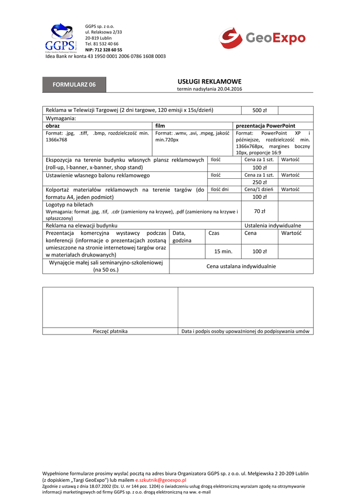 GGPS sp. z o.o. ul. Relaksowa 2/33 20-819 Lublin Tel. 81 532 40 66 NIP: 712 328 60 55 Idea Bank nr konta 43 1950 0001 2006 0786 1608 0003 USŁUGI REKLAMOWE FORMULARZ 06 termin nadsyłania 20.04.2016 Reklama w Telewizji Targowej (2 dni targowe, 120 emisji x 15s/dzień) Wymagania: obraz film Format: .jpg, .tiff, .bmp, rozdzielczość min. 1366x768 500 zł prezentacja PowerPoint Format: .wmv, .avi, .mpeg, jakość min.720px Format: PowerPoint XP i późniejsze, rozdzielczość min. 1366x768px, margines boczny 10px, proporcje 16:9 Cena za 1 szt. Wartość Ekspozycja na terenie budynku własnych plansz reklamowych (roll-up, l-banner, x-banner, shop stand) Ustawienie własnego balonu reklamowego Ilość Ilość Cena za 1 szt. Kolportaż materiałów reklamowych na terenie targów (do formatu A4, jeden podmiot) Logotyp na biletach Ilość dni Cena/1 dzień 100 zł Wartość 250 zł Wymagania: format .jpg, .tif, .cdr (zamieniony na krzywe), .pdf (zamieniony na krzywe i spłaszczony) Reklama na elewacji budynku Prezentacja komercyjna wystawcy podczas konferencji (informacje o prezentacjach zostaną umieszczone na stronie internetowej targów oraz w materiałach drukowanych) Wynajęcie małej sali seminaryjno-szkoleniowej (na 50 os.) Pieczęć płatnika Data, godzina Wartość 100 zł Czas 15 min. 70 zł Ustalenia indywidualne Cena Wartość 100 zł Cena ustalana indywidualnie Data i podpis osoby upoważnionej do podpisywania umów Wypełnione formularze prosimy wysłać pocztą na adres biura Organizatora GGPS sp. z o.o. ul. Mełgiewska 2 20-209 Lublin (z dopiskiem „Targi GeoExpo”) lub mailem [email protected] Zgodnie z ustawą z dnia 18.07.2002 (Dz. U. nr 144 poz. 1204) o świadczeniu usług drogą elektroniczną wyrażam zgodę na otrzymywanie informacji marketingowych od firmy GGPS sp. z o.o. drogą elektroniczną na ww. e-mail