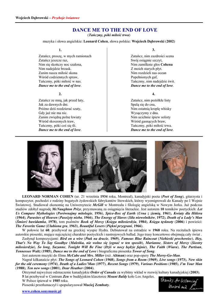 Wojciech Dąbrowski – Przeboje światowe DANCE ME TO THE END OF LOVE (Tańczmy, póki miłość trwa) muzyka i słowa angielskie: Leonard Cohen, słowa polskie: Wojciech Dąbrowski (2002) 1. Zatańcz, proszę, w mych ramionach Zatańcz jeszcze raz, Nim się skończy noc szalona, Nim nadejdzie brzask. Zanim nasza miłość skona Wśród codziennych spraw, Tańczmy, póki miłość w nas. Dance me to the end of love. 2. Zatańcz ze mną, jak przed laty, Jak za dawnych dni. Próżno dziś rozdzierać szaty, Gdy już nie ma nic. Zanim zwiędną polne kwiaty Wśród skoszonych traw, Tańczmy, póki coś się tli. Dance me to the end of love. 3. Zatańcz, nim zazdrości scena Swój osiągnie szczyt, Nim zamilknie głos Cohena Z moich starych płyt. Nim rozdzieli nas ocean Popełnionych gaf, Tańczmy, nim nadejdzie świt. Dance me to the end of love. 4. Zatańcz, nim pożółkłe listy Spalą się do cna, Nim ostatnią kroplę whisky Wysączymy z dna. Nim ucichnie śpiew solisty Wśród gasnących braw, Tańczmy, póki miłość trwa. Dance me to the end of love. LEONARD NORMAN COHEN (ur. 21 września 1934 roku, Montreal), kanadyjski poeta (Poet of Song), gitarzysta i kompozytor, pochodzi z rodziny bogatych żydowskich fabrykantów litewskich, którzy wyemigrowali do Kanady po I Wojnie Światowej. Studiował ekonomię na Uniwersytecie McGill w Montrealu i filologię angielską w Nowym Jorku. Już podczas studiów zdobył nagrodę McNaughton Prize, przyznawaną za osiągnięcia literackie. Jest autorem 10 tomików poetyckich: Let Us Compare Mythologies (Porównajmy mitologie, 1956), Spice-Box of Earth (Urna z ziemią, 1961), Kwiaty dla Hitlera (1964), Parasites of Heaven (Pasożyty nieba, 1966), The Energy of Slaves (Siła niewolników, 1972), Death of a Lady’s Man (Śmierć bawidamka, 1978), tom psalmów Book of Mercy (Księga miłosierdzia, 1984), Księga tęsknoty (2006) i powieści: The Favorite Game (Ulubiona gra, 1963), Beautiful Losers (Piękni przegrani, 1966). W połowie lat 60. przebywał na greckiej wyspie Hydra. Debiutował na estradzie w 1968 roku. Na recitalach śpiewa autorskie piosenki, mające najczęściej charakter poetyckich i nastrojowych ballad. Jego trasy koncertowe obejmują cały świat . Zasłynął kompozycjami: Bird on a wire (Ptak na drucie, 1969), Famous Blue Raincoat (Niebieski prochowiec), Hey, That’s No Way To Say Goodbye (Maleńka, nie wolno się żegnać w ten sposób), Marianne, Sisters of Mercy (Siostry miłosierdzia), So long, Suzanne, Tonight Will Be Fine (Dziś w nocy będzie fajnie), The Faith (Wiara), The Partisan, Tennessee Waltz (1985), Dance me to the end of Love i biograficzna piosenka Tower of Song. Jest autorem muzyki do filmu McCabe and Mrs. Miller (reż. Altman) oraz pop-opery The Merry-Go-Man. Nagrał kilkanaście płyt: The Songs of Leonard Cohen (1968), Songs from a Room (1969), Live songs (1973), New skin for the old ceremony (1974), Death of a Ladies’Man (1977), Recent Songs (1979), Various Positions (1985), I’m Your Man (1988), Ten new songs (2001), Dear Heather (2004). Otrzymał najwyższe odznaczenie kanadyjskie Order of Canada za wybitny wkład w rozwój kultury kanadyjskiej (2003). 5 lat przebywał w Centrum Zen w buddyjskim klasztorze Mount Baldy koło Los Angeles. W Polsce śpiewał w 1985 roku. Piosenki przetłumaczył i spopularyzował Maciej Zembaty. www.cohen.sonymusic.pl