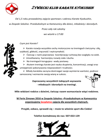 Żywiecki Klub Karate Kyokushin Od 1,5 roku prowadzimy zajęcia sportowe z zakresu Karate Kyokushin, w Zespole Szkolno- Przedszkolnym w Kamesznicy dla dzieci, młodzieży i dorosłych. Przez cały rok szkolny we wtorki o 17:00 Czym jest Karate? Karate rozwija wszystkie cechy motoryczne na treningach dwiczymy: siłę, szybkośd, gibkośd, zręcznośd i wytrzymałośd. Ćwicząc z nami poprawiasz koordynację ruchową bez względu na wiek. Umożliwiamy harmonijny rozwój ciała i ducha. Na treningach korygujesz wady postawy. Atutem treningu karate jest nauka skupienia, koncentracji, uwagi oraz umiejętnośd pokonywania niepowodzeo i trudności. Młody karateka zaczyna dostrzegad swoje wymierne wartości, podnosi samoocenę i wzmacnia swoją wiarę w sukces. Zapraszamy wszystkich lubiących wyzwania - młodszych i dorosłych na treningi. Mile widziani rodzice z dziedmi, dwicząc razem wzmacniacie więzi rodzinne. W Ferie Zimowe 2016 w Zespole Szkolno –Przedszkolnym w Kamesznicy organizujemy bezpłatne zajęcia dla wszystkich chętnych. Przyjdź, zobacz, sprawdź się – może to właśnie sport dla Ciebie! Telefon kontaktowy do nas: 507-022-129