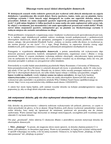 Dlaczego warto uczyć dzieci obowiązków domowych W dzisiejszych czasach wielu rodziców gotowych jest wydawać setki złotych miesięcznie na zajęcia dodatkowe i pozalekcyjne dla swoich dzieci. Kursy językowe, taniec, tenis, gra na pianinie, kursy szybkiego czytania i wiele innych zajęć dostępnych na rynku ma zapewnić dziecku sukces w przyszłości. Jednak czy sama znajomość języków naprawdę gwarantuje dobrą pracę i szczęśliwe życie? A jeśli mimo biegłości w kilku językach ta sama osoba nie umie zaplanować sobie pracy tak, by zdążyć z terminami, jest niesumienna i nie umie uporządkować przestrzeni wokół siebie? Wtedy nawet mimo znajomości języków, umiejętności gry na pianinie czy błyskawicznego czytania w żadnym miejscu nie zostanie zatrudniona na długo. Wiele problemów związanych z organizacją czasu i trudności wychowawczych spowodowanych jest tym, że w natłoku zajęć dodatkowych ambitni rodzice zwalniają swoich podopiecznych z podstawowych obowiązków domowych, takich jak sprzątanie, pomaganie w przygotowywaniu posiłków, wynoszenie śmieci, zakupy. Jak powiedziała Elizabeth Taylor: „Jedyne, co można zrobić dla dzieci, to wychować je; nie można przeżyć za nie życia”. Co z tego, Drogi Rodzicu, że zapewnisz dziecku szereg zajęć dodatkowych, jeśli zapomnisz o nauczeniu go codziennych umiejętności niezbędnych do życia. Pomaganie w wypełnianiu obowiązków domowych, a potem samodzielne ich wykonywanie daje dzieciom poczucie sprawstwa, kontroli, umiejętność planowania, organizacji czasu i dbania o swoją przestrzeń. Mimo iż czasem niechętnie wykonują niektóre obowiązki, zdecydowanie lepiej poświęcić czas na zachęcanie do ich wykonywania, niż w przyszłości wstydzić się za dorosłego, który nie wie, jak utrzymać porządek w pokoju czy przygotować sobie śniadanie. Potwierdziły to wyniki badań amerykańskiej psycholożki Marty Rossmann z University of Minnesota, która przeanalizowała losy 84 dzieci w czterech okresach ich życia: w przedszkolu, około 10. roku życia, gdy miały 15 lat i po 20. roku życia. Okazało się, że dzieci, które zaczęły pomagać rodzicom w wieku 3 lub 4 lat w obowiązkach domowych, nie tylko miały lepsze relacje z rodziną i przyjaciółmi, osiągały lepsze wyniki na studiach i miały większe szanse na sukces zawodowy, do tego były bardziej samowystarczalne, w porównaniu z tymi, które nie miały obowiązków domowych lub zaczęły je wykonywać jako nastolatki ( na podstawie artykułu Why Children Need Chores opublikowanego na stronie: http://www.wsj.com/articles/why-children-need-chores-1426262655). A zatem być może lepiej będzie, jeśli zamiast wysyłać dziecko na kolejne ponadprogramowe zajęcia, poprosimy je, aby co drugi dzień zmywało naczynia. Jak motywować dziecko, gdy nie chce wykonywać obowiązków domowych i dlaczego kara nie motywuje Gdy dziecko się przeciwstawia i odmawia rodzicom wykonywania ich poleceń, pierwsze, co często w złości przychodzi do głowy, to by je ukarać. Drogi Rodzicu, jeśli chcesz wychować samodzielne i pewne siebie dziecko, kary staraj się ograniczać do minimum, ponieważ nie prowadzą one do zmiany zachowania. Warto zamiast tego skorzystać ze strategii motywujących, szczególnie jeśli wcześniej często zdarzało Ci się karać dziecko. Oto pięć „przykazań”, które ułatwią Ci skuteczne dbanie o prawidłowy poziom motywacji dziecka do obowiązków domowych: 1. Mów „dziękuję”. To proste, ale magiczne słowo może sprawić, że dziecko chętniej pomoże Ci w domu, jeśli pokażesz, że doceniasz jego pracę. Warto tu też pamiętać, że lepiej jest wyrażać wdzięczność w sposób wskazujący na osobę, a nie na samą czynność. Oznacza to, że lepiej brzmi „dziękuję, że byłaś taka pomocna” niż „dziękuję za pomoc”. 2. Wyznaczaj terminy. Możesz sobie w tym pomóc, zawieszając w pokoju dziecka tablicę obowiązków, które powinno wykonać danego dnia lub tygodnia. 3. Spróbuj zamienić wykonywanie obowiązków w grę. Można to zrobić, określając kolejne „poziomy” prac domowych. Zacznij od drobnych obowiązków, a jeśli dziecko będzie je dobrze wykonywać, „pozwalaj” mu na coraz poważniejsze zadania. 4. Pozwól dziecku wybierać. Zaangażuj je w proces planowania i podziału obowiązków domowych. 5. Nie płać. Badania dowiodły, że dawanie dzieciom pieniędzy za wykonywanie prostych prac domowych sprawia, że w dłuższej perspektywie są one mniej zmotywowane do ich altruistycznego wykonywania (na podstawie M. Levine „Jak dobrze uczyć dzieci”, Dom Wydawniczy REBIS, Poznań 2013). Madeline Levine, autorka książki „Jak dobrze uczyć dzieci”, radzi nawet, aby nie zwalniać dzieci z domowych obowiązków w celu odrobienia pracy domowej. Przedkładanie obowiązków szkolnych nad domowe może sprawić, że dziecko nauczy się, że stopnie i osiągnięcia są ważniejsze od dbania o swoją przestrzeń i innych. Czego można wymagać od dzieci w różnym wieku? Dziecko w wieku 2-3 lat nie może być oczywiście obarczane obowiązkami jako takimi, ale nie warto protestować, gdy stara się naśladować dorosłych w obowiązkach i pozwalać mu na pomoc w wykonywanych przez nich czynnościach, takich jak: 1) wycieranie podłogi lub mebli, np. po rozlaniu napoju lub zabrudzeniu; 2) pomaganie przy ścieraniu kurzu z niskich mebli; Ważne: Maluchy w tym wieku chwalimy za wysiłek, nie za efekt! 3) pomaganie przy porządkowaniu zabawek (układanie na półkach, podnoszenie z podłogi, pakowanie do pudeł); 4) przenoszenie rzeczy do prania i wkładanie do pralki (bez uruchamiania jej, wsypywania detergentów); 5) pomaganie przy karmieniu domowych zwierząt (oczywiście tych niegroźnych i oswojonych); 6) sortowanie skarpetek (składanie w pary); 7) wyrzucanie papierków do kosza; 8) wybieranie ubrań przygotowanych przez rodzica (wybór ten ograniczamy do maksymalni