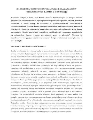 ZINTEGROWANE SYSTEMY INFORMATYCZNE DLA ZARZĄDCÓW NIERUCHOMOŚCI– BATALIA O INFORMACJĘ Niedawno odbyte w łodzi XIX Forum Domów Spółdzielczych, w którym miałem przyjemność uczestniczyć stało się bezpośrednim powodem napisania artykułu na temat informacji, a ściślej dostęp do informacji w przedsiębiorstwach zarządzających nieruchomościami. Podczas Forum dyskutowano właśnie nad zagadnieniami informacji jako jednej z funkcji wynikającej z obowiązków zarządców nieruchomości. Choć forum zgromadziło licznie przybyłych zarządców spółdzielczych poruszane zagadnienia są uniwersalne. Znamy wszyscy powiedzenie „czas to pieniądz”. Możemy je sparafrazować następująco: szybki i nowoczesny dostęp do informacji to nie tylko czas – ale i pieniądz! INFORMACJA WEWNĘTRNA I ZEWNETRZNA Batalia o informacje to w istocie walka o rynek nieruchomości, który dziś skupia kilkanaście tysięcy zarządców legitymujących się licencjami państwowymi i kilkadziesiąt, a może kilkaset tysięcy pracowników firm zarządzających. Coraz więcej spółdzielni mieszkaniowych stara się pozyskać do zarządzania nieruchomości z innych sektorów na przykład wspólnoty mieszkaniowe lub kamienice prywatne. Również zarządcy licencjonowani opierający swoją działalność na powierzonym zarządzie nieruchomości prywatnych lub wspólnotowych starają się pozyskać nieruchomości wyodrębnione z sektora spółdzielczego, które po przeprowadzeniu procesu ustanawiania własności odrębnych na mocy znowelizowanej ustawy o spółdzielniach mieszkaniowych decydują się na zmianę statusu prawnego – wybierając formę wspólnotową. Zarządcy prywatni coraz chętniej zarządzają także małymi spółdzielniami mieszkaniowymi, których w Polsce jest kilka tysięcy (mam na myśli spółdzielnie kilkudziesięcio - lub kilkuset mieszkaniowe. Jestem przekonany, że w przyszłości walka konkurencyjna doprowadzi do stawiania coraz większych wymagań zarządcom chcącym utrzymać się na tym trudnym rynku. Dostęp do informacji będzie decydującym warunkiem osiągnięcia sukcesu lub przyczyną poniesienia porażki. Częstotliwość zmian w polskim prawie mieszkaniowym i różnorodność przepisów dla poszczególnych sektorów własności lokali powoduje, że coraz trudniej jest zarządcy poruszać się w tym gąszczu prawnym. Pomóc może dobry system informatyczny, który powinien mieć „zaszyty” w sobie aktualny stan prawny poszczególnych rozwiązań ustawowych. Największe polskie firmy oferujące zintegrowane systemy wspomagające procesy zarządzania nieruchomościami, proponują także zgodność oferowanych systemów z aktualnym stanem prawnym. Dobry system informatyczny daje także możliwość zainteresowanym mieszkańcom dostępu do swoich indywidualnych kont księgowych za pośrednictwem internetu. ZARZADCA A MEDIA ELEKTRONICZNE Na wspomnianym XIX Forum Domów Spółdzielczych negatywnie zaskoczyło mnie, że tak wiele polskich dużych spółdzielni, reprezentowanych w Łodzi poprzez swoje zarządy lub rady nadzorcze zdawało się niedoceniać rewolucji w dziedzinie informacji jakiej jesteśmy świadkami i uczestnikami. W wielu wypowiedziach gloryfikowano znaczenie tradycyjnych prasowych przekazów informacji niedoceniając mediów najnowocześniejszych takich jak strony internetowe, portale internetowe czy dyskusyjne fora dla mieszkańców. Jeśli przejrzymy programy szkoleń dla zarządców również niewiele firm poświęca uwagę przygotowaniu zarządców do sprostania wyzwaniu jakie w dziedzinie informacji stawia nam współczesność. Moim zdaniem jest to ogromny błąd. Informatyka w jej najnowocześniejszych odmianach generuje zdolność do aktywnego konkurowania. Nie wolno zapominać, że prawdziwa konkurencja na rynku zarządzania zacznie się wtedy, kiedy tym rynkiem zainteresuje się konkurencja zagraniczna. Wejdzie ona na polski rynek nie tylko z potencjałem ekonomicznym ale także z potencjałem nowoczesnych technik zarządzania, wśród których informatyka i media elektroniczne są na najwyższym poziomie. Zanim to nastąpi, polscy zarządcy powinni rozważyć czy nie należy przygotować się do tej konkurencji również poprzez powiększanie swoich możliwości w dziedzinie nowoczesnej informacji. GENERACJA PO 50 – CE Częstym argumentem w dyskusji na tematy nowoczesnej informatyki i informacji jest teza, że mieszkańcy zarządzanych zasób to ludzie w starszym lub podeszłym wieku niezdolni do skonsumowania nowoczesnych form przekazu informacji. Nic bardziej błędnego! Tempo w jakim nasi rodacy w tym również generacja po 50-ce opanowali technologię telefonii komórkowej i bankowości elektronicznej wskazuje, że również techniki zarządzania z wykorzystaniem internetu opanują wszystkie generacje mieszkańców. Jednym z warunków tego procesu będzie zaangażowanie zarządców w popularyzację tych technik poprzez organizację własnych strony internetowych wykorzystanie interaktywnych portali przy pomocy których będą informować mieszkańców o najważniejszych dla nich sprawach wynikających z procesu zarządzania na przykład przesyłając w czasie rzeczywistym komunikaty o braku dopływu energii elektrycznej czy elektroniczne dokumenty rozliczenia zużycia wody itp. INFORMACJA ELEKTRONICZNA, A KOSZTY OBSŁUGI MIESZKAŃCÓW Wszyscy wiemy, że koszty wprowadzenie do procesów zarządzania zintegrowanych systemów informatycznych są stosunkowo duże. Jeśli rozbudujemy je jeszcze o elektroniczne kreowanie informacji wydaje się, że zasadniczo wzrosną. Wydaje się – bowiem dobre systemy mają już w swojej strukturze funkcjonalnej portale informatyczne, elektroniczny obieg dokumentów, interaktywną formę komunikacji z mieszkańcami. W zamian otrzymujemy zupełnie nową jakość pracy biura zarządcy nieruchomości. Dokładność otrzymanej informacji, szybkość przekazania informacji powoduje mniejszą częstotliwo