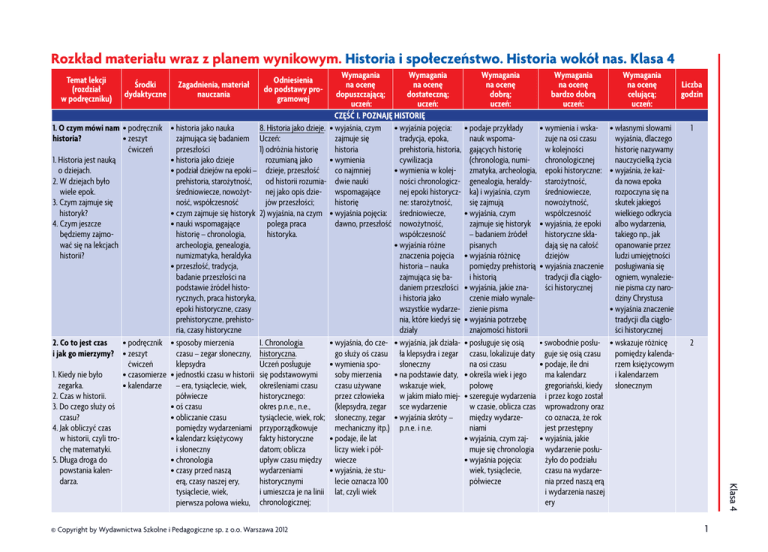 Rozkład materiału wraz z planem wynikowym. Historia i społeczeństwo. Historia wokół nas. Klasa 4 Temat lekcji (rozdział w podręczniku) Środki dydaktyczne 1. O czym mówi nam • podręcznik historia? • z eszyt ćwiczeń 1. H istoria jest nauką o dziejach. 2. W dziejach było wiele epok. 3. C zym zajmuje się historyk? 4. Czym jeszcze będziemy zajmować się na lekcjach historii? Zagadnienia, materiał nauczania 8. Historia jako dzieje. Uczeń: 1) odróżnia historię rozumianą jako dzieje, przeszłość od historii rozumianej jako opis dziejów przeszłości; 2) wyjaśnia, na czym polega praca historyka. I. Chronologia historyczna. Uczeń posługuje się podstawowymi określeniami czasu historycznego: okres p.n.e., n.e., tysiąclecie, wiek, rok; przyporządkowuje fakty historyczne datom; oblicza upływ czasu między wydarzeniami historycznymi i umieszcza je na linii chronologicznej; © Copyright by Wydawnictwa Szkolne i Pedagogiczne sp. z o.o. Warszawa 2012 Wymagania Wymagania na ocenę na ocenę dopuszczającą; dostateczną; uczeń: uczeń: CZĘŚĆ I. POZNAJĘ HISTORIĘ • wyjaśnia, czym • wyjaśnia pojęcia: zajmuje się tradycja, epoka, historia prehistoria, historia, • wymienia cywilizacja co najmniej • wymienia w kolejdwie nauki ności chronologiczwspomagające nej epoki historyczhistorię ne: starożytność, • wyjaśnia pojęcia: średniowiecze, dawno, przeszłość nowożytność, współczesność • wyjaśnia różne znaczenia pojęcia historia – nauka zajmująca się badaniem przeszłości i historia jako wszystkie wydarzenia, które kiedyś się działy • wyjaśnia, do cze- • wyjaśnia, jak działago służy oś czasu ła klepsydra i zegar • wymienia sposłoneczny soby mierzenia • na podstawie daty, czasu używane wskazuje wiek, przez człowieka w jakim miało miej(klepsydra, zegar sce wydarzenie słoneczny, zegar • wyjaśnia skróty – mechaniczny itp.) p.n.e. i n.e. • podaje, ile lat liczy wiek i półwiecze • wyjaśnia, że stulecie oznacza 100 lat, czyli wiek Wymagania na ocenę dobrą; uczeń: • podaje przykłady nauk wspomagających historię (chronologia, numizmatyka, archeologia, genealogia, heraldyka) i wyjaśnia, czym się zajmują • wyjaśnia, czym zajmuje się historyk – badaniem źródeł pisanych • wyjaśnia różnicę pomiędzy prehistorią i historią • wyjaśnia, jakie znaczenie miało wynalezienie pisma • wyjaśnia potrzebę znajomości historii • posługuje się osią czasu, lokalizuje daty na osi czasu • określa wiek i jego połowę • szereguje wydarzenia w czasie, oblicza czas między wydarzeniami • wyjaśnia, czym zajmuje się chronologia • wyjaśnia pojęcia: wiek, tysiąclecie, półwiecze Wymagania na ocenę bardzo dobrą uczeń: Wymagania na ocenę celującą; uczeń: • wymienia i wska- • własnymi słowami zuje na osi czasu wyjaśnia, dlaczego w kolejności historię nazywamy chronologicznej nauczycielką życia epoki historyczne: • wyjaśnia, że każstarożytność, da nowa epoka średniowiecze, rozpoczyna się na nowożytność, skutek jakiegoś współczesność wielkiego odkrycia • wyjaśnia, że epoki albo wydarzenia, historyczne skłatakiego np., jak dają się na całość opanowanie przez dziejów ludzi umiejętności • wyjaśnia znaczenie posługiwania się tradycji dla ciągło- ogniem, wynalezieści historycznej nie pisma czy narodziny Chrystusa • wyjaśnia znaczenie tradycji dla ciągłości historycznej • swobodnie posłu- • wskazuje różnicę guje się osią czasu pomiędzy kalenda• podaje, ile dni rzem księżycowym ma kalendarz i kalendarzem gregoriański, kiedy słonecznym i przez kogo został wprowadzony oraz co oznacza, że rok jest przestępny • wyjaśnia, jakie wydarzenie posłużyło do podziału czasu na wydarzenia przed naszą erą i wydarzenia naszej ery Liczba godzin 1 2 Klasa 4 • historia jako nauka zajmująca się badaniem przeszłości • historia jako dzieje • podział dziejów na epoki – prehistoria, starożytność, średniowiecze, nowożytność, współczesność • czym zajmuje się historyk • nauki wspomagające historię – chronologia, archeologia, genealogia, numizmatyka, heraldyka • przeszłość, tradycja, badanie przeszłości na podstawie źródeł historycznych, praca historyka, epoki historyczne, czasy prehistoryczne, prehistoria, czasy historyczne 2. Co to jest czas • podręcznik • sposoby mierzenia i jak go mierzymy? • zeszyt czasu – zegar słoneczny, ćwiczeń klepsydra 1. K iedy nie było • czasomierze • jednostki czasu w historii • kalendarze – era, tysiąclecie, wiek, zegarka. 2. Czas w historii. półwiecze 3. Do czego służy oś • oś czasu czasu? • obliczanie czasu 4. Jak obliczyć czas pomiędzy wydarzeniami w historii, czyli tro• kalendarz księżycowy chę matematyki. i słoneczny 5. Długa droga do • chronologia powstania kalen• czasy przed naszą darza. erą, czasy naszej ery, tysiąclecie, wiek, pierwsza połowa wieku, Odniesienia do podstawy pro gramowej 1 Środki dydaktyczne 3. Źródła historycz • podręcznik ne opowiadają nam • z eszyt ćwiczeń o przeszłości • źródła 1. B ez źródła ani rusz. historyczne, np. kronika 2. C o to jest źródło szkoły historyczne? 3. Jakie znamy źródła historyczne? 4. Jak chronimy bezcenne źródła historyczne? 5. R óżnorodne przekazy o życiu ludzi – dawniej i dziś. Zagadnienia, materiał nauczania Odniesienia do podstawy pro gramowej druga połowa wieku dostrzega związki teraźniejszości z przeszłością • źródło historyczne – ślad działalności człowieka pozostawiony w przeszłości • rodzaje źródeł historycznych: źródła materialne i niematerialne, pisane i niepisane • pojęcia: źródło historyczne, zabytek, archeologia, eksponat, muzeum, skansen • źródła pisane: listy, kroniki, roczniki, pamiętniki • znaczenie archeologii w odkrywaniu i badaniu materialnych źródeł 