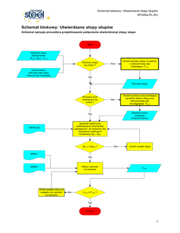 Schemat blokowy: Utwierdzane stopy słupów SF045a-PL-EU Schemat blokowy: Utwierdzane stopy słupów Schemat opisuje procedurę projektowania połączenia utwierdzonej stopy słupa Start Wymiary słupa obliczeniowe Nc,Ed, Mc,Ed, Vc,Ed Wymiary stopy są znane ? Klasa betonu Gatunek stali stopy Klasa śruby kotwiącej Nie Określ wymiary stopy w oparciu o obliczeniową siłę ściskającą Fc,Ed Tak Wymiary stopy Wymiary śrub kotwiących są znane ? Nie Określ wymiary śruby kotwiącej i grubość blachy stopy przy obliczeniowej sile rozciągającej Ft,Ed Średnica śruby kotwiącej Grubość blachy Tak Sprawdź węzeł przy oddziaływaniu momentów zginających i sił osiowych dla wszystkich moŜliwych kombinacji MEd i NEd SN043 §5 Mc,Ed ≤ Mj,Rd ? Nie Zmień projekt stopy SN021 Tak Oblicz nośność na ścinanie SN037 Zmień projekt stopy ze względu na nośność na ścinanie Nie Fv,Rd Vc,Ed ≤ Fv,Rd ? Tak Koniec 1 Schemat blokowy: Utwierdzane stopy słupów SF045a-PL-EU Wyznaczenie grubości blachy stopy ze względu na siłę ściskającą Start Siły obliczeniowe w stopie słupa Klasa betonu SN043 § 4.3 SN043 § 4.3 Oblicz maksymalną siłę ściskającą oddziałującą na fundament Fc,Ed Określ wymiary blachy stopy Wymiary tp, hp, bp Powrót 2 Schemat blokowy: Utwierdzane stopy słupów SF045a-PL-EU Wyznaczanie wymiarów śruby kotwiącej Start Siły obliczeniowe w stopie słupa Szczegóły stopy Klasa betonu Klasa śruby SN043 § 4.3 SN043 § 4.5.1, § 4.5.2 Oblicz maksymalną siłę rozciągającą przekazywaną na fundament Ft,Ed Określ wymiary śrub kotwiących i potrzebną grubość blachy stopy Średnica śruby Grubość blachy stopy tp Powrót 3 Schemat blokowy: Utwierdzane stopy słupów SF045a-PL-EU Quality Record RESOURCE Title Schemat blokowy: Utwierdzane stopy słupów Reference(s) ORIGINAL DOCUMENT Name Company Date Created by Ivor Ryan CTICM 07/02/2006 Technical content checked by Alain Bureau CTICM 07/02/2006 1. UK G W Owens SCI 23/5/06 2. France A Bureau CTICM 23/5/06 3. Sweden B Uppfeldt SBI 23/5/06 4. Germany C Müller RWTH 23/5/06 5. Spain J Chica Labein 23/5/06 G W Owens SCI 21/8/06 Editorial content checked by Technical content endorsed by the following STEEL Partners: Resource approved by Technical Coordinator 4 Schemat blokowy: Utwierdzane stopy słupów SF045a-PL-EU Wrapper Information Title Schemat blokowy: Utwierdzane stopy słupów Series Description Schemat opisuje procedurę projektowania połączenia utwierdzonej stopy słupa Access Level Expertise Practitioner Identifiers Filename SF045a-PL-EU.vsd Resource Type Schemat blokowy Viewpoint Engineer Subject Application Area(s) Budynki jednokondygnacyjne Dates Created Date 2004-03-15 Last Modified Date 04/04/2006 Checked Date 04/04/2006 Format Category Valid From Valid To Languages Contacts Polski Author Ivor Ryan, CTICM Checked By Alain Bureau, CTICM Approved By Editor Last Modified By Keywords Zakotwienia słupów See Also Eurocode Reference EN 1993-1-8, EN 1992 Worked Examples Commentary Discussion Other Coverage National Applicability EU Special Instructions 5