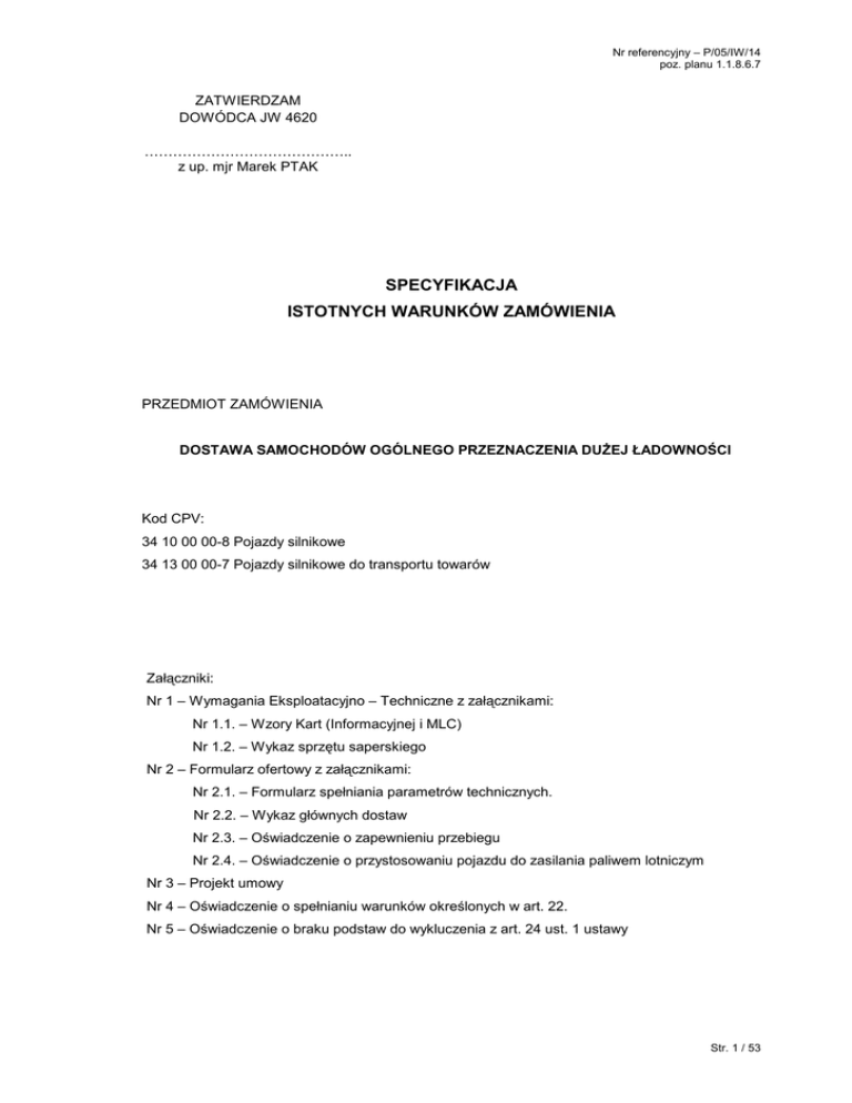 Nr referencyjny – P/05/IW/14 poz. planu 1.1.8.6.7 ZATWIERDZAM DOWÓDCA JW 4620 …………………………………….. z up. mjr Marek PTAK SPECYFIKACJA ISTOTNYCH WARUNKÓW ZAMÓWIENIA PRZEDMIOT ZAMÓWIENIA DOSTAWA SAMOCHODÓW OGÓLNEGO PRZEZNACZENIA DUśEJ ŁADOWNOŚCI Kod CPV: 34 10 00 00-8 Pojazdy silnikowe 34 13 00 00-7 Pojazdy silnikowe do transportu towarów Załączniki: Nr 1 – Wymagania Eksploatacyjno – Techniczne z załącznikami: Nr 1.1. – Wzory Kart (Informacyjnej i MLC) Nr 1.2. – Wykaz sprzętu saperskiego Nr 2 – Formularz ofertowy z załącznikami: Nr 2.1. – Formularz spełniania parametrów technicznych. Nr 2.2. – Wykaz głównych dostaw Nr 2.3. – Oświadczenie o zapewnieniu przebiegu Nr 2.4. – Oświadczenie o przystosowaniu pojazdu do zasilania paliwem lotniczym Nr 3 – Projekt umowy Nr 4 – Oświadczenie o spełnianiu warunków określonych w art. 22. Nr 5 – Oświadczenie o braku podstaw do wykluczenia z art. 24 ust. 1 ustawy Str. 1 / 53 Nr referencyjny – P/05/IW/14 poz. planu 1.1.8.6.7 1. Specyfikacja Istotnych Warunków Zamówienia została sporządzona zgodnie z ustawą z dnia 29 stycznia 2004 roku Prawo zamówień publicznych (tekst jedn. Dz. U. z 2013 r. poz. 907 z późn. zm.) i uregulowaniami prawnymi wydanymi na jej podstawie oraz innymi aktami prawnymi. 2. Zamawiający jest jednostką budŜetową i nie jest płatnikiem podatku VAT UE w rozumieniu przepisów ustawy z dnia 11 marca 2004 r. o podatku od towarów i usług (Dz. U. Nr 54, poz. 535 z późn. zm.). 3. Ilekroć w treści występuje słowo „Ustawa”, Zamawiający przywołuje ustawę Prawo zamówień publicznych. 4. Ilekroć w treści występuje słowo „SIWZ” Zamawiający przywołuje niniejszą Specyfikację Istotnych Warunków Zamówienia. I NAZWA ORAZ ADRES ZAMAWIAJĄCEGO JEDNOSTKA WOJSKOWA 4620 UL. OKÓLNA 37 87–100 TORUŃ Faks +48 56 653 36 60 strona internetowa: www.12wog.pl NIP: 956-22-88-838; REGON: 340901725 II TRYB UDZIELENIA ZAMÓWIENIA Zamawiający zaprasza do składania ofert w ramach postępowania prowadzonego w trybie przetargu nieograniczonego, o wartości zamówienia przekraczającej kwoty określone w przepisach wydanych na podstawie art. 11 ust. 8 Ustawy. III OPIS PRZEDMIOTU ZAMÓWIENIA 1. Przedmiotem zamówienia jest dostawa samochodów ogólnego przeznaczenia duŜej ładowności (w dalszej części SIWZ zamiennie uŜyto określenia „pojazd”), w ilości: 1.1. w roku 2014 – 40 szt., 1.2. w roku 2015 – 15 szt., 1.3. w roku 2016 – 20 szt., zgodnych z wymaganiami określonymi w wymaganiach eksploatacyjno-technicznych (WE-T) – załącznik nr 1 do SIWZ, który stanowi jej integralną część. UŜyte w WE-T słowa „winien”, „powinien”, „powinny” itp. oznaczają wymagania, które muszą być spełnione obligatoryjnie. 2. Zamawiający zgodnie z zapisem art. 34 ust. 5 ustawy Prawo zamówień publicznych przewiduje moŜliwość zastosowania prawa opcji w następującym zakresie: 2.1. Zamawiający określił w pkt 1 ilości pojazdów, jakie wybrany Wykonawca ma bezwarunkowo dostarczyć w ramach niniejszego postępowania („podstawowy zakres zamówienia”). 2.2. JeŜeli w trakcie realizacji zamówienia okaŜe się, iŜ Zamawiający posiada środki finansowe oraz potrzebę zamówienia większej ilości pojazdów w stosunku do przewidzianych w podstawowym zakresie zamówienia, Zamawiający pozostawia sobie moŜliwość skorzystania z prawa opcji i zamówienia dodatkowych pojazdów, zgodnych z WE-T (załącznik nr 1) i zawartą umową, za które Wykonawcy będzie przysługiwało odrębne wynagrodzenie. W przypadku zamówienia dodatkowej ilości pojazdów rozliczenie będzie następowało na podstawie cen jednostkowych ujętych w ofercie wybranego Wykonawcy i zawartej umowie. Zamówienie wynikające z prawa opcji nie przekroczy w poszczególnych latach 40% podstawowego zakresu zamówienia w danym roku (tj. 16 szt. pojazdów w roku 2014, 6 szt. pojazdów w roku 2015 oraz 8 szt. pojazdów w roku 2016). Str. 2 / 53 Nr referencyjny – P/05/IW/14 poz. planu 1.1.8.6.7 2.3. Zamawiający zastrzega, iŜ część zamówienia określona jako „prawo opcji” jest uprawnieniem, a nie zobowiązaniem Zamawiającego. Realizacja opcji moŜe, ale nie musi nastąpić, w zaleŜności od zapotrzebowania Zamawiającego i na skutek jego dyspozycji w tym zakresie. Brak realizacji zamówienia w tym zakresie nie będzie rodzić Ŝadnych roszczeń ze strony Wykonawcy w stosunku do Zamawiającego. 3. Zakres czynności Wykonawcy w ramach wykonania przedmiotu zamówienia: 3.1. Zarejestrowanie i dostarczenie pojazdów do siedziby Zamawiającego; 3.2. Przeszkolenie UŜytkowników z obsługi i uŜytkowania przedmiotowych pojazdów; 3.3. Dostarczenie do Szefostwa SłuŜby Czołgowo-Samochodowej Inspektoratu Wsparcia SZ dokumentacji, o której mowa w rozdziale I pkt 2 WE-T; 3.4. Wraz z kaŜdym pojazdem Wykonawca przekaŜe wyposaŜenie dodatkowe określone w rozdziale IX WE-T oraz dokumentację eksploatacyjną, o której mowa w rozdziale XIV WE-T. 4. Rozpoczęcie realizacji umowy w latach kolejnych, tj. 2015 i 2016, nastąpi po pisemnym potwierdzeniu przez Zamawiającego posiadania środków finansowych, w terminie do 31 grudnia roku poprzedzającego (pod warunkiem, Ŝe w planie finansowym na rok następny zostaną przydzielone środki zapewniające realizację zadania stanowiącego przedmiot umowy). 5. W przypadku nie przyznania środków finansowych na realizację zadania stanowiącego przedmiot umowy w kolejnym roku lub ograniczenie wysokości tych środków, realizacja umowy i jej zakres na kaŜdy następny rok ustalana będzie w formie pisemnego aneksu do wysokości środków określonych w zmienionym planie finansowym. 6. W razie braku potwierdzenia posiadania planu finansowego na kolejne lata lub jego zmniejszenia w stosunku do planowanej realizacji umowy (dotyczy lat 2015-2016), Wykonawcy nie przysługują jakiekolwiek roszczenia z tego tytułu od Zamawiającego. 