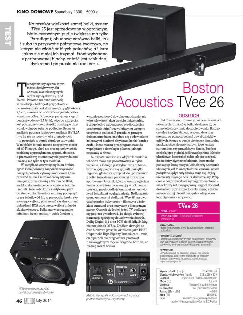 KINO DOMOWE Soundbary 1300 – 5000 zł TEST Na przekór wielkości samej belki, system TVee 26 jest sprzedawany w ogromnym, biało-czerwonym pudle (większe ma tylko Paradigm); obudowa zarówno belki, jak i suba to przyzwoite półmatowe tworzywo, na którym nie widać odbitych paluchów, a i kurz jakby się mniej ich trzymał. Front wykonano z perforowanej blachy, całość jest schludna, dyskretna i po prostu nie rani oczu. T o najmniejszy system w tym teście, dedykowany dla odbiorników telewizyjnych o przekątnej ekranu już od 26 cali. Pozwala na dużą swobodę w instalacji – belka jest przygotowana do zawieszania pod ekranem (przy głębokości 7,5 cm, niewiele od ściany odstaje) lub postawienia na półce. Subwoofer przyjmuje sygnał bezprzewodowo (2,4 GHz), więc do szczęścia jest potrzebne tylko gniazdko zasilające i kawałek wolnego kąta na podłodze. Belka jest zasilana poprzez laptopowy zasilacz 18V/2,0A i – o ile nie wyłączymy jej z premedytacją – to pozostaje w stanie ciągłego czuwania. W miejskim terenie mocno nasyconym sieciami Wi-Fi mogą, choć nie muszą, pojawiać się problemy z przesyłaniem sygnału do suba, a przewodowej alternatywy nie przewidziano (zresztą nie tylko w tym modelu). W komplecie otrzymujemy kilka drobiazgów, które powinny zaspokoić większość naszych potrzeb: cyfrowy światłowód 1,5 m, przewód audio 1 m zakończony wtykami mini-jack, przejściówkę z 3,5 mm na RCA, szablon do nawiercenia otworów w ścianie i malutki (wielkości karty kredytowej) pilot do sterowania. Telewizor możemy podłączyć przez światłowód lub w przypadku braku stosownego wyjścia, posiłkować się klasycznymi gniazdami RCA albo wręcz wyjść z gniazda słuchawkowego. Belka ma więc rozsądne minimum trzech gniazd – optyk (można tu Boston Acoustics TVee 26 w sumie podłączyć dowolne urządzenie, nie tylko telewizor) i dwa wejścia uniwersalne, z czego jedno wzbogacono o trójpozycyjny przełącznik „trim” pozwalający na wstępne ustawienie czułości. Z przodu, w prawym dolnym narożniku, znajdują się podświetlane kolorowymi diodami dotykowe ikonki (bardzo czułe), które można przeprogramować do współpracy z dowolnym pilotem, jakiego używamy w domu. Subwoofer ma własny włącznik zasilania (chociaż może być pozostawiany w trybie uśpienia, z którego jest wybudzany automatycznie, gdy pojawia się sygnał), pokrętło regulacji głośności i przycisk do „parowania” z belką (urządzenie przychodzi fabrycznie sparowane). Głośnik 6,5-cala wraz z wyjściem tunelu bas-refleks promieniują w dół. Forma prostego prostopadłościanu z lekko nachylonymi ściankami wygląda nieźle. Nóżki zakończono gumowymi stożkami. TVee 26 ma dwa przełączalne tryby pracy – filmowy z dźwiękiem surround oraz muzyczny z klasycznym stereo. Oczywiście lepiej, jeżeli TV podłączymy poprzez światłowód, bo dzięki cyfrowej transmisji zyskujemy dekodowanie dźwięku Dolby Digital 5.1 oraz PCM do 96 kHz/24 bity; nie ma jednak DTS-u. Źródłem dźwięku są dwa 5-calowe głośniki, określane jako HHRT (Hyperbolic High Rigidity Transducer) – mnie on hiperboli nie przypomina, prostokąt z zaokrąglonymi rogami wygląda bardziej na bieżnię wokół boiska. ODSŁUCH Od razu można zauważyć, że pomimo swoich skromnych rozmiarów, belka deklasuje to, co same telewizory mają do zaoferowania. Bardzo czytelne i spójne dialogi, a scena dwa razy szersza, za pomocą pewnej dawki dźwięków odbitych, tworzą w sumie efektowny i naturalny przekaz, choć nie nazywałbym tego jeszcze surroundem czy prawdziwym kinem. Bas jest zaskakująco głęboki, jeśli uwzględnimy lekkość plastikowej konstrukcji suba, ale na przejściu do średnicy słychać osłabienie, które trochę podkopuje bazę muzyki. Jednak przy ścieżkach filmowych jest to akceptowalne, czasami nawet pożądane, gdyż cały dźwięk staje się lżejszy (mimo siły niskiego basu) i klarowniejszy. Połączenie bezprzewodowe wymaga komentarza – nie w każdy kąt mojego pokoju sygnał docierał, deklarowany przez producenta zasięg sześciu metrów raczej nie jest osiągalny, ale połowa tego dystansu – na pewno. CENA: 1500 ZŁ TVee 26 DYSTRYBUTOR: horn distribution www.horn.pl Wykonanie Prosta forma wtapia się w tło, funkcjonalne, skromne i schludne. funkcjonalność Przełączanie pomiędzy trybem muzycznym i filmowym, uczy się sygnałów z innych pilotów, bezprzewodowy subwoofer, ale o ograniczonym zasięgu transmisji. brzmienie Czytelne dialogi na szerokiej scenie, bas mocny, a nawet niski, lecz trochę odsunięty od średnicy. Bardziej filmowe niż muzyczne, a do kina akcji najlepsze w tej cenie. W kinie może się przydać nawet najmniejszy subwoofer. 46 luty 2014 Mało tu złączy, ale w 90 procentach instalacji podtelewizorowych – wystarczy. Wymiary belki [mm]: 83 x 800 x 74 Wymiary subwoofera [mm]: 238 x 266 x 279 Głośniki 2 x 5” (51 x 127mm)/woofer 6,5” Masa [kg]: 2,1 + 3 Wejścia: Toslink/2 x audio 3,5 mm Subwoofer: tak (bezprzewodowy) Pasmo [Hz – kHz] 40–20 Moc [W] 150 RMS Inne wieszak zintegrowany/Toslink/ audio 3,5 mm/przejściówka na RCA/pilot www.audio.com.pl
