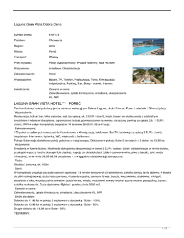 Laguna Gran Vista Dobra Cena Symbol oferty: 610/178 Państwo: Chorwacja Region: Istria Miasto: Poreč Transport: Własny Profil wyjazdu: Pobyt wypoczynkowy, Wyjazd rodzinny, Nad morzem Wyżywienie: śniadanie, Obiadokolacje Zakwaterowanie: Hotel Wyposażenie: Basen, TV, Telefon, Restauracja, Tenis, Klimatyzacja świadczenia: Zawarte w cenie: indywidualna, Parking, Bar, Sklep - market, Internet Zakwaterowanie, opłata klimatyczna, śniadania, ubezpieczenie KL, NW. LAGUNA GRAN VISTA HOTEL*** - POREĆ Ten komfortowy hotel położony jest w centrum wakacyjnym Zelena Laguna, około 5 km od Porec i zaledwie 100 m od plaży. Wyposażenie: Restauracja, koktail bar, kilka salonów, sejf (za opłatą, ok. 2 EUR / dzień), kiosk, basen ze słodką wodą z oddzielnym brodzikiem i leżakami (bezpłatne, ograniczona liczba), pomieszczenie na rowery, strzeżony parking za opłatą (ok. 1 EUR / dzień), WiFi w całym kompleksie bezpłatne. W terminie 28.05-01.09 animacje. Zakwaterowanie: 170 pokoi urządzonych nowocześnie i komfortowo z klimatyzacją, telefonem, Sat-TV, lodówką (za opłatą 3 EUR / dzień), bezpłatnym Internetem, łązienką, WC, większość z balkonem. Pokoje Suite mają dodatkowo pokój gościnny z małą kanapą. Obłożenie w pokoju Suite 2 dorosłych + 2 dzieci do 13,99 lat. Wyżywienie: Śniadania w formie bufetu. Możliwość dokupienia obiadokolacji w cenie 2 EUR / osobę / dzień: obiadokolacja w formie bufetu, przekąski w porze lunchu (kanapki lub ciastka), napoje do obiadokolacji (białe i czerwone wino, piwo z beczki, soki, woda mineralna), w terminie 29.05-08.09 dodatkowo 1 x w tygodniu obiadokolacja tematyczna. Plaża: Skalista i żwirowa, ok. 100m Sport: W kompleksie znajduje się duże centrum sportowe: 18 kortów tenisowych (3 oświetlone), szkółka tenisa, tenis stołowy, 4 bioska do piłki nożnej (trawa), duża hala sportowa, 4 sale do squsha, centrum fitness, boccia, koszykówka, siatkówka, minigolf, strzelanie z łuku, wypożyczalnia rowerów, jazda konna, wiosła, motorówki, rowery wodne, sporty wodne, parasailing, banan, szkółka nurkowania. Duża dyskoteka -Byblos“: powierzchnia 5000 m2. Zawarte w cenie: Zakwaterowanie, opłata klimatyczna, śniadania, ubezpieczenie KL, NW. Zniżki dla dzieci: Dziecko do 11,99 lat w pokoju 2 osobowym z dostawką i Suite - 100%. Dziecko do 13,99 lat w pokoju 2 osobowym z dostawką i Suite - 50%. Drugie dziecko do 13,99 lat w Suite - 50%. TERMINY: 1/2 od: 2017-05-27 do: 2017-06-03 (8 dni), miejsca: zamów cena od: 1090 PLN = 263 EUR od: 2017-06-03 do: 2017-06-10 (8 dni), miejsca: zamów cena od: 1177 PLN = 284 EUR od: 2017-06-10 do: 2017-06-17 (8 dni), miejsca: zamów cena od: 1322 PLN = 319 EUR od: 2017-06-17 do: 2017-06-24 (8 dni), miejsca: zamów cena od: 1264 PLN = 305 EUR od: 2017-06-24 do: 2017-07-01 (8 dni), miejsca: zamów cena od: 1641 PLN = 396 EUR od: 2017-07-01 do: 2017-07-08 (8 dni), miejsca: zamów cena od: 1641 PLN = 396 EUR od: 2017-07-08 do: 2017-07-15 (8 dni), miejsca: zamów cena od: 1641 PLN = 396 EUR od: 2017-07-15 do: 2017-07-22 (8 dni), miejsca: zamów cena od: 1641 PLN = 396 EUR od: 2017-07-22 do: 2017-07-29 (8 dni), miejsca: zamów cena od: 1873 PLN = 452 EUR od: 2017-07-29 do: 2017-08-05 (8 dni), miejsca: zamów cena od: 1873 PLN = 452 EUR od: 2017-08-05 do: 2017-08-12 (8 dni), miejsca: zamów cena od: 1873 PLN = 452 EUR od: 2017-08-12 do: 2017-08-19 (8 dni), miejsca: zamów cena od: 1815 PLN = 438 EUR od: 2017-08-19 do: 2017-08-26 (8 dni), miejsca: zamów cena od: 1699 PLN = 410 EUR od: 2017-08-26 do: 2017-09-02 (8 dni), miejsca: zamów cena od: 1641 PLN = 396 EUR od: 2017-09-02 do: 2017-09-09 (8 dni), miejsca: zamów cena od: 1264 PLN = 305 EUR od: 2017-09-09 do: 2017-09-16 (8 dni), miejsca: zamów cena od: 1090 PLN = 263 EUR od: 2017-09-16 do: 2017-09-23 (8 dni), miejsca: zamów cena od: 1090 PLN = 263 EUR CENNIK: Długość pobytu: 8 dni 8 dni 8 dni 8 dni 8 dni 8 dni 8 dni 8 dni Grupa cenowa: F A E B H C D G 2.5 2.5 2.5 2.5 2.5 2.5 2.5 11 11 11 11 11 11 11 (-) (-) (-) (-) (-) (-) (-) 252 385 273 399 308 294 427 Ubezpieczenie (obligatoryjne) (*) Turystyczny Fundusz Gwarancyjny 2.5 (*) Ubezpieczenie KL, NW 11 Pobyt w obiekcie (do wyboru) (*) Pok. 2 os. standardowo dla osób: 2 (-) Rodzaj osoby (do wyboru) (*) Osoba dorosła 441 Waluta: EUR Aktualne ceny z systemu S.A.R.T. (-) - cena usługi, podatku kalkulowana przy osobie lub gratis (*) - kwota wliczona w cenę standardową 2/2