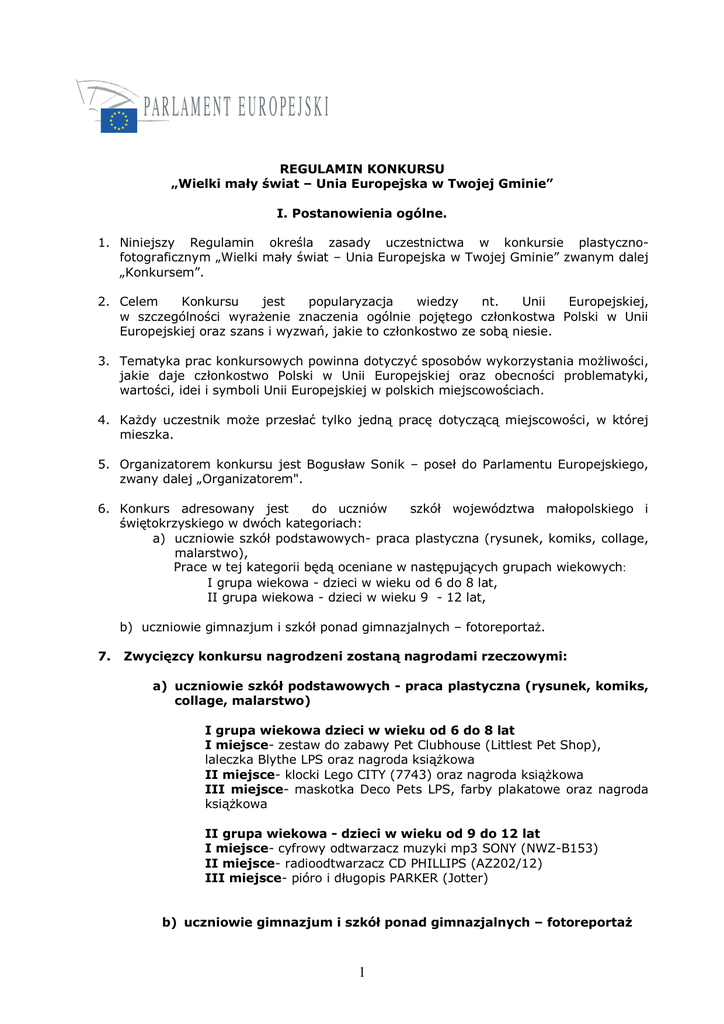 REGULAMIN KONKURSU „Wielki mały świat – Unia Europejska w Twojej Gminie” I. Postanowienia ogólne. 1. Niniejszy Regulamin określa zasady uczestnictwa w konkursie plastycznofotograficznym „Wielki mały świat – Unia Europejska w Twojej Gminie” zwanym dalej „Konkursem”. 2. Celem Konkursu jest popularyzacja wiedzy nt. Unii Europejskiej, w szczególności wyrażenie znaczenia ogólnie pojętego członkostwa Polski w Unii Europejskiej oraz szans i wyzwań, jakie to członkostwo ze sobą niesie. 3. Tematyka prac konkursowych powinna dotyczyć sposobów wykorzystania możliwości, jakie daje członkostwo Polski w Unii Europejskiej oraz obecności problematyki, wartości, idei i symboli Unii Europejskiej w polskich miejscowościach. 4. Każdy uczestnik może przesłać tylko jedną pracę dotyczącą miejscowości, w której mieszka. 5. Organizatorem konkursu jest Bogusław Sonik – poseł do Parlamentu Europejskiego, zwany dalej „Organizatorem". 6. Konkurs adresowany jest do uczniów szkół województwa małopolskiego i świętokrzyskiego w dwóch kategoriach: a) uczniowie szkół podstawowych- praca plastyczna (rysunek, komiks, collage, malarstwo), Prace w tej kategorii będą oceniane w następujących grupach wiekowych: I grupa wiekowa - dzieci w wieku od 6 do 8 lat, II grupa wiekowa - dzieci w wieku 9 - 12 lat, b) uczniowie gimnazjum i szkół ponad gimnazjalnych – fotoreportaż. 7. Zwycięzcy konkursu nagrodzeni zostaną nagrodami rzeczowymi: a) uczniowie szkół podstawowych - praca plastyczna (rysunek, komiks, collage, malarstwo) I grupa wiekowa dzieci w wieku od 6 do 8 lat I miejsce- zestaw do zabawy Pet Clubhouse (Littlest Pet Shop), laleczka Blythe LPS oraz nagroda książkowa II miejsce- klocki Lego CITY (7743) oraz nagroda książkowa III miejsce- maskotka Deco Pets LPS, farby plakatowe oraz nagroda książkowa II grupa wiekowa - dzieci w wieku od 9 do 12 lat I miejsce- cyfrowy odtwarzacz muzyki mp3 SONY (NWZ-B153) II miejsce- radioodtwarzacz CD PHILLIPS (AZ202/12) III miejsce- pióro i długopis PARKER (Jotter) b) uczniowie gimnazjum i szkół ponad gimnazjalnych – fotoreportaż 1 I miejsce- mini wieża JVC UX-G120 II miejsce- cyfrowy aparat fotograficzny NIKON COOLPIX L22 III miejsce- pióro i długopis PARKER (Jotter) Zwycięskie w Brukseli. prace zostaną zaprezentowane w Parlamencie Europejskim II. Uczestnictwo w Konkursie. 1. Warunkiem udziału w Konkursie jest przesłanie przez autora, zwanego dalej „Uczestnikiem”, pracy konkursowej wraz z prawidłowo wypełnioną „Deklaracją Uczestnictwa”. 2. Deklaracja Uczestnictwa jest prawidłowo wypełniona wówczas, gdy zawiera następujące dane: - tytuł pracy, - imię i nazwisko autora, - wiek autora, - adres prywatny, - telefon kontaktowy, - nazwę i adres szkoły, - ewentualnie dodatkowo imię i nazwisko nauczyciela lub instruktora oraz nazwę placówki, jeżeli praca konkursowa została wykonana pod jego nadzorem. 3. Deklaracja Uczestnictwa powinna być podpisana przez Uczestnika, a w przypadku gdy Uczestnik jest osobą niepełnoletnią Deklaracja Uczestnictwa powinna zawierać podpis opiekuna prawnego Uczestnika (podpis opiekuna prawnego na Deklaracji Uczestnictwa jest równoznaczny z wyrażeniem zgody na udział Uczestnika w konkursie oraz akceptacją Regulaminu Konkursu). 4. W Konkursie nie będą uwzględniane zgłoszenia, które: a) zostały przesłane po terminie określonym w niniejszym Regulaminie, b) nie zawierają czytelnie i kompletnie wypełnionej Deklaracji Uczestnictwa, c) zawierają Deklarację Uczestnictwa, do której dołączono więcej niż jedną pracę lub gdy Deklaracja Uczestnictwa została złożona przez tego samego Uczestnika więcej niż jeden raz, d) zawierają zniszczone lub niekompletne prace, e) nie zawierają oryginału pracy, f) zawierają pracę niebędącą autorstwa Uczestnika lub pracę do której Uczestnikowi nie przysługują pełne prawa autorskie. 5. Prace konkursowe należy składać lub przesyłać pocztą pod następujący adres: Biuro Posła do Parlamentu Europejskiego Bogusława Sonika; 31-002 Kraków, ul. Kanonicza 12/1, Tel. +48 12 290 69 34, Fax. +48 12 292 02 74. 6. Termin składania prac konkursowych upływa 30 maja 2011 roku o godz. 17.00 (decyduje data wpływu pracy konkursowej). III. Zasady Konkursu. 1. Uczestnik w ramach Konkursu może wykonać tylko jedną pracę plastyczną lub jeden fotoreportaż. 2. Uczestnik musi wykonać pracę samodzielnie. 2 3. Praca plastyczna może zostać wykonana dowolną techniką. 4. Pracę plastyczne należy wykonać w formacie nie większym niż A3. 5. Prace plastyczne trójwymiarowe nie będą podlegały ocenie. 6. Fotoreportaż powinien składać się z 10 fotografii wraz z komentarzem, nie przekraczającymi 200 znaków pod każdą fotografią. Fotoreportaż należy dostarczyć w formie wdrukowanej, a dodatkowo fotografie na nośniku elektronicznym. 7. Uczestnik przystępuje do Konkursu w momencie wysłania lub przekazania Organizatorowi pracy plastycznej lub fotoreportażu wraz z Deklaracją Uczestnictwa. 8. W Konkursie będą brały udział wyłącznie prace spełniające założenia regulaminowe. Prace nie spełniające wymagań nie będą oceniane. 9. Przesłane na konkurs prace nie będą zwracane. 11.Organizator zastrzega sobie prawo przerwania lub odwołania Konkursu. IV. Zasady przyznawania nagród w Konkursie. 1. Prace konkursowe zostaną ocenione przez jury Konkursu, złożone z: posła do Parlamentu Europejskiego Bogusława Sonika oraz przedstawicieli instytucji kulturalnych, na podstawie następujących kryteriów: - zgodność pracy z tematyką, o której mowa w Rozdziale 1, pkt.3 Regulaminu, - inwencja i pomysłowość prezentacji tematyki, - ogólne wrażenia estetyczne. 2. Wyniki konkursu ogłoszone zostaną w dniu 15.06.2011r. na stronie internetowej www.boguslawsonik.pl. 3. Organizator zastrzega sobie prawo odwołania Konkursu bez przyznawania nagród, w przypadku zgłoszenia się mniej ni